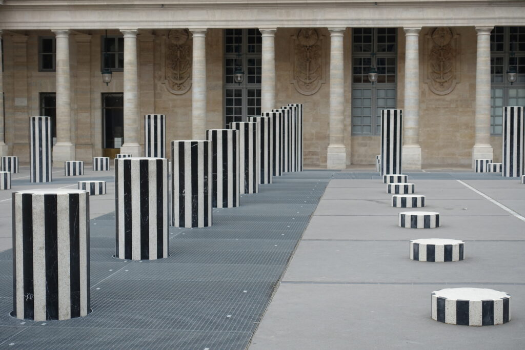 Stars incontestées des réseaux sociaux, les fameux Deux Plateaux de Daniel Buren (1986) furent très décriés lors de leur installation dans la cour du Palais-Royal. Et c’est sous un nom plus simple qu’ils ont acquis la célébrité : les “colonnes de Buren”. Non loin d’elles dans la cour d’honneur, le promeneur est aussi invité à contempler les Sphérades de Pol Bury (1985).