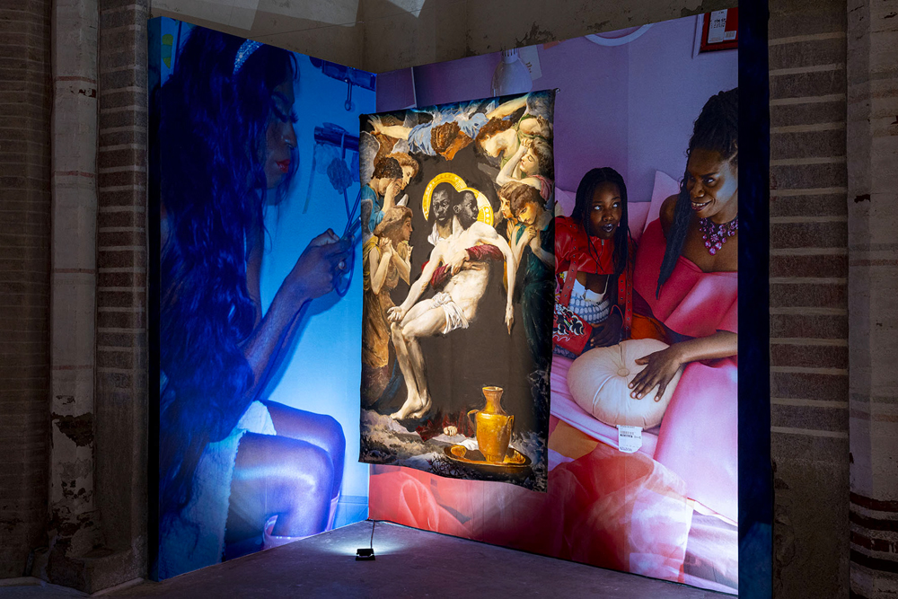 Il revisite des motifs récurrents de l’histoire de l’art en remplaçant ses personnages principaux par son propre visage. Réhabilitant ainsi les figures noires, longtemps oubliées par cette dernière… Dans son interprétation de la figure de la Pietà, exposée à la chapelle des Cordeliers, le visage de Roméo Mivekannin se cerne d’un halo doré, étreignant par ses bras un corps mourant. Mais malgré la tragédie représentée, c’est le regard du peintre qui continue de nous hanter, semblant fixer le spectateur pour l’éternité.