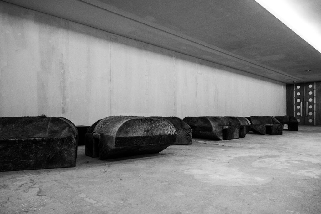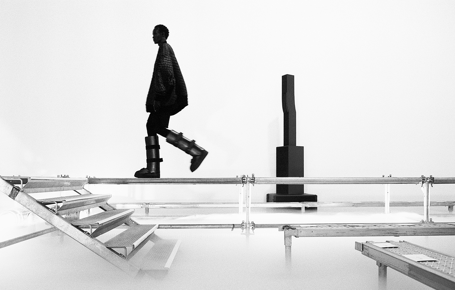 “Sur la table de chevet de Rick Owens, on trouve le livre Bunker Archéologie de Paul Virilio, un recueil des blockhaus de la côte Atlantique de France”, nous souffle Alexandre Samson. Cet intérêt du créateur pour ces édifices militaires en béton armé qui ont proliféré lors des deux guerres mondiales a tout à voir avec son obsession plus globale pour un style architectural et une esthétique qui ont marqué les années 50 à 70 : le brutalisme. Grand admirateur de Marcel Breuer et Le Corbusier, Rick Owens partage leur goût pour les volumes massifs, la symétrie, la géométrie et la répétition des formes, l’absence d’ornementation et le matériau industriel laissé à l’état brut – particulièrement le béton et son gris caractéristique.