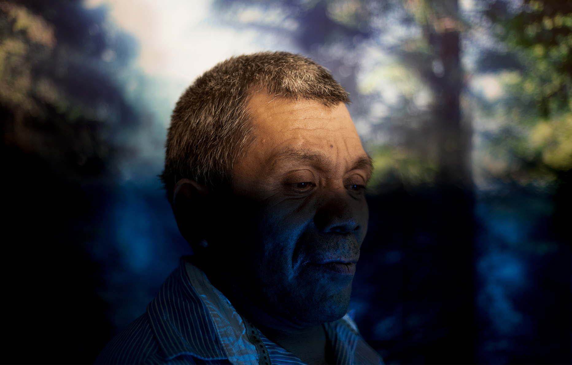Contrairement à, ou plutôt, en complément de ce parcours initiatique au cœur d’un machisme agressif et invétéré, son Landscapes for the Attempt considère les hommes non seulement comme perpétrateurs, mais aussi comme victimes d’une violence auto-infligée, née d’une culture où la vulnérabilité émotionnelle, assimilée à une marque de faiblesse, est taboue et, à ce titre, refoulée. Que peuvent y faire les images, si tant est qu’elles aient un quelconque pouvoir ? La lumière aux teintes bleutées et le cadre sylvestre que l’on distingue en arrière-plan de ces photographies, mises en scène, s’inspirent directement des dispositifs de prévention du suicide que certains réseaux de transports publics déploient un peu partout dans le monde.