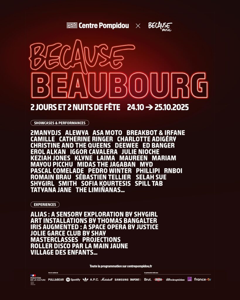 Intitulé Because Beaubourg (car le label Because y a célébré ses 20 ans), le festival a pris la forme d’un passage de relais, transformant une fermeture en grande ouverture artistique. Les murs vibraient de sons, de couleurs et de corps en mouvement, dans un ultime hommage à l’indiscipline créative qui a fait l’identité du lieu depuis son ouverture en 1977. Au programme : concerts, nuits clubbing, installations artistiques, projections de films, conférences, performances et même ateliers pour enfants.