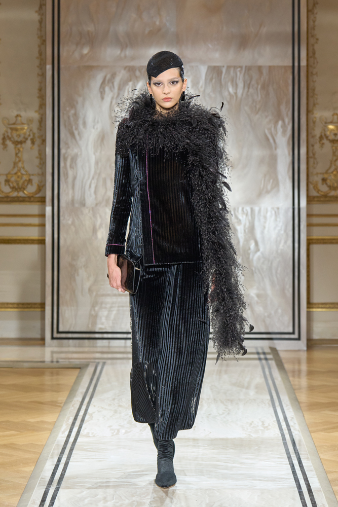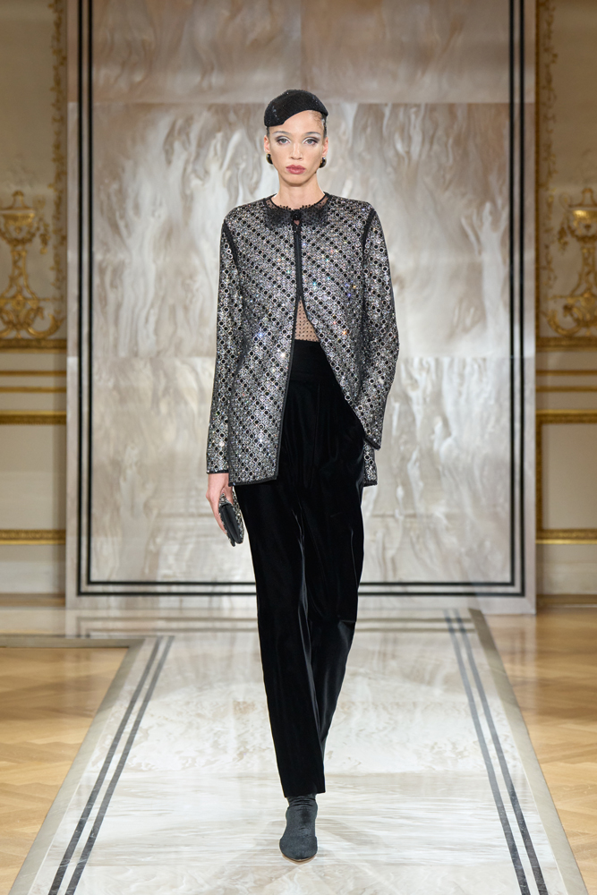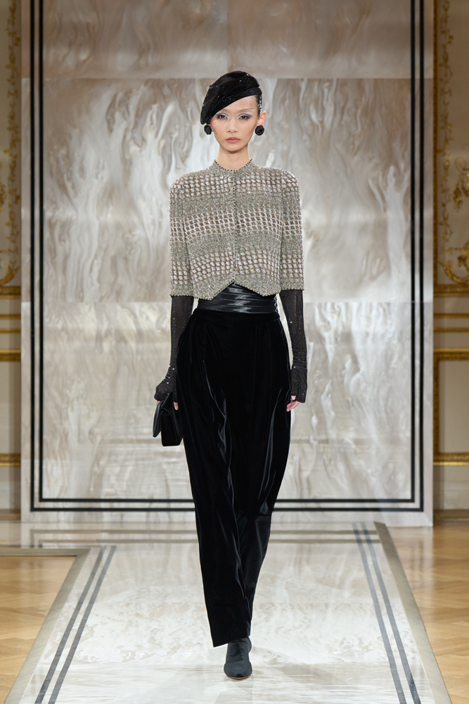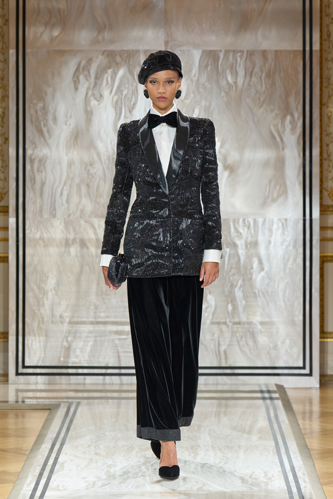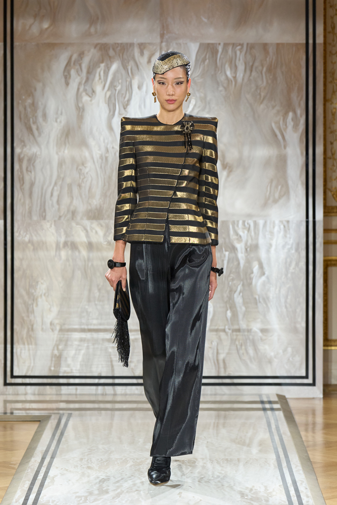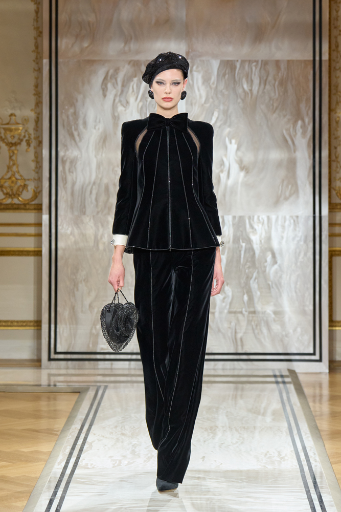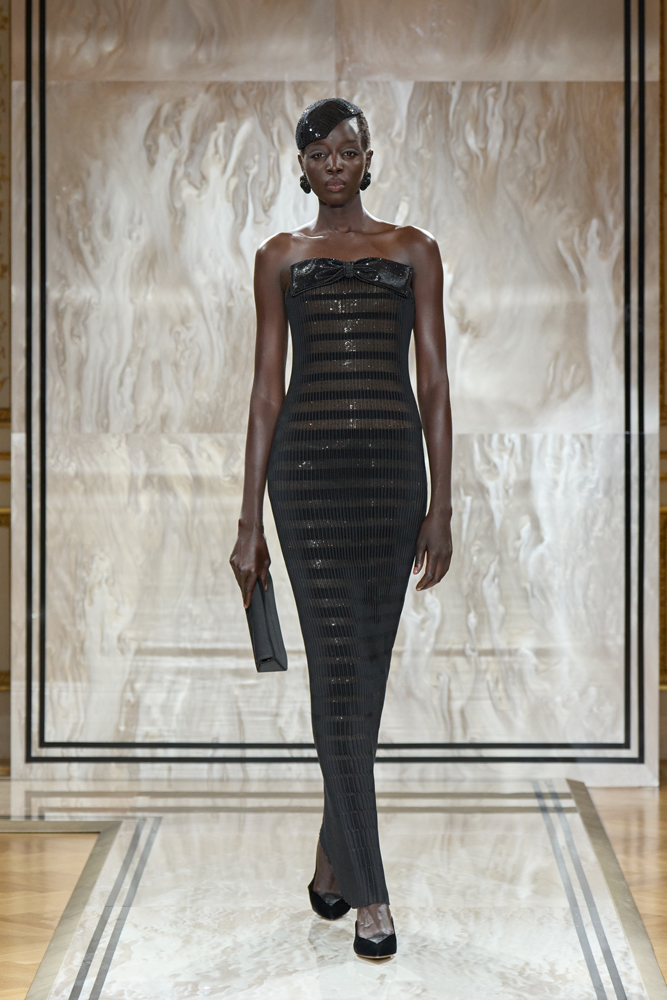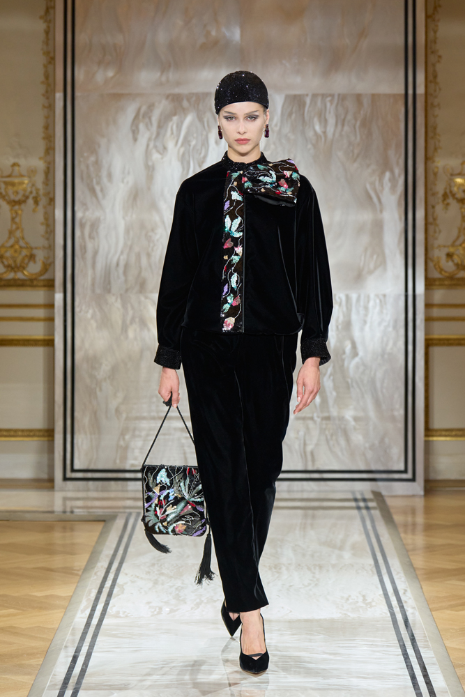 As is often the case with Giorgio Armani, the interplay between masculine and feminine infuses the collection. Draped bows, imposing cuff jewellery, fitted trousers, bow ties, and strict jackets are counterbalanced by long dresses. The result is a contemporary, elegant, almost cinematic silhouette in the way it inhabits the walls of this stunning building.