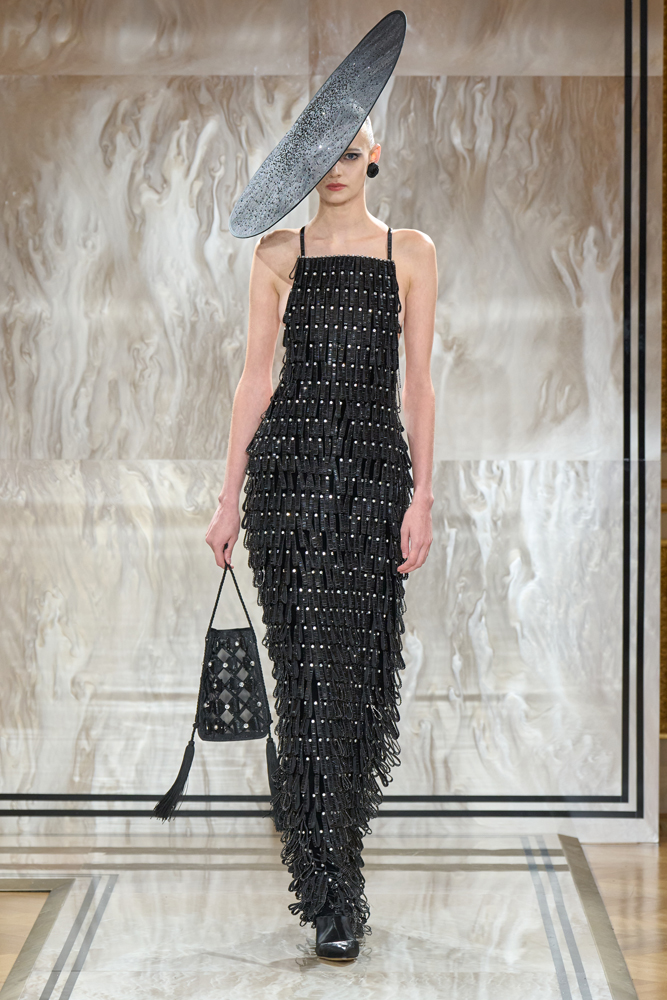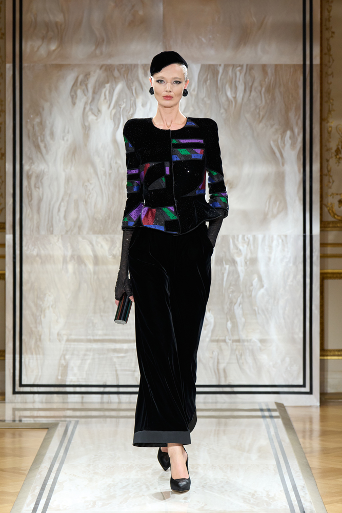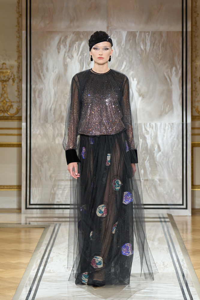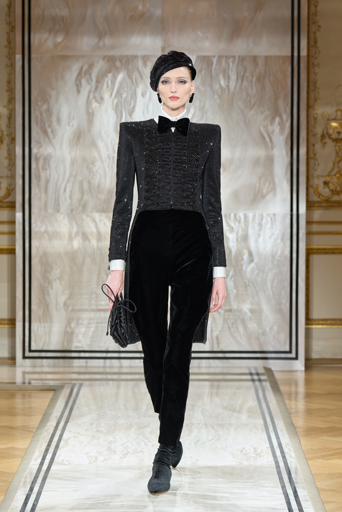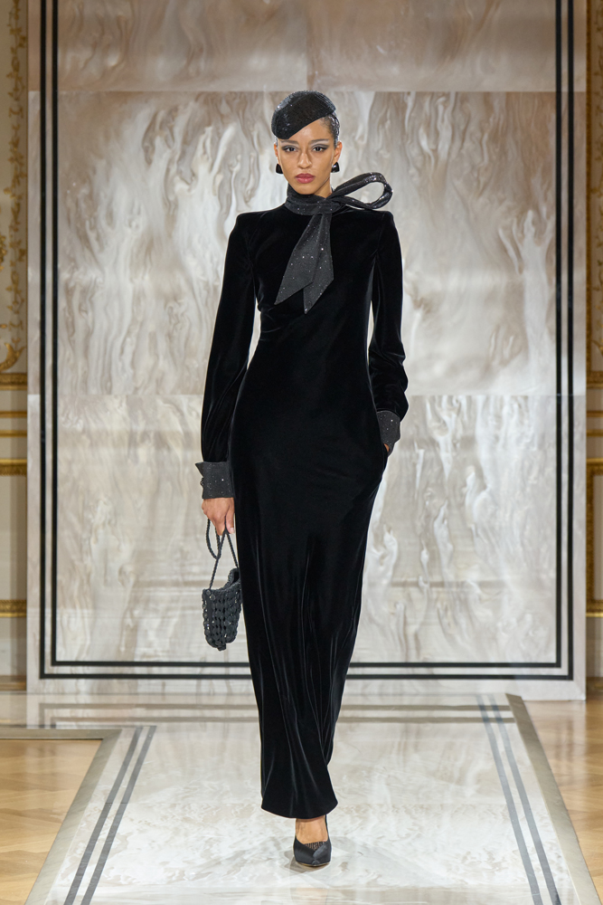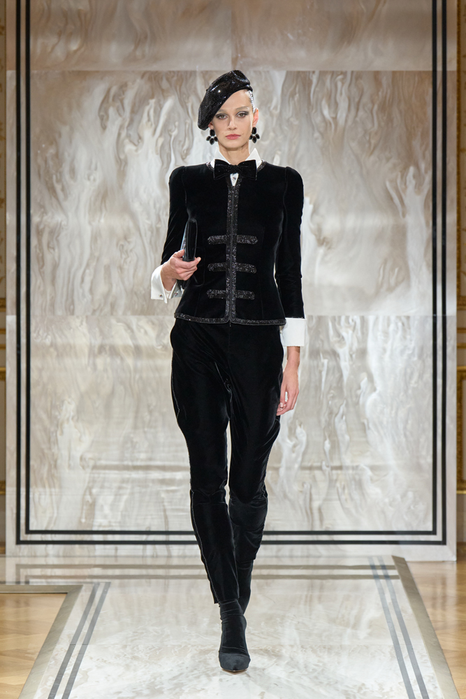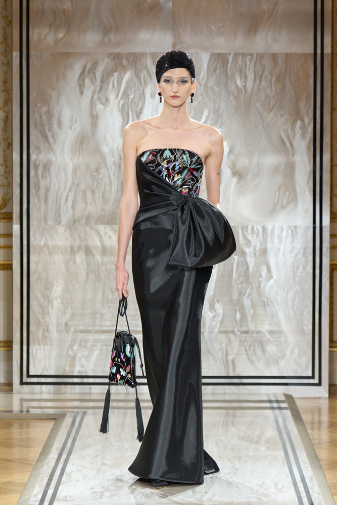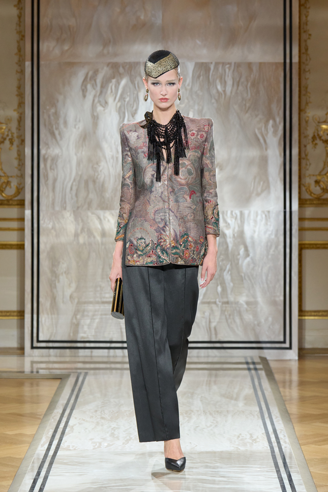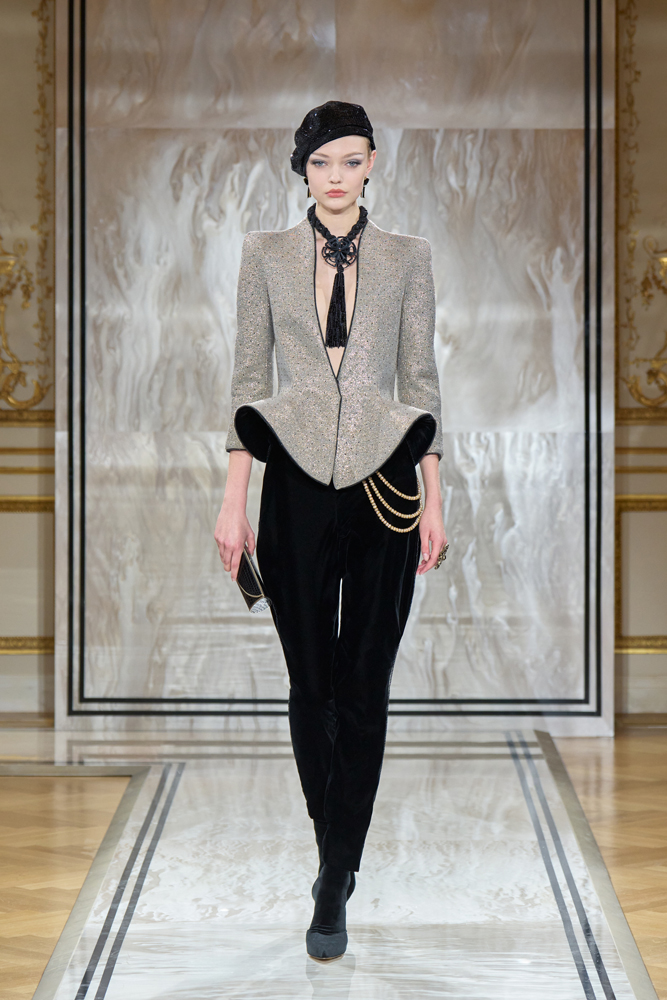 As is often the case with Giorgio Armani, the interplay between masculine and feminine infuses the collection. Draped bows, imposing cuff jewellery, fitted trousers, bow ties, and strict jackets are counterbalanced by long dresses. The result is a contemporary, elegant, almost cinematic silhouette in the way it inhabits the walls of this stunning building.