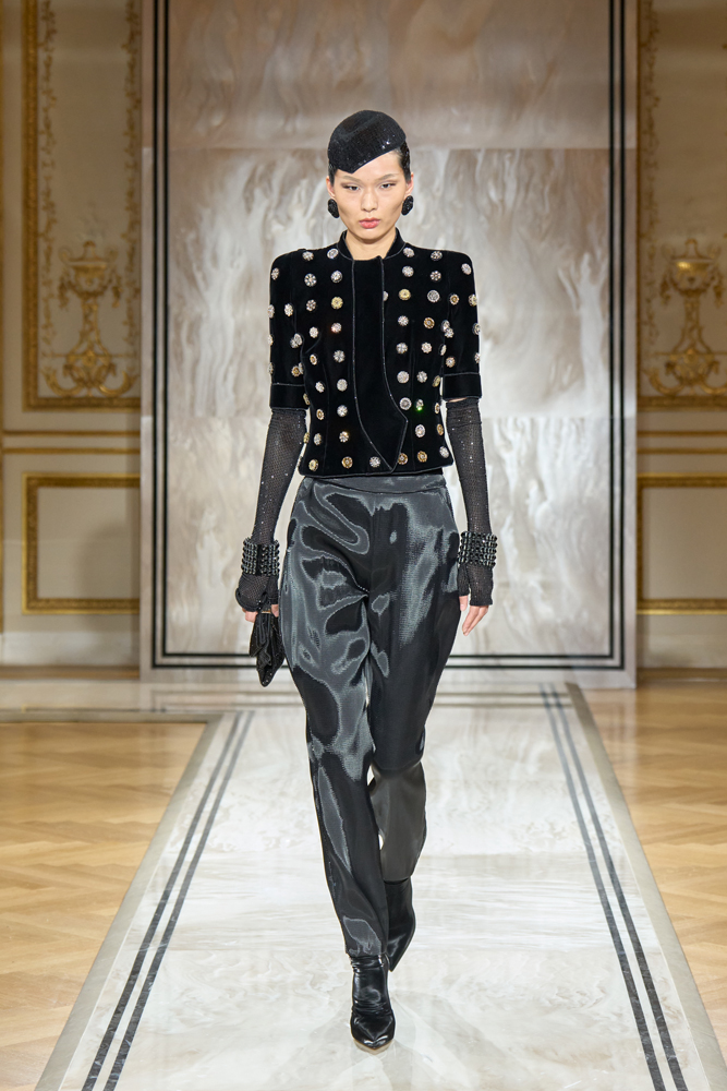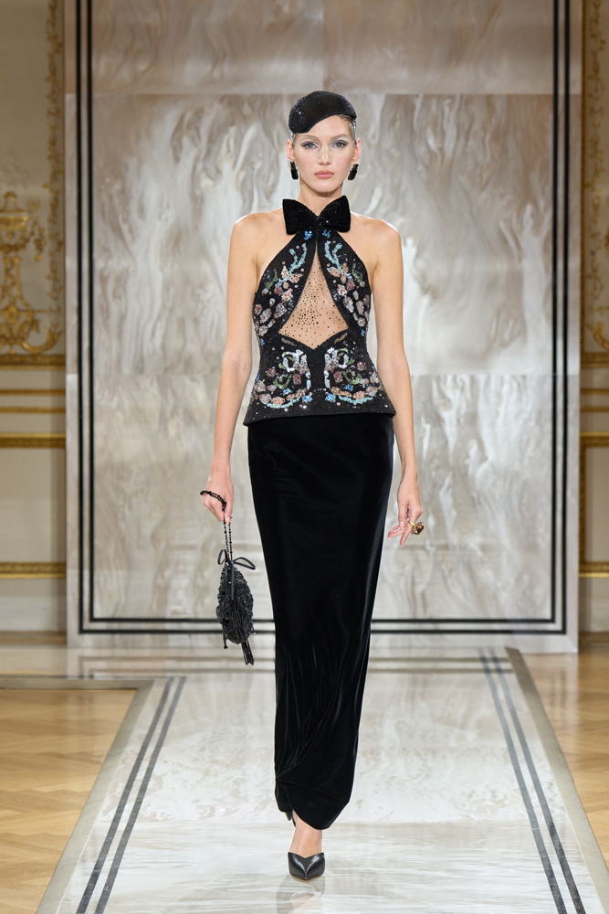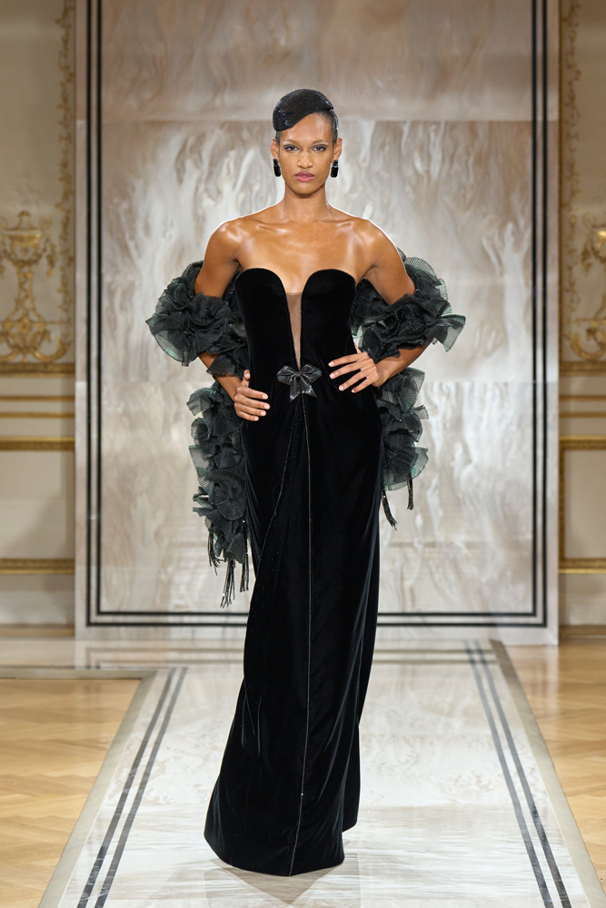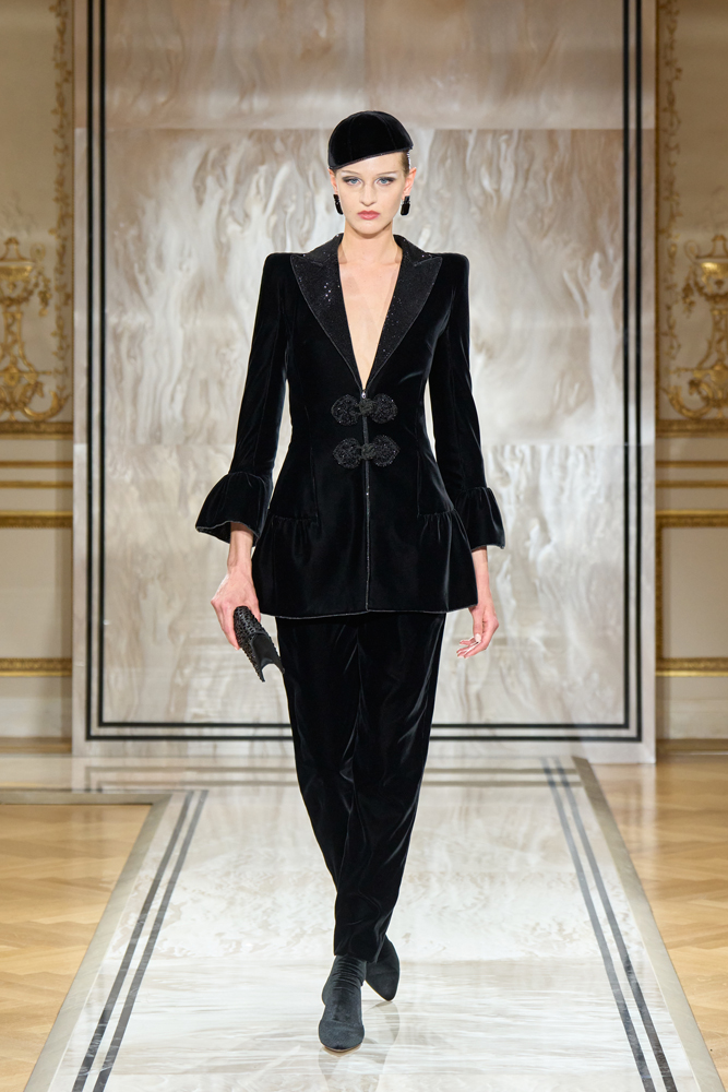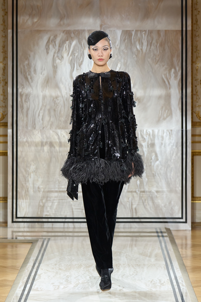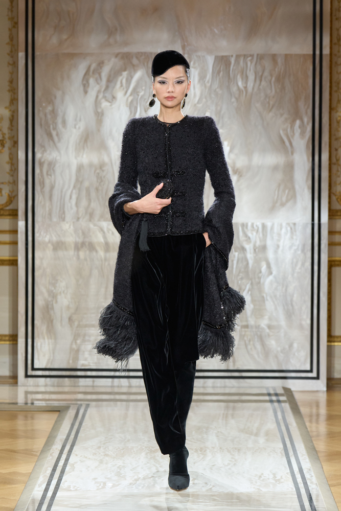 An absence that didn’t go unnoticed, but was offset by a wardrobe true to his vision, as if he were still here. Draped, embroidered, in satin or velvet… black becomes a canvas for nuance. Introduced by fluid silhouettes punctuated with colourful flashes of blue and emerald green, the collection gradually moves toward a more structured wardrobe. It blends revamped tuxedos, cropped blouses, and blazers worn directly on the skin. Touches of gold, crystal studs, a few feathers, and sheer plastrons add luminous contrast to the whole collection.