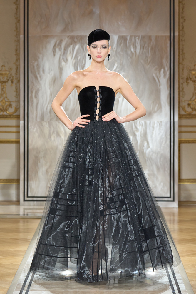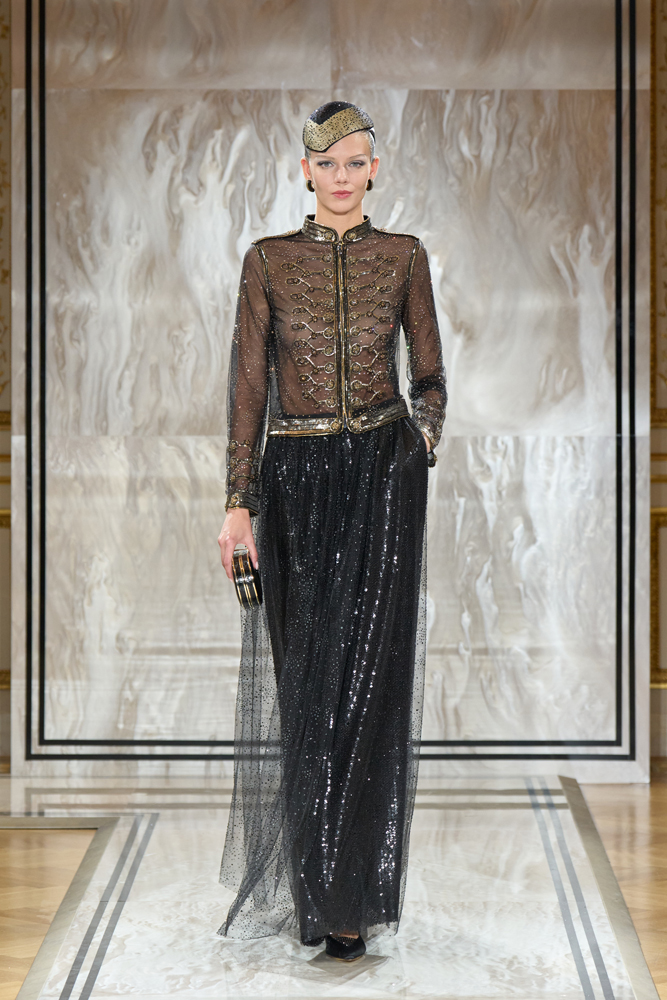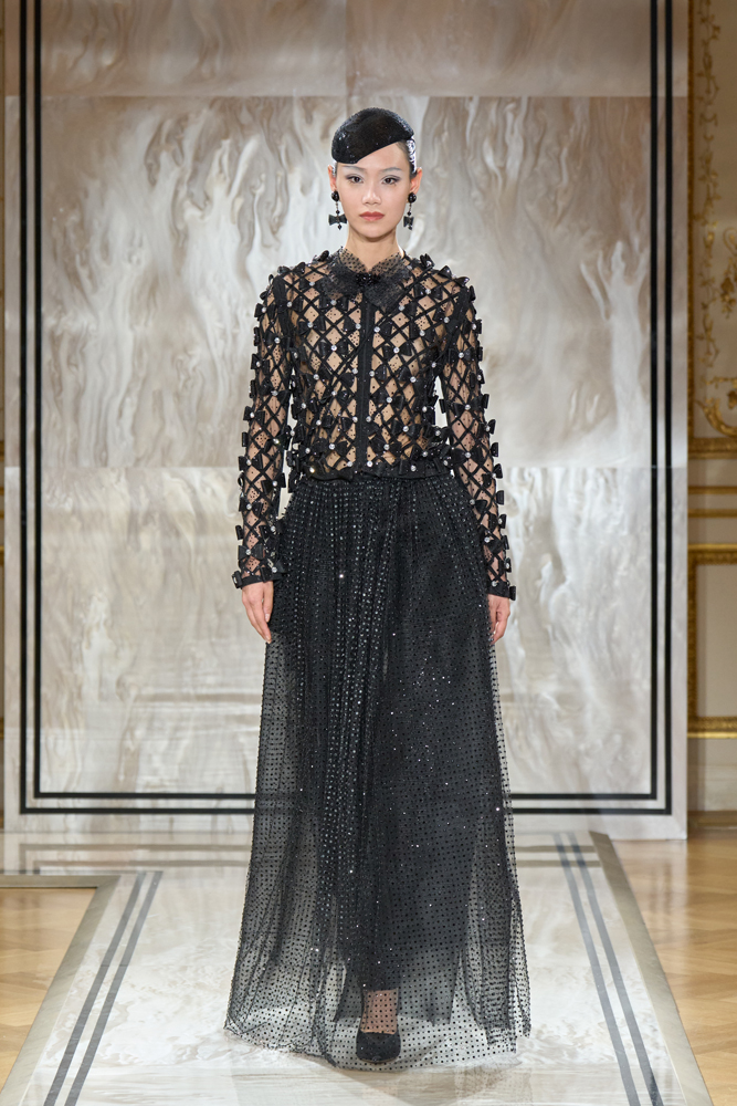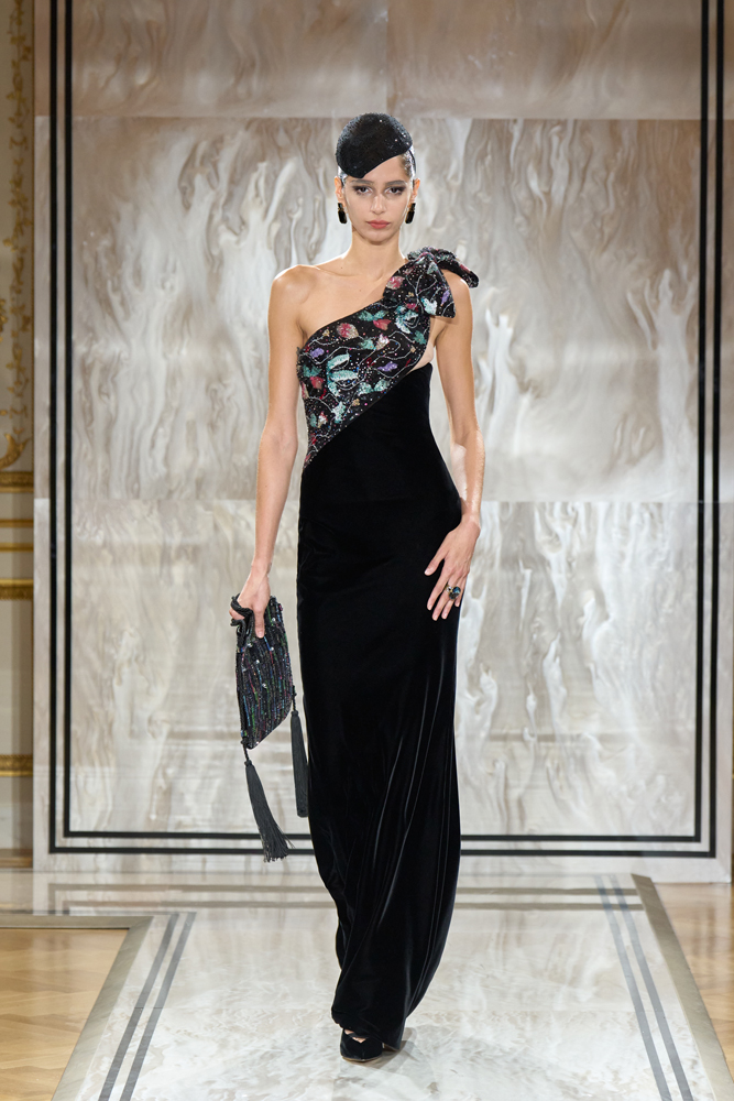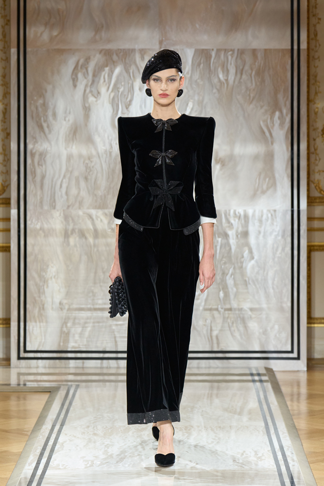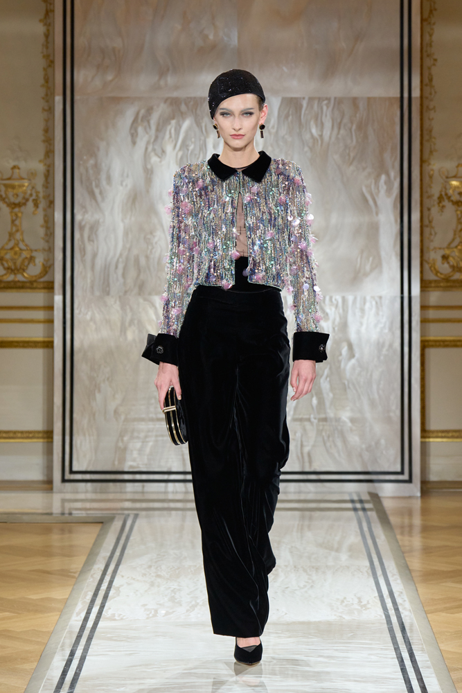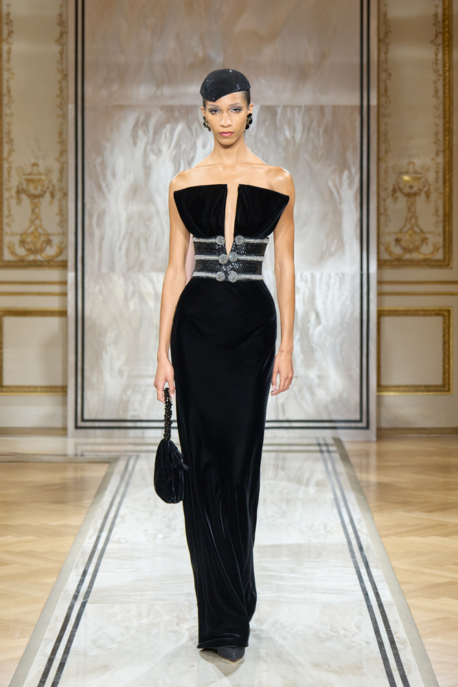 An absence that didn’t go unnoticed, but was offset by a wardrobe true to his vision, as if he were still here. Draped, embroidered, in satin or velvet… black becomes a canvas for nuance. Introduced by fluid silhouettes punctuated with colourful flashes of blue and emerald green, the collection gradually moves toward a more structured wardrobe. It blends revamped tuxedos, cropped blouses, and blazers worn directly on the skin. Touches of gold, crystal studs, a few feathers, and sheer plastrons add luminous contrast to the whole collection.