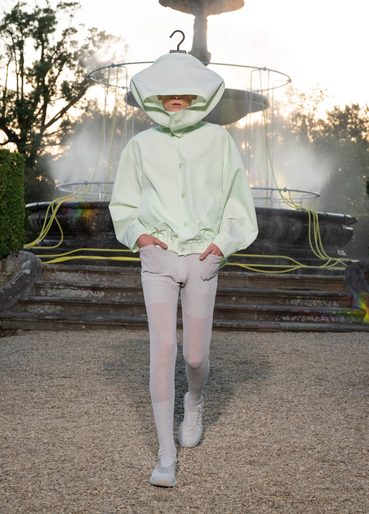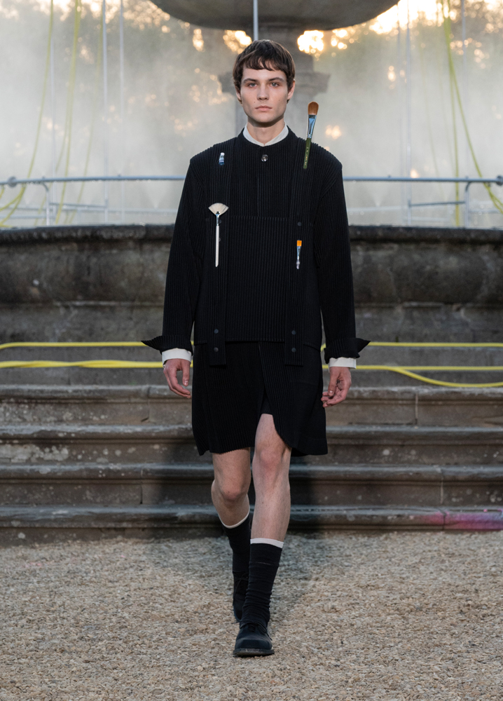 The second Japanese label present this year is Issey Miyake, and more precisely, Homme Plissé, the guest of honor at Pitti 108. The latter presented its Spring/Summer 2026 collection outside Florence, in the French formal garden of the villa once owned by the Medici family.