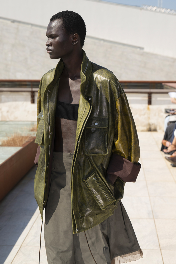 It stands at the crossroads between styles – military uniforms, workwear, tailoring -, fabrics – silk, leather, technical jersey – and silhouettes – asymmetries, strength and vulnerability.
