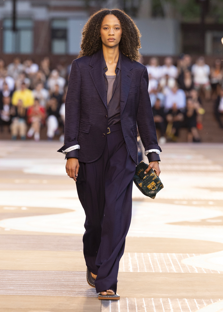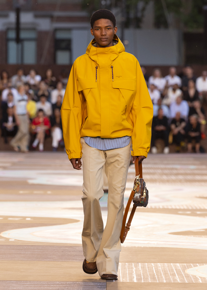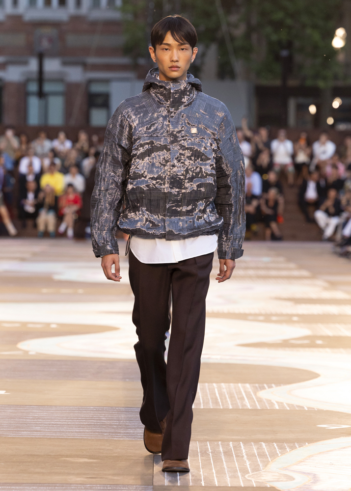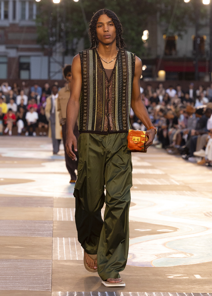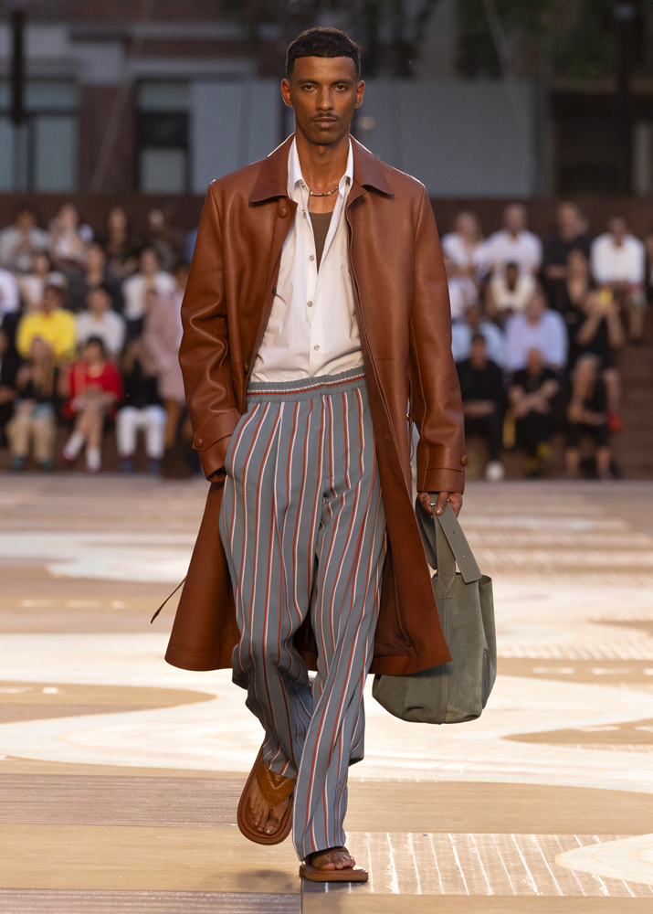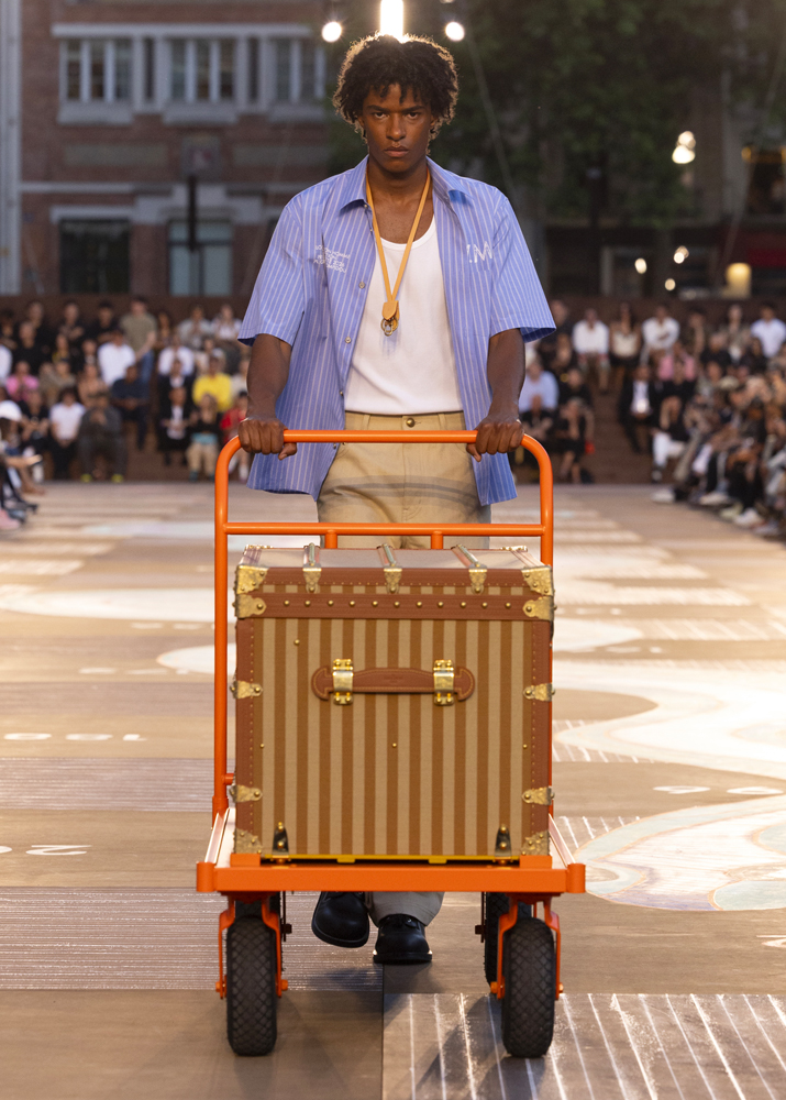 Imagined by Studio Mumbai, the set design of this show evokes the Indian board game “Snakes and Ladders.” On this life-sized board game, guests and models become the players. As a metaphor for life’s journey, the game blends Indian tradition with modernity, while evoking reverence for nature and self-reflection. Two values that align with Pharrell Williams’ philosophy.