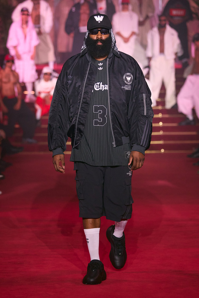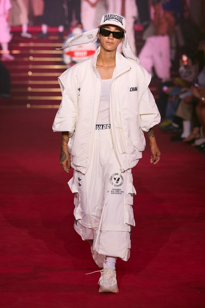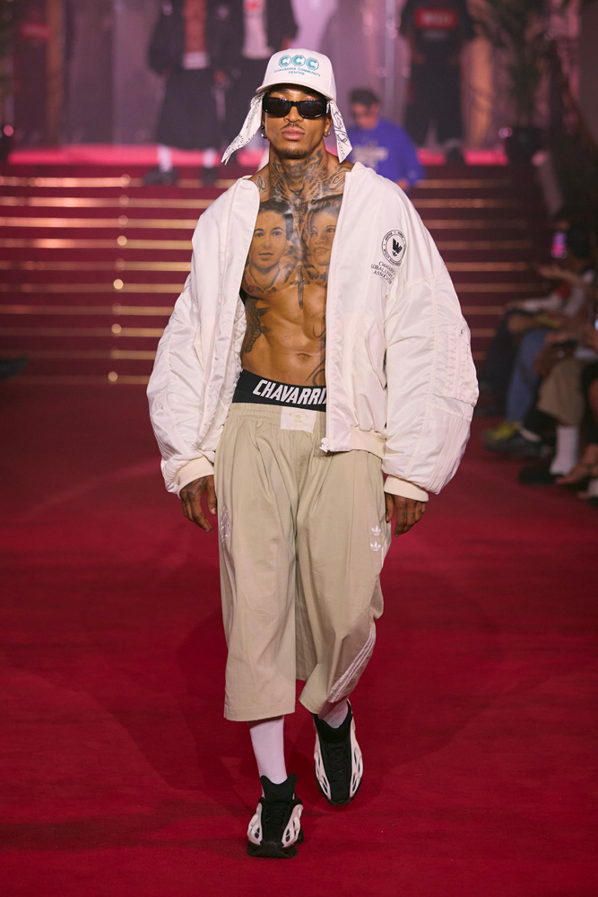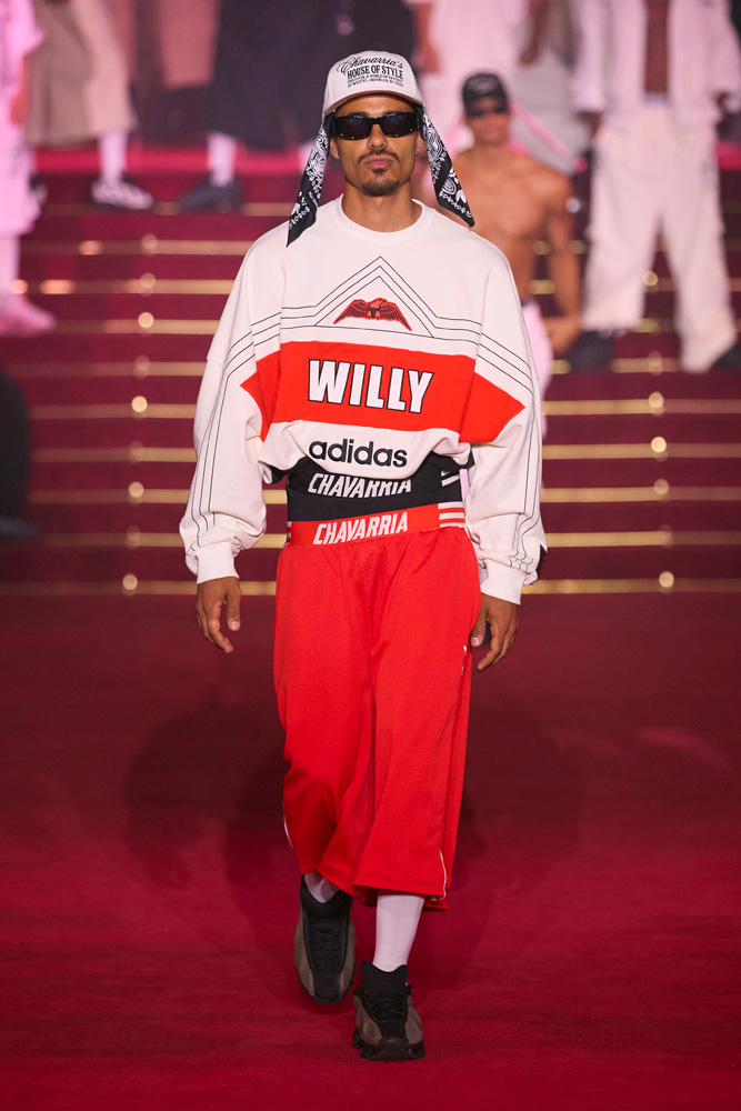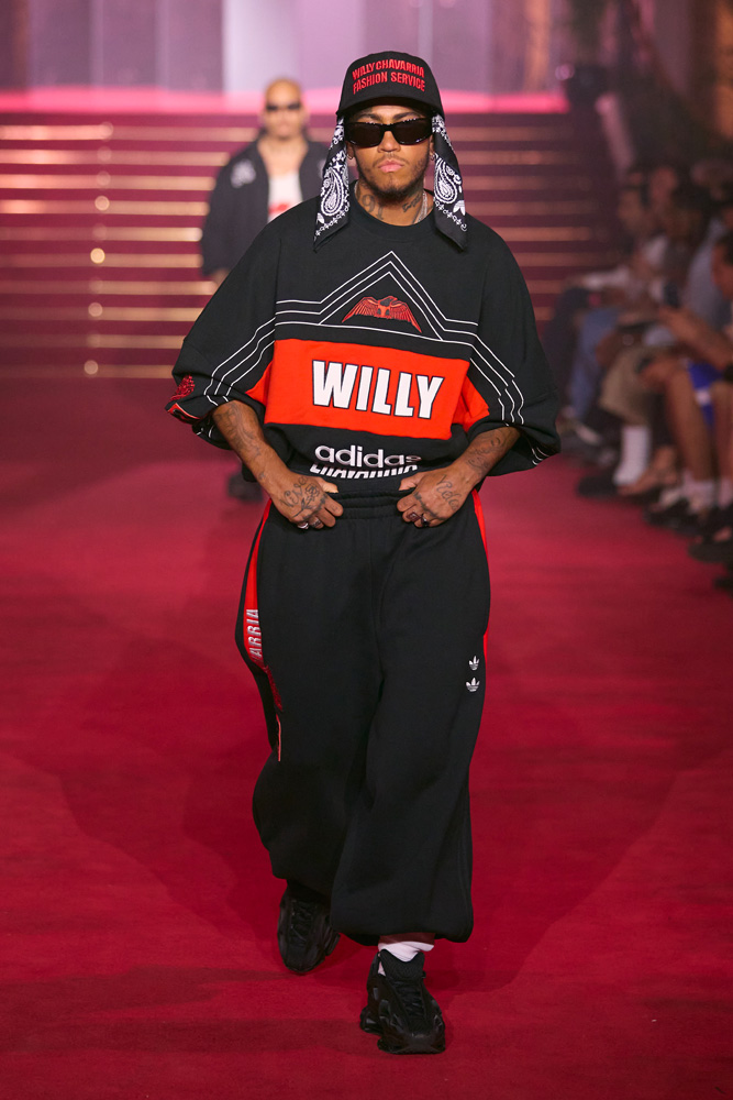 In addition to a logo that merges the Adidas Originals flower with Willy Chavarria’s W, the collection includes two new sneaker designs. First, a brand-new radical running silhouette, the Megaride AG and Megaride AG XL. Then, a personalized version of the iconic Superstar, dubbed the Chavarria Superstar.