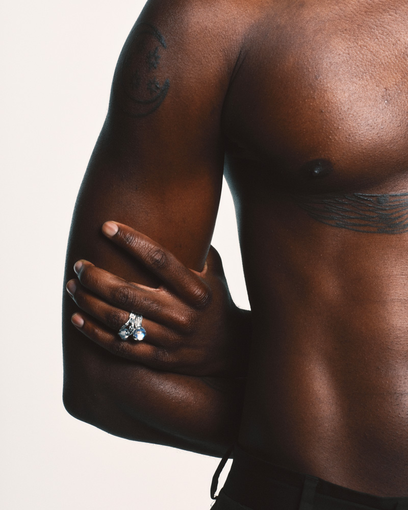 Épousant les hanches et les cuisses, le sulfureux bijou de corps en argent, décoré de pierres de lune oeil-de-chat blanc – imaginé par la styliste Samia Giobellina avec Tant d’Avenir – puise dans l’imaginaire de Lara Croft, évoquant sa ceinture d’aventurière. Mais aussi dans l’esthétique subversive de la top model Kate Moss…