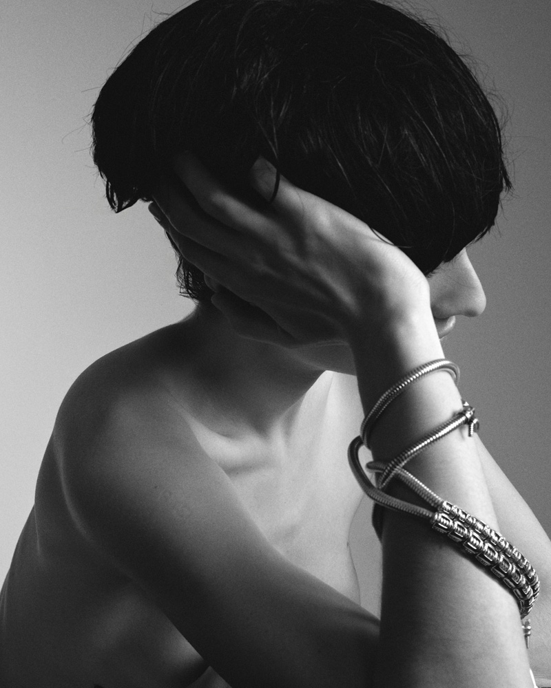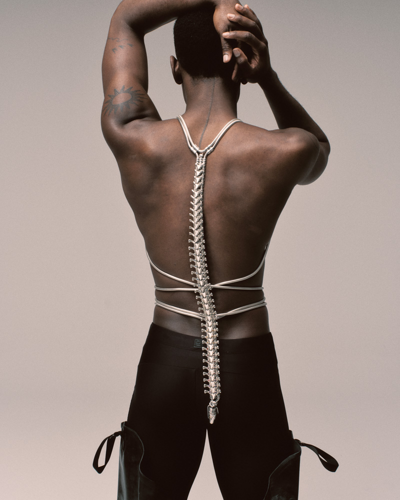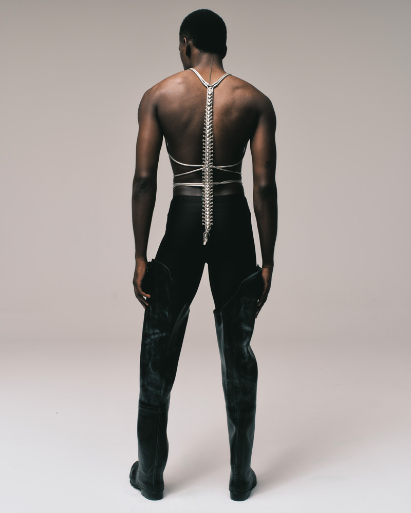 Aussi élégant que transgressif, cet accessoire se déploie comme une extension du corps. Porté sur un vêtement ou à même la peau, le bijou façonne une silhouette énigmatique, mais irrésistible. À mi-chemin entre l’esthétique du créateur Quentin Pontonnier et celle de Samia Giobellina.