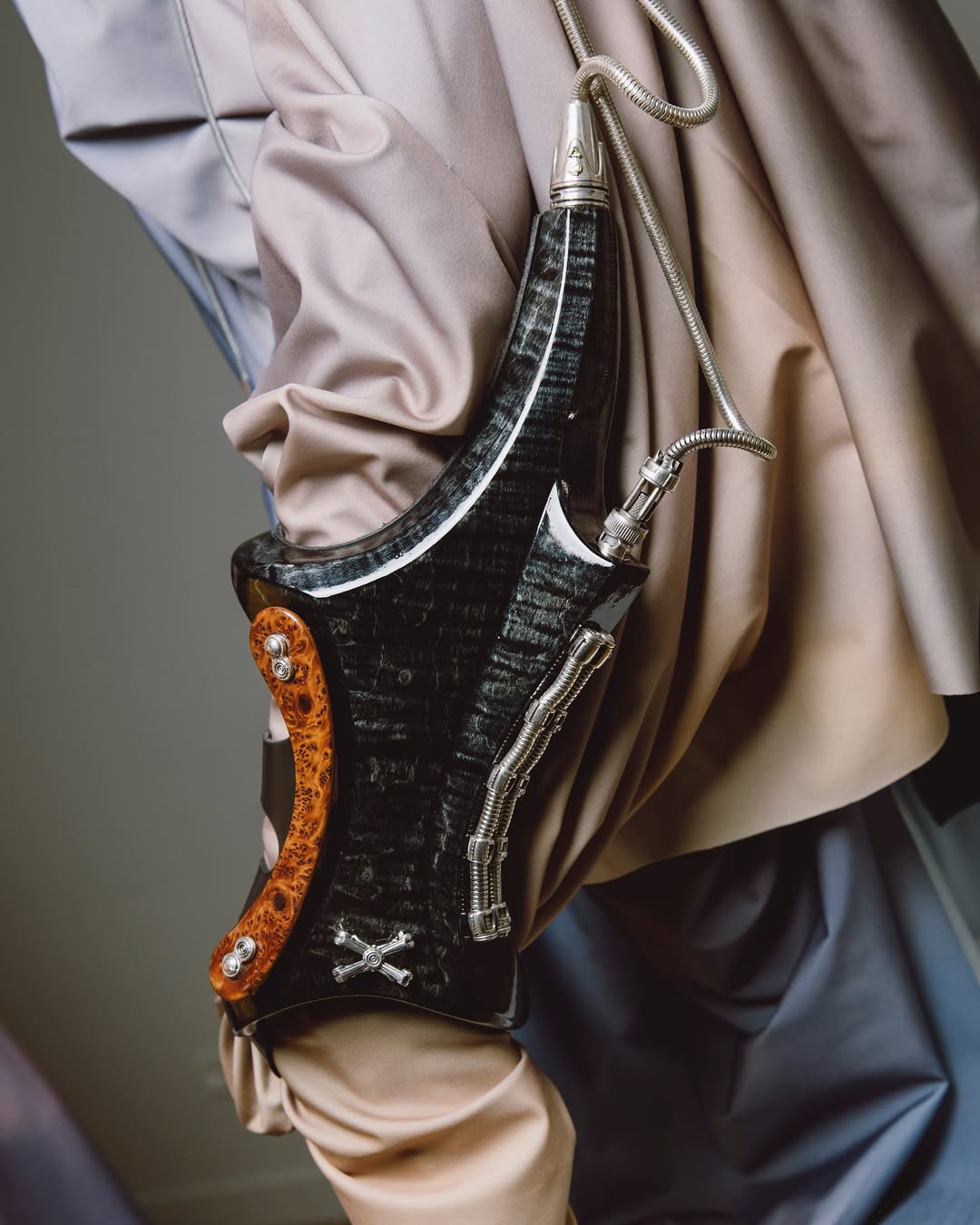 Habitué aux collaborations – avec Zomer ou Björk –, Amaury Darras déploie un univers mode singulier. Ces pièces audacieuses, tel un harnais, un corset ou un pantalon, sont toutes sculptées en bois. Un imaginaire au-delà du réel, qui fait naturellement écho à celui de Quentin Pontonnier de Tant d’Avenir. Une rencontre entre les deux diplômés de l’école Boulle qui donne lieu à une manchette-sculpture dont la forme et les matériaux évoquent un style futuriste, tel un cyborg.