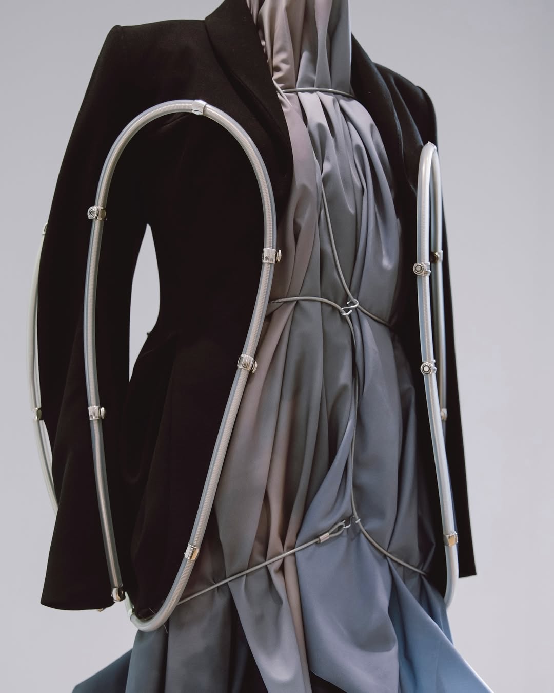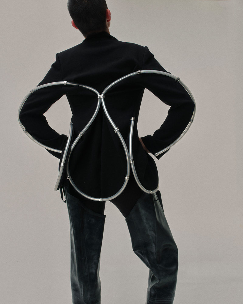 Classique de notre garde-robe, le blazer s’orne ici de tubes en plastique de maïs et d’élements en argent. Une esthétique futuriste inspirée par les systèmes de câblage industriel, dont l’ossature métallique, laissée apparente, contraste avec la laine de la veste et enveloppe le corps autant qu’elle le souligne.