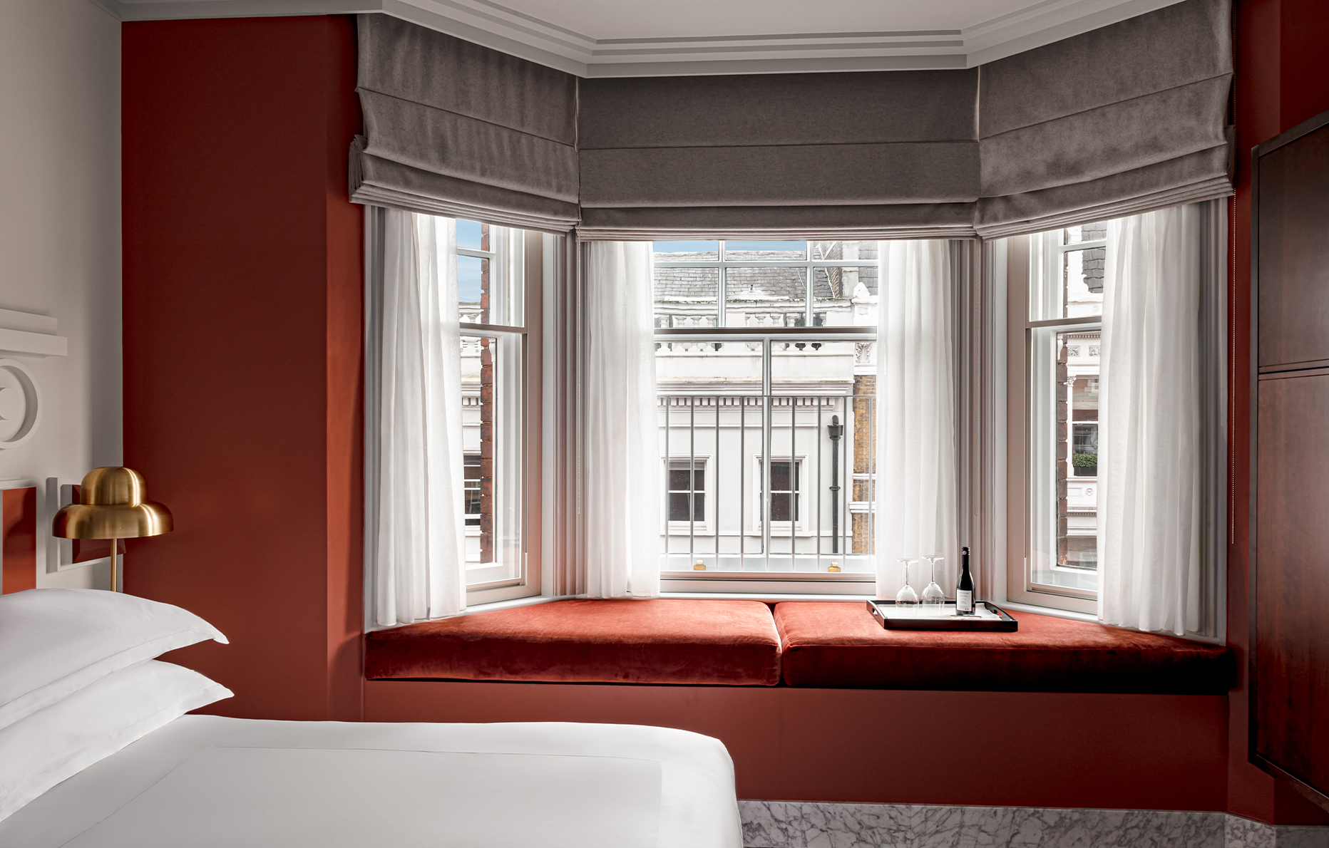 Un délice gustatif, qui rend difficile le chemin pour trouver son repos bien mérité dans le confort de son lit. Alors, on nous escorte jusqu’à notre chambre – ou plutôt notre petit palace. Celles-ci déploient également le charme typiquement britannique du décor de l’hôtel. Entre les murs peints de rouge, on s’imagine alors lord ou lady, enveloppé dans son peignoir moelleux, en train de savourer une tasse de thé sur sa banquette, observant les lumières du trafic londonien…
