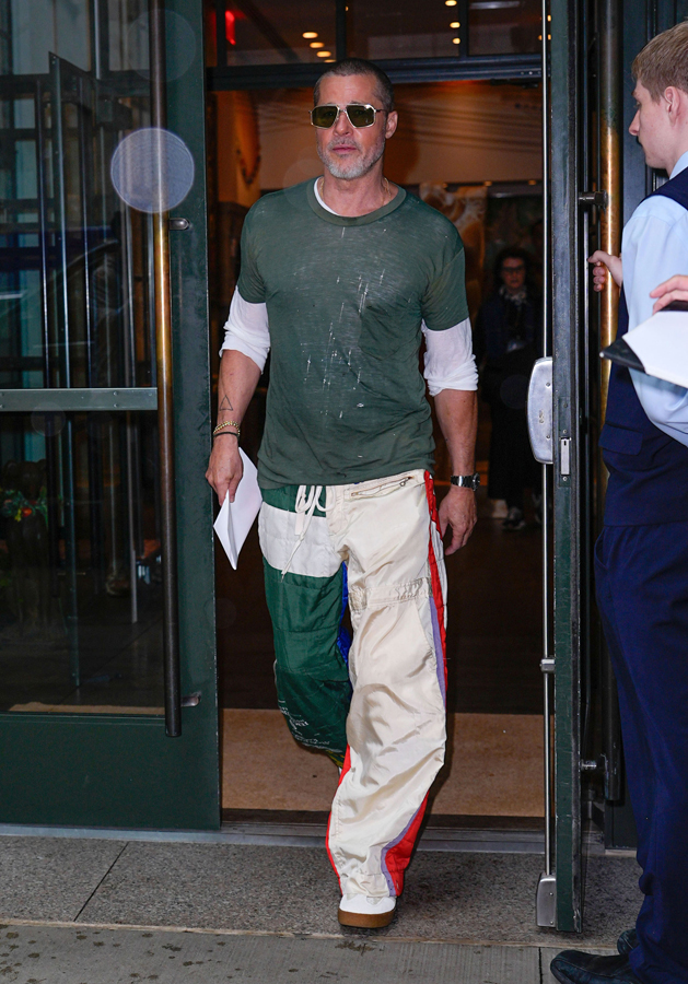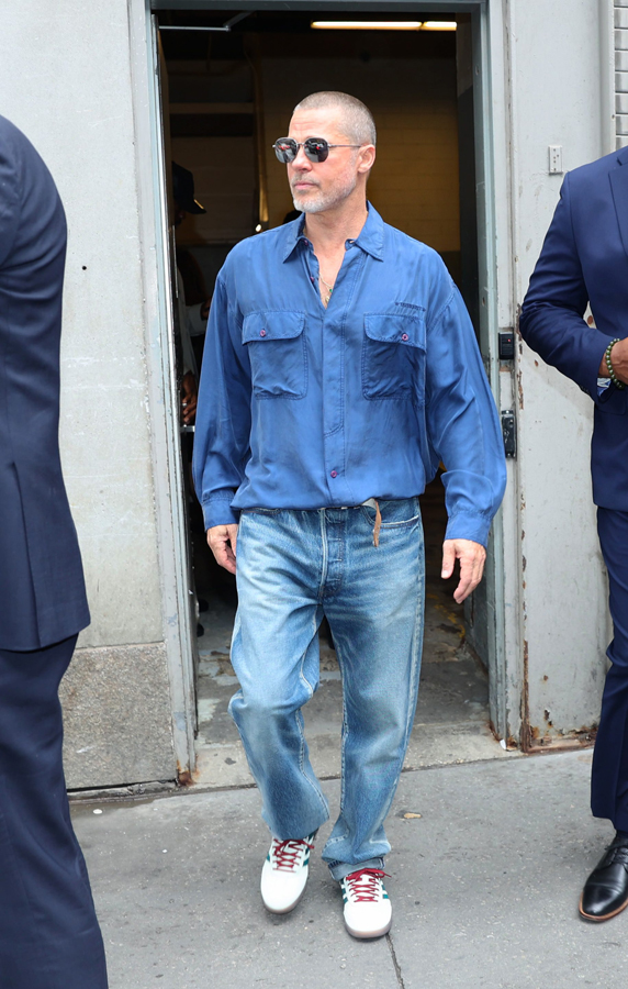 Également aperçu il y a une semaine à peine dans les rues de la Grosse Pomme, l’acteur arborait une salopette en crêpe bleu ciel Givenchy dessinée par Sarah Burton, accessoirisée d’un sac de voyage Gucci en daim bleu. En toute honnêteté, à part Brad Pitt, qui d’autre aurait pu se permettre un tel look ?
