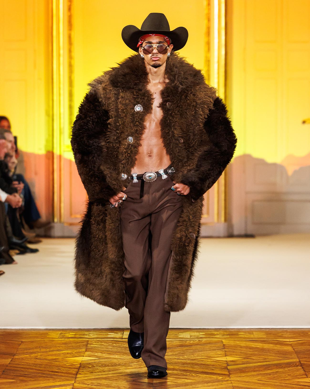 Au milieu de la cinquantaine de silhouettes présentées ce jour-là, certaines d’entre elles retiennent notre attention. À commencer par un mystérieux look brodé de bijoux. Transformé en véritable œuvre d’art, le pantalon d’un costume vert aux proportions oversized se voit délicatement brodé d’une constellation de pierres colorées. Un détail qui souligne le travail minutieux autour des ornements, cher au créateur Julian Klausner.