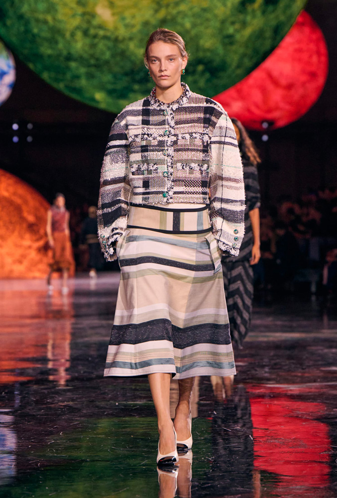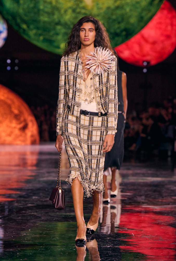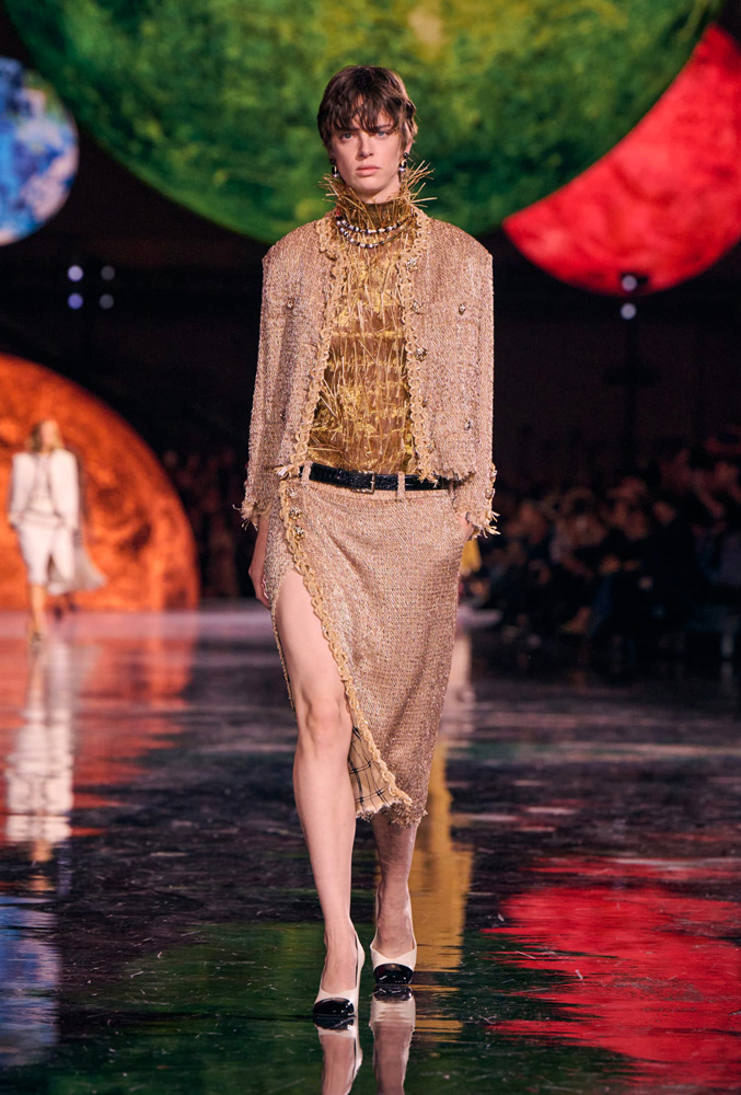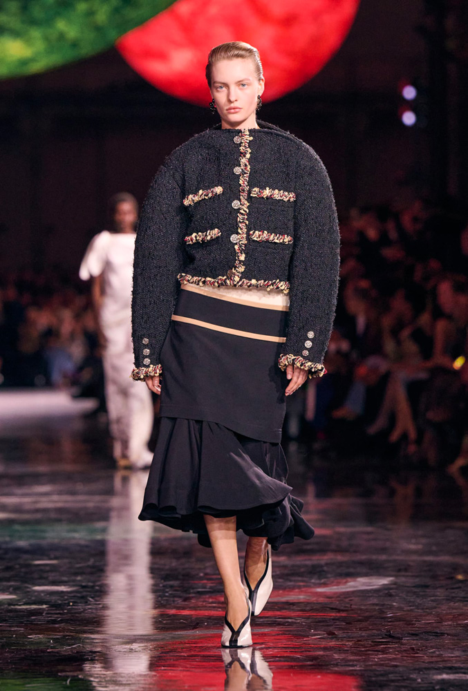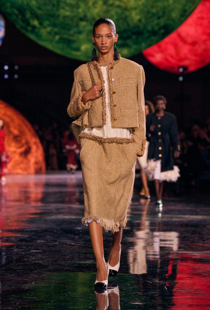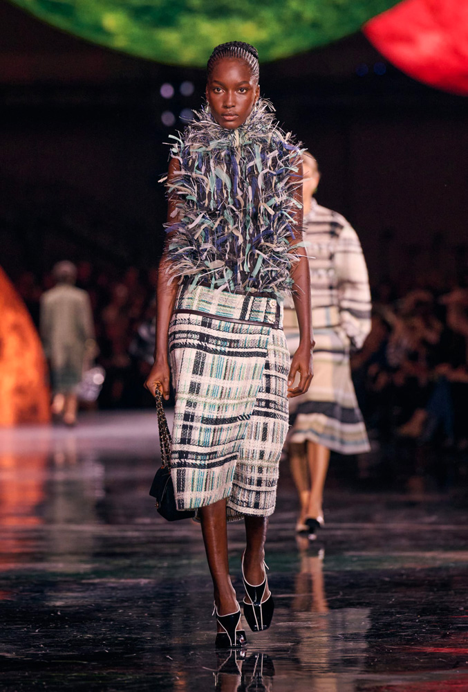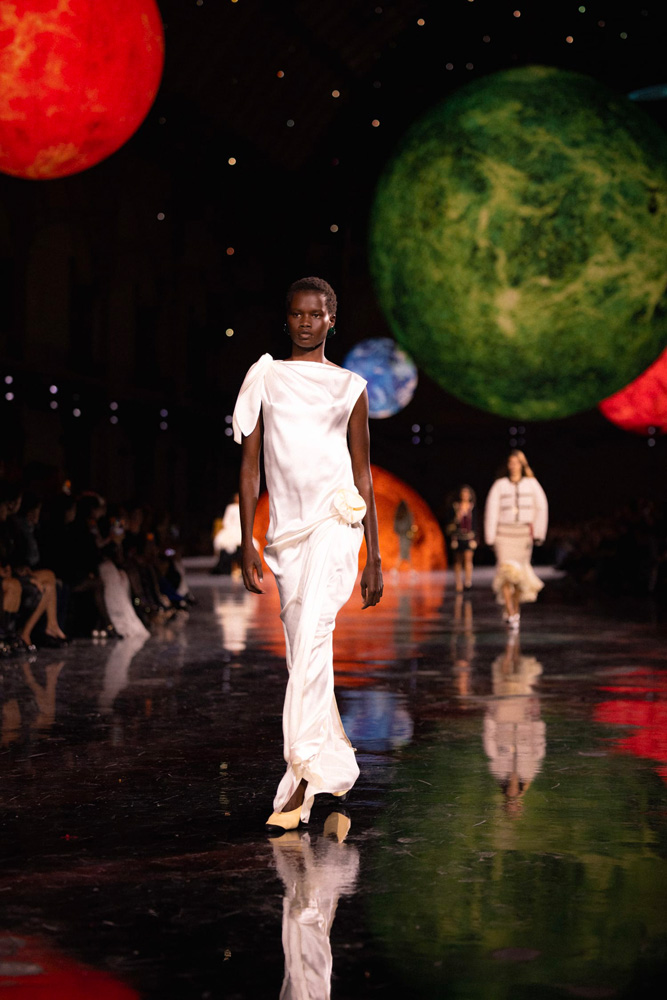 Sous la lune parisienne, l’Univers de Chanel se déploie en planètes colorées, dont les reflets dansent sur le sol noir et brillant. Une scénographie grandiose, rappelant l’ère Karl Lagerfeld, qui signe la renaissance d’une maison emblème du luxe français. “Ceci est un univers, l’Univers de Chanel. Dans ce monde où les contraintes ordinaires du temps et de l’espace ne s’appliquent pas, une conversation se déploie en trois actes.”