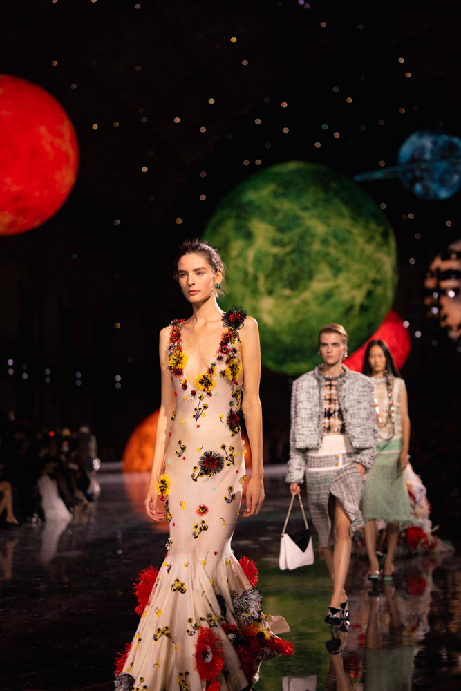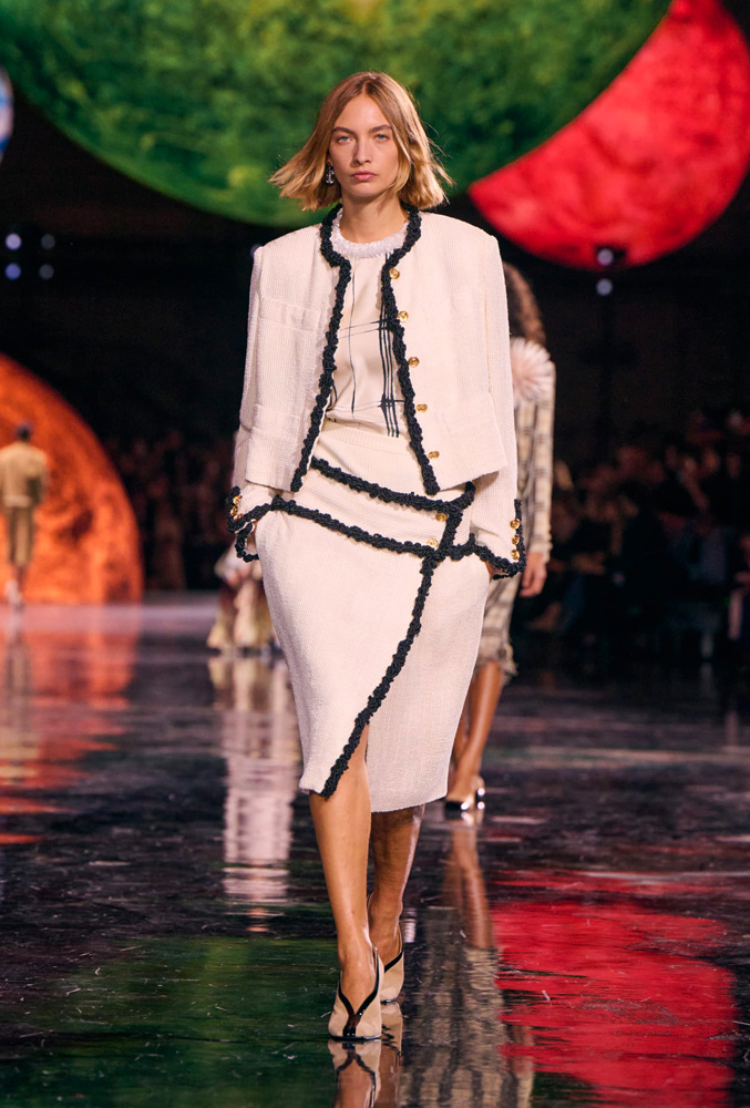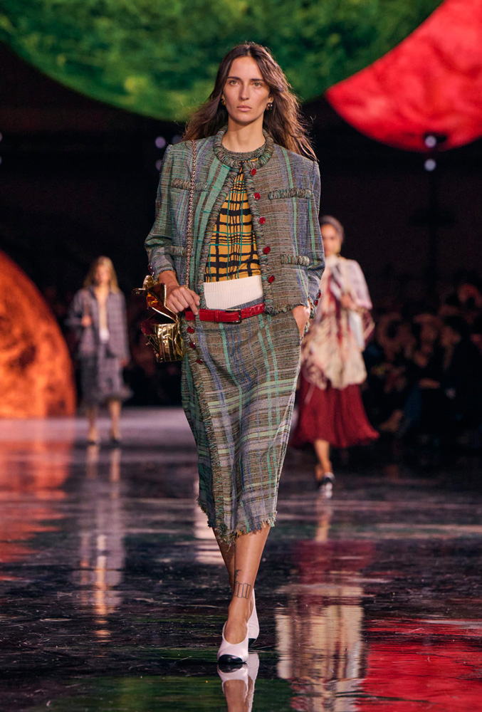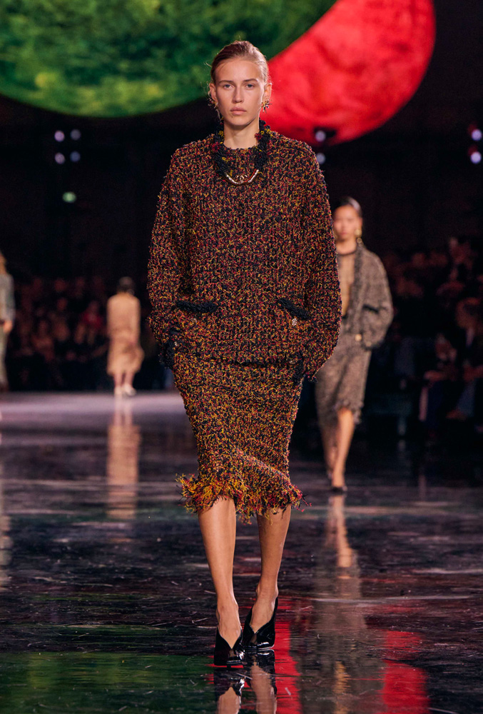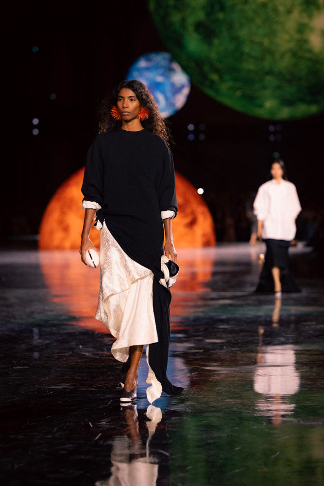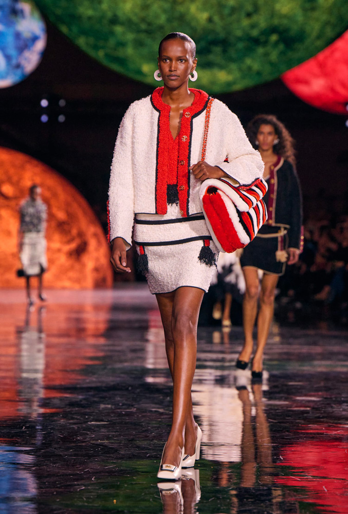 Sous la lune parisienne, l’Univers de Chanel se déploie en planètes colorées, dont les reflets dansent sur le sol noir et brillant. Une scénographie grandiose, rappelant l’ère Karl Lagerfeld, qui signe la renaissance d’une maison emblème du luxe français. “Ceci est un univers, l’Univers de Chanel. Dans ce monde où les contraintes ordinaires du temps et de l’espace ne s’appliquent pas, une conversation se déploie en trois actes.”
