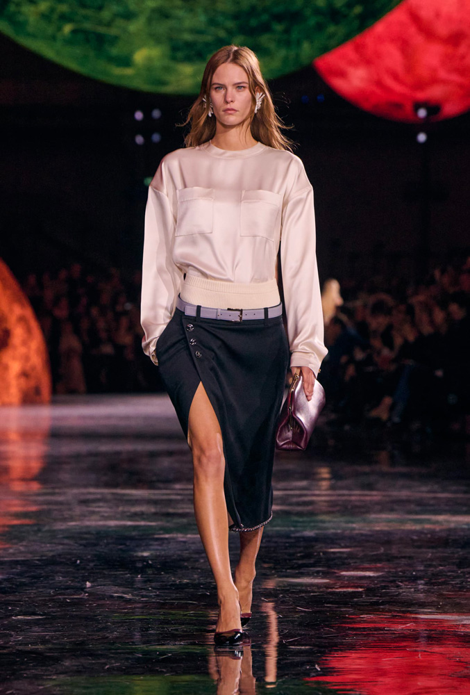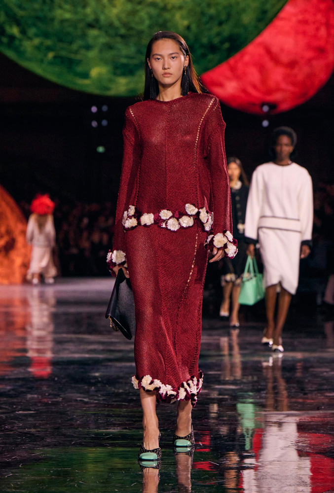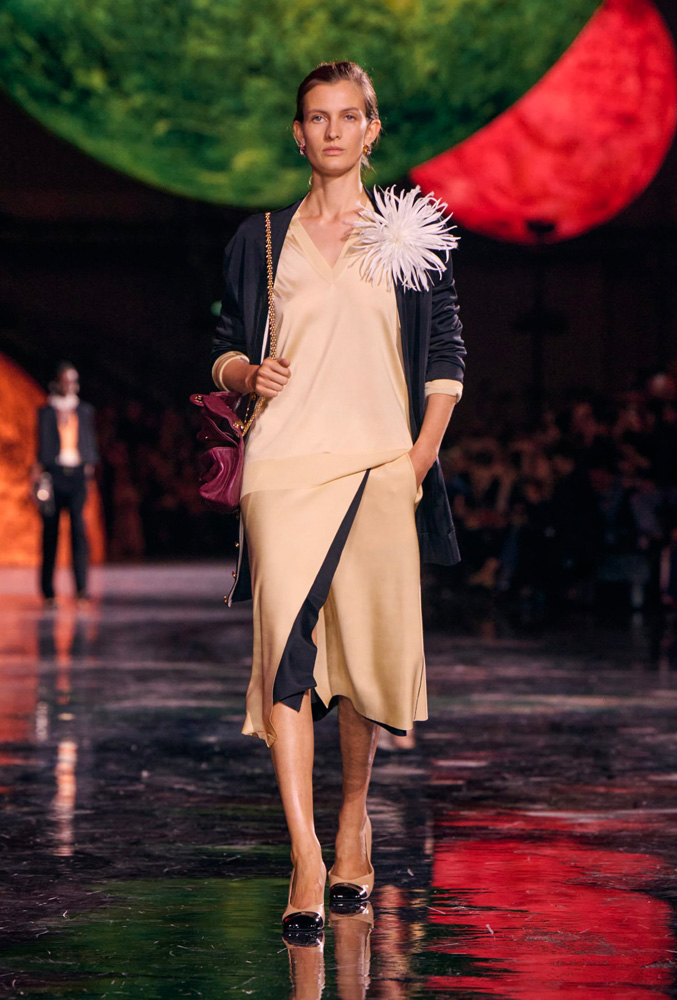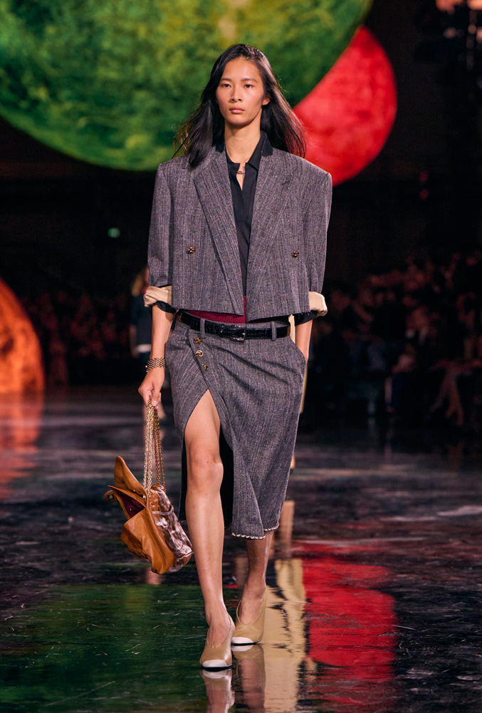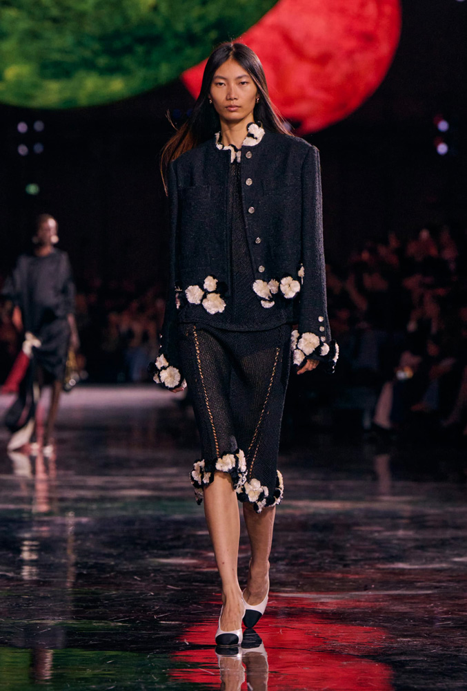 Plus que les coupes, c’est une véritable attitude Chanel que Matthieu Blazy réinvente. Les tailleurs se parent de jupes asymétriques qui dévoilent la jambe avec audace. Les robes en soie se nouent et se drapent pour épouser les corps dans un mouvement fluide. Les silhouettes gitanes s’animent de volants sculpturaux. On remarque aussi les mailles souples, qui gagnent en nonchalance, et les tweeds, allégés ou effilochés, qui épousent naturellement le geste. Les camélias et autres fleurs emblématiques de Chanel se transforment en motifs et ornements abstraits ; les bijoux adoptent une opulence baroque ; et les iconiques chaussures bicolores conjuguent désormais hauteur et confort. Quant au 2.55, sac mythique de la maison, semble avoir traversé les décennies, comme un héritage intemporel, transmis de génération en génération.