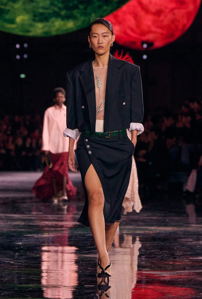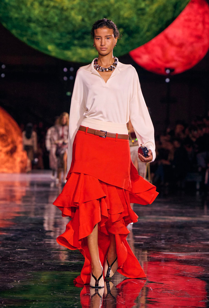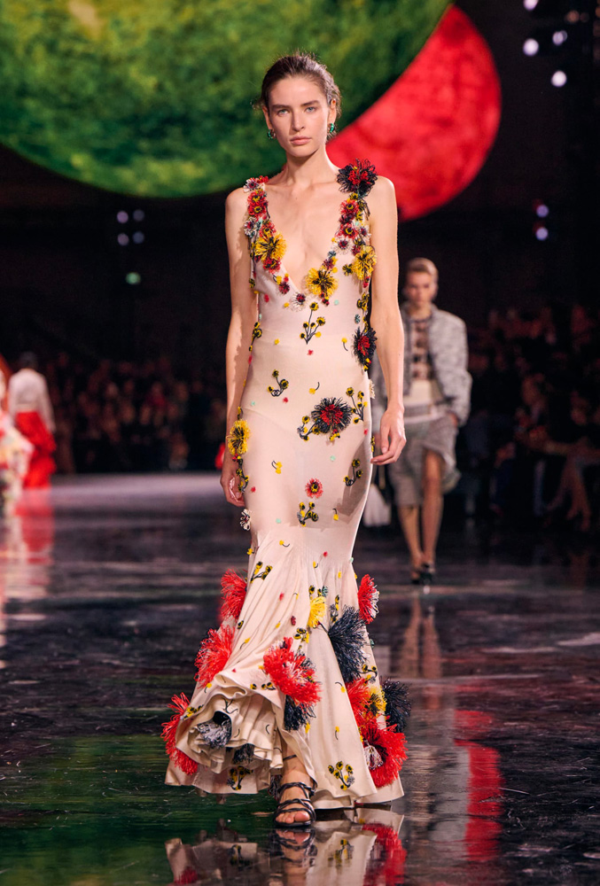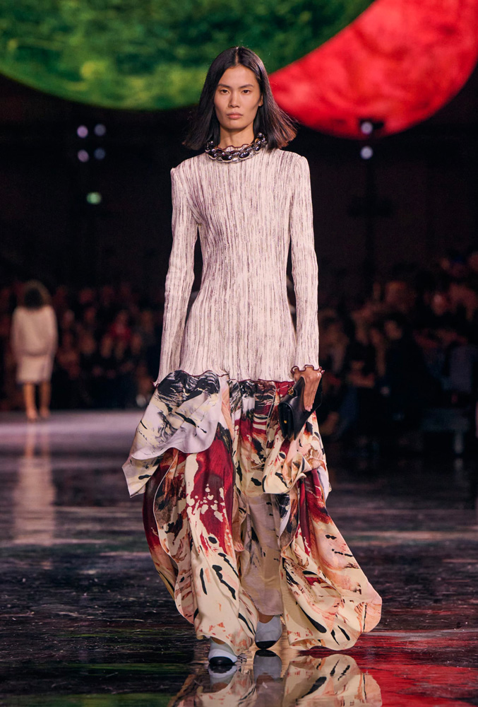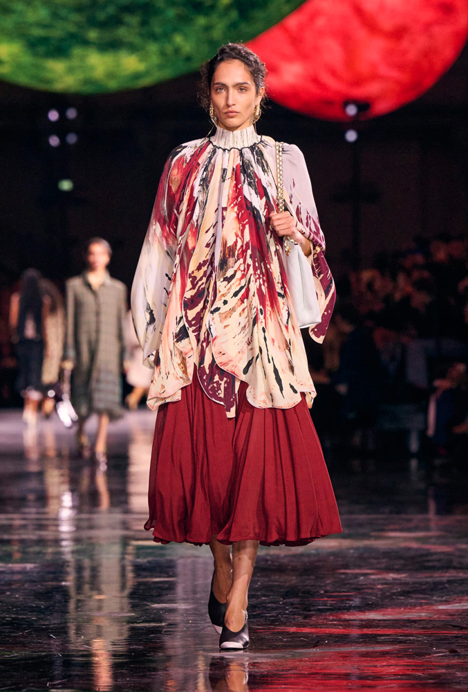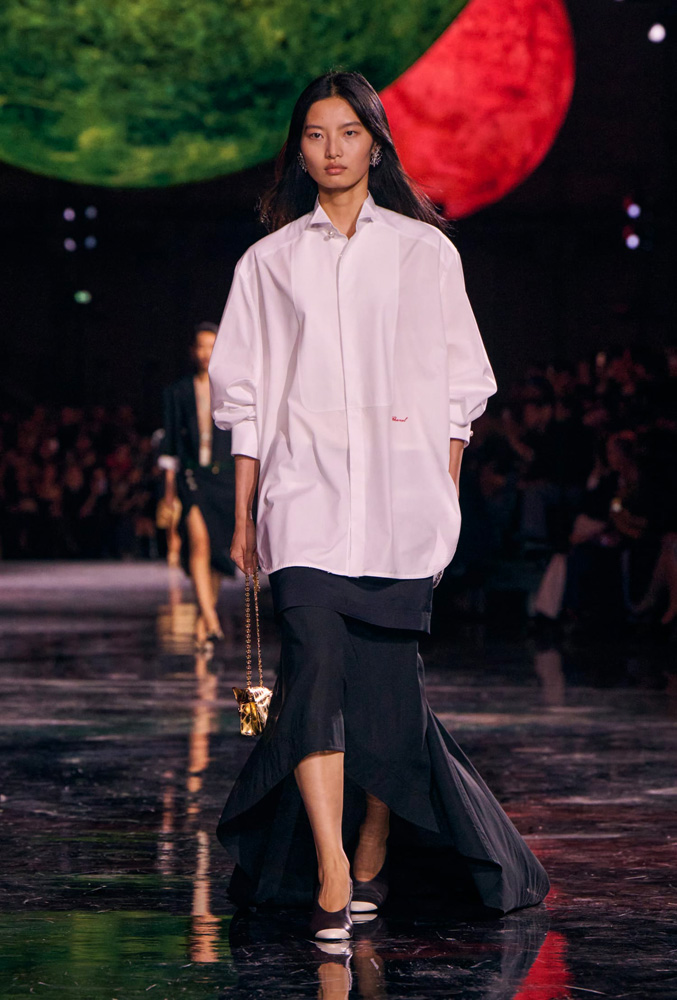 Plus que les coupes, c’est une véritable attitude Chanel que Matthieu Blazy réinvente. Les tailleurs se parent de jupes asymétriques qui dévoilent la jambe avec audace. Les robes en soie se nouent et se drapent pour épouser les corps dans un mouvement fluide. Les silhouettes gitanes s’animent de volants sculpturaux. On remarque aussi les mailles souples, qui gagnent en nonchalance, et les tweeds, allégés ou effilochés, qui épousent naturellement le geste. Les camélias et autres fleurs emblématiques de Chanel se transforment en motifs et ornements abstraits ; les bijoux adoptent une opulence baroque ; et les iconiques chaussures bicolores conjuguent désormais hauteur et confort. Quant au 2.55, sac mythique de la maison, semble avoir traversé les décennies, comme un héritage intemporel, transmis de génération en génération.
