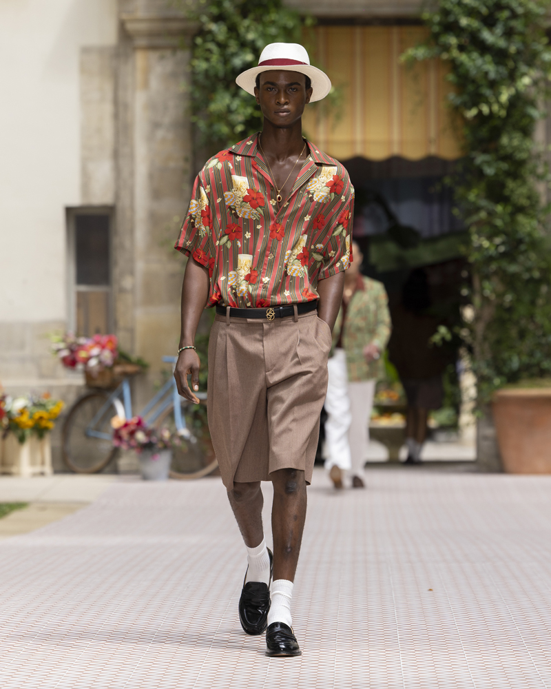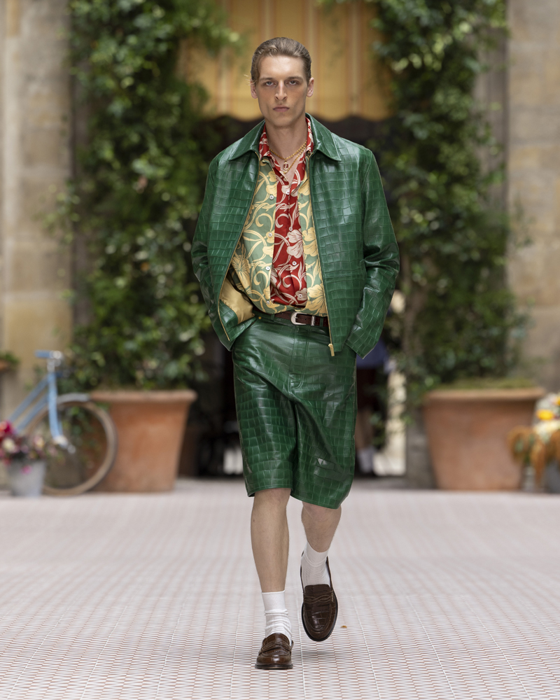 L’hiver dernier, Drôle de Monsieur conviait ses invités dans un décor taillé dans la glace, inspiré du faste de la station suisse de Saint-Moritz. Pour leur défilé printemps-été 2026, organisé dans la cour du prestigieux Lycée Henri IV, Dany Dos Santos et Maxime Schwab puisent leur inspiration dans le Cuba incandescent des années 30 à 50, et plus précisément à la Havanne. Pour l’occasion, les silhouettes se parent de larges chemises en soie à motifs colorés, mais aussi d’imposantes vestes et shorts en cuir, évoquant parfois la figure des mafieux.