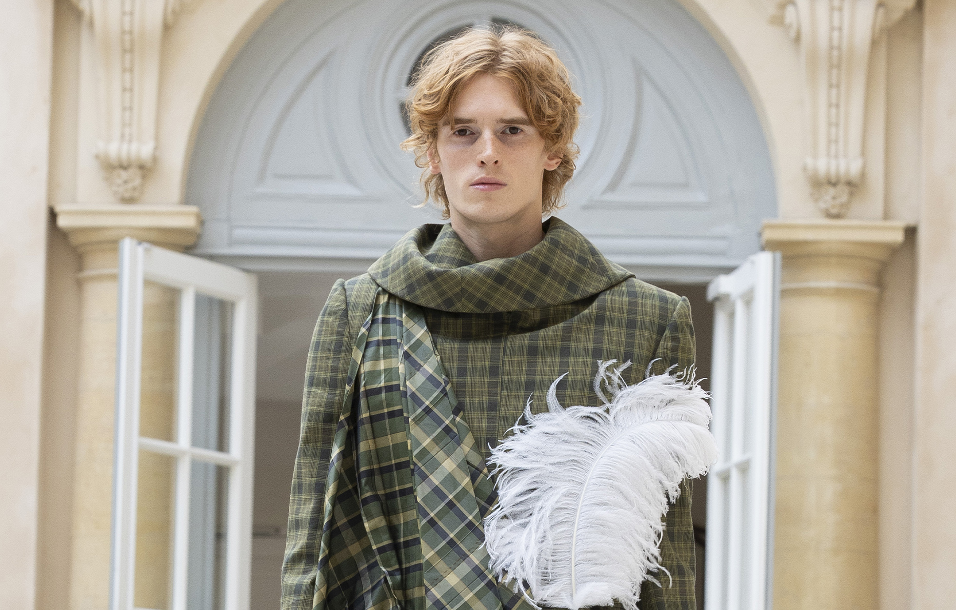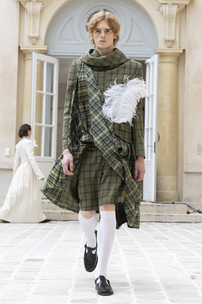 Après avoir investi les murs du Palais de Tokyo la saison dernière, le jeune designer Steven Passaro prend d’assaut le Quadrilatère des Archives, en plein cœur du marais, afin de présenter sa collection printemps-été 2026 intitulée Moonlit Lover. À travers une trentaine de silhouettes aériennes, le créateur passé par les bancs du London College of Fashion livre une réflexion intime sur les zones de désir. Visuellement, cette exploration se traduit par l’introduction de kilts aux motifs écossais, souvenirs d’un amour passé dans les Highlands.