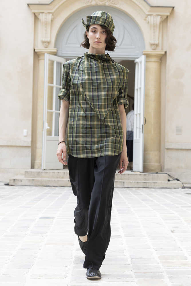 Fil conducteur de cette collection, le motif “carreau” se retrouve également sur certains accessoires, prenant la forme de chapeaux au style marin. Enfin, un symbole ultime d’un amour ardent s’invite sur les dernières silhouettes, avec l’apparition de branches de roses argentées aux piques saillantes. Une fois encore, Steven Passaro se présente comme l’un des designers à suivre à la Fashion Week de Paris…