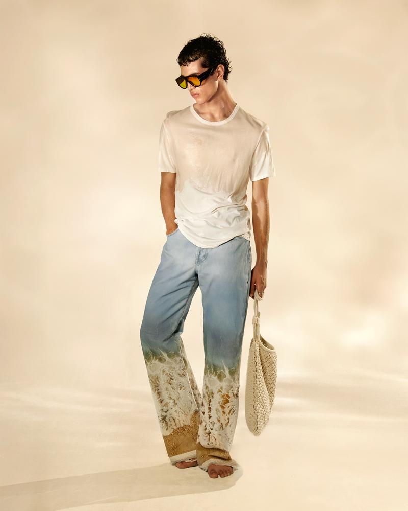 Tout sourire et impatients, le couple de designers évoque à Numéro un besoin de vacances urgent, qui nourrit les inspirations de ces créations. D’un manteau recouvert d’une matière semblable à du sable, à un pantalon en PVC reproduisant les motifs de vagues, en passant par un tee-shirt enduit de sillicone pour produire un effet mouillé… La collection est aussi séduisante qu’innovante, et nous laisse rêveurs quant au futur de la jeune marque lancée en 2020.