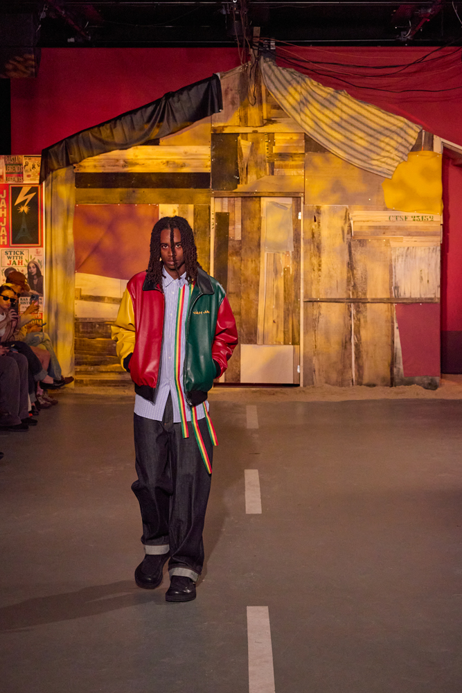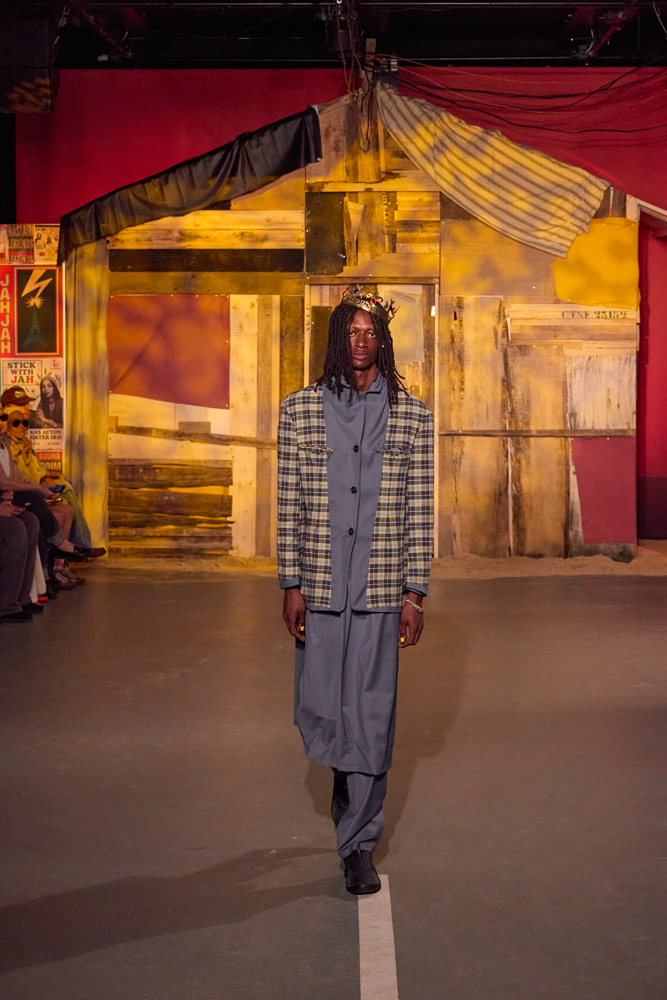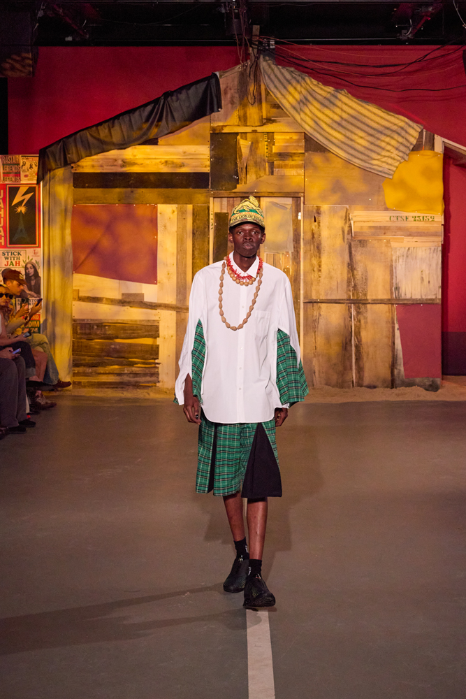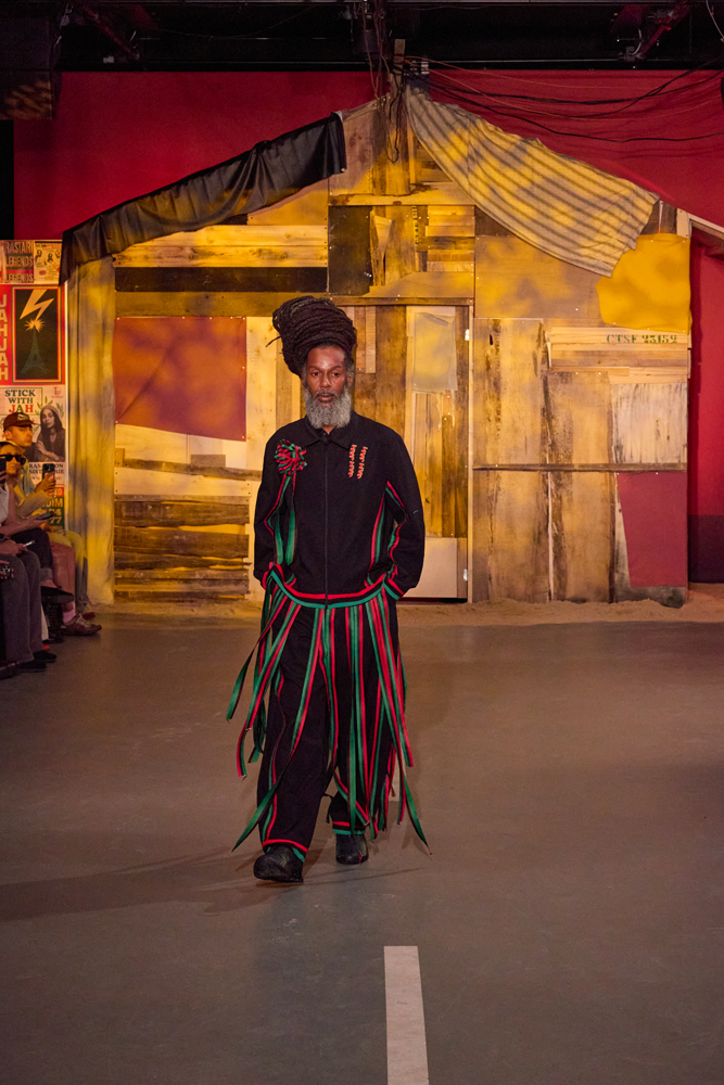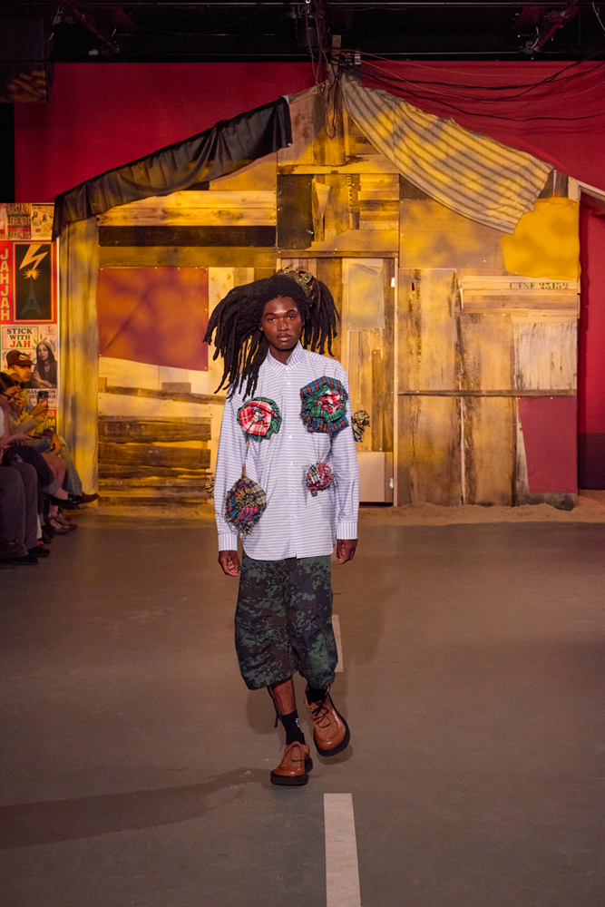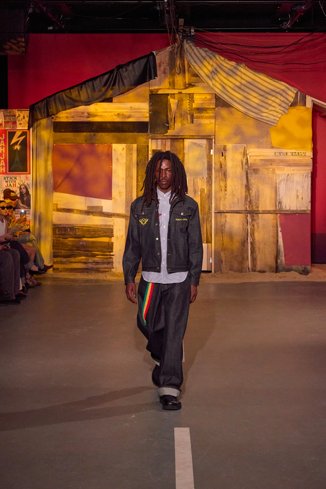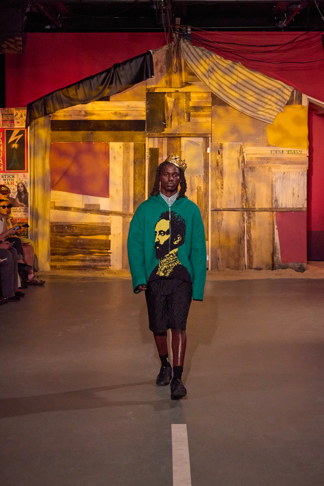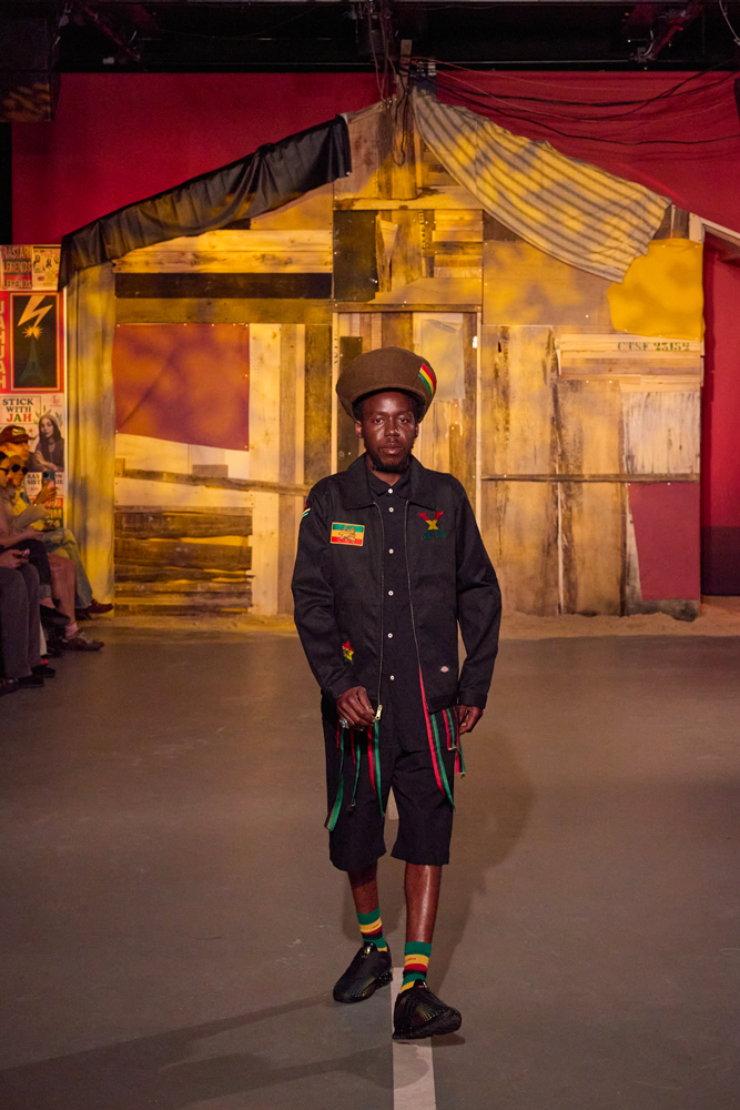 Sur des lignes de basses reggae, les mannequins s’élancent à travers la porte de la cabane. Les dos tantôt voûtés, tantôt fiers, mais toujours dignes. La tête souvent auréolée de couronnes et de dreadlocks, ils adoptent une démarche tranquille, des références à la culture rastafari parsemées sur les vêtements.