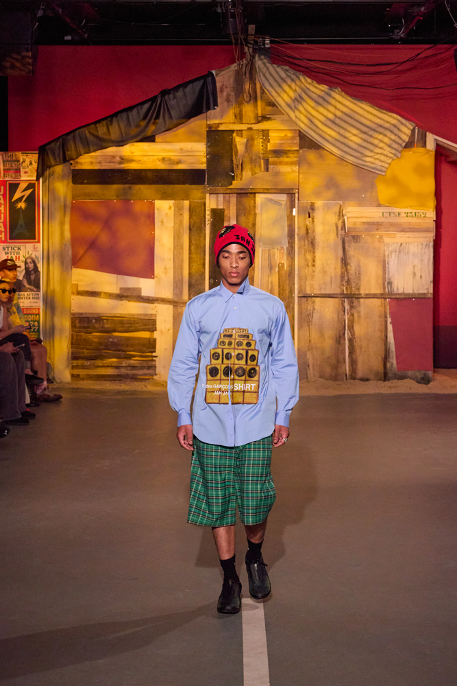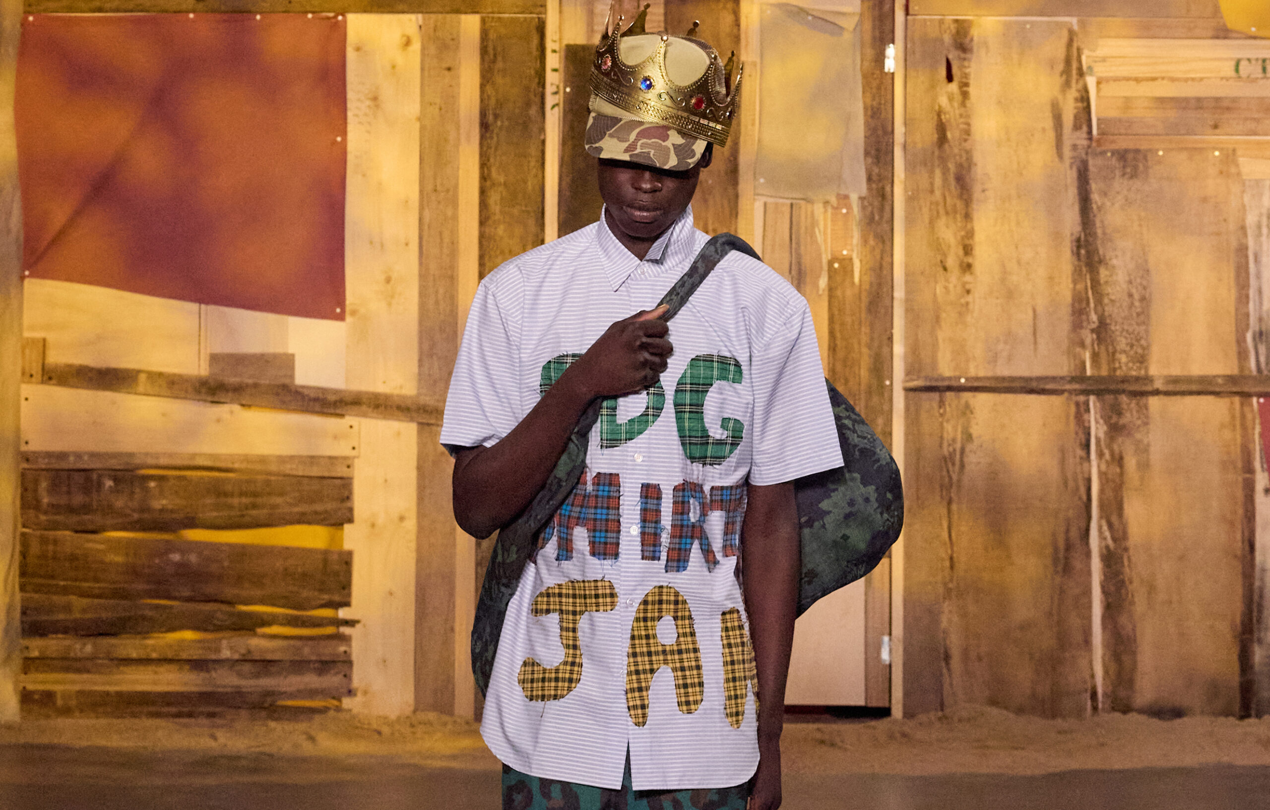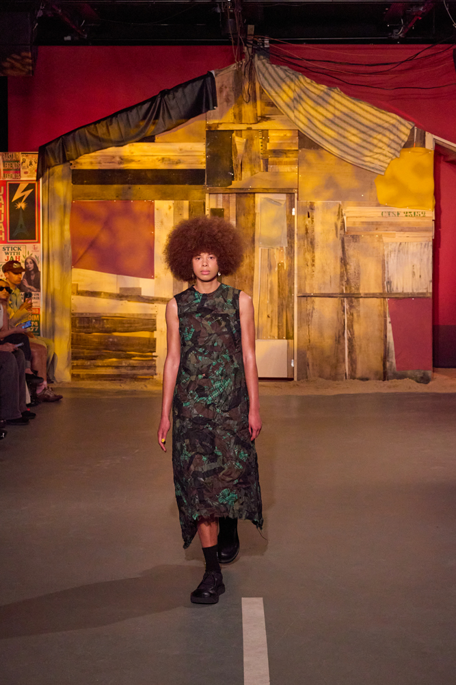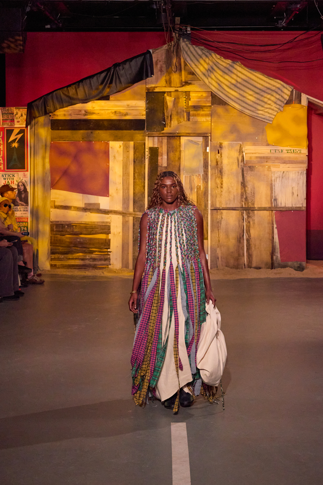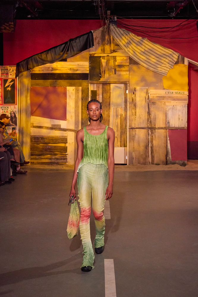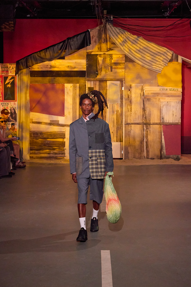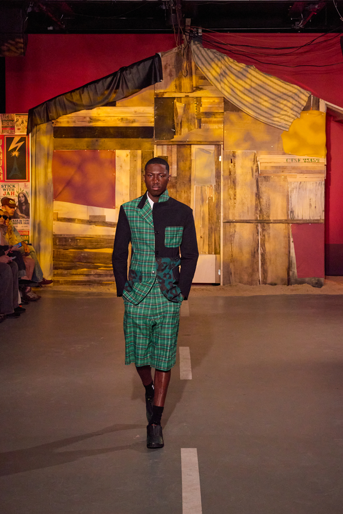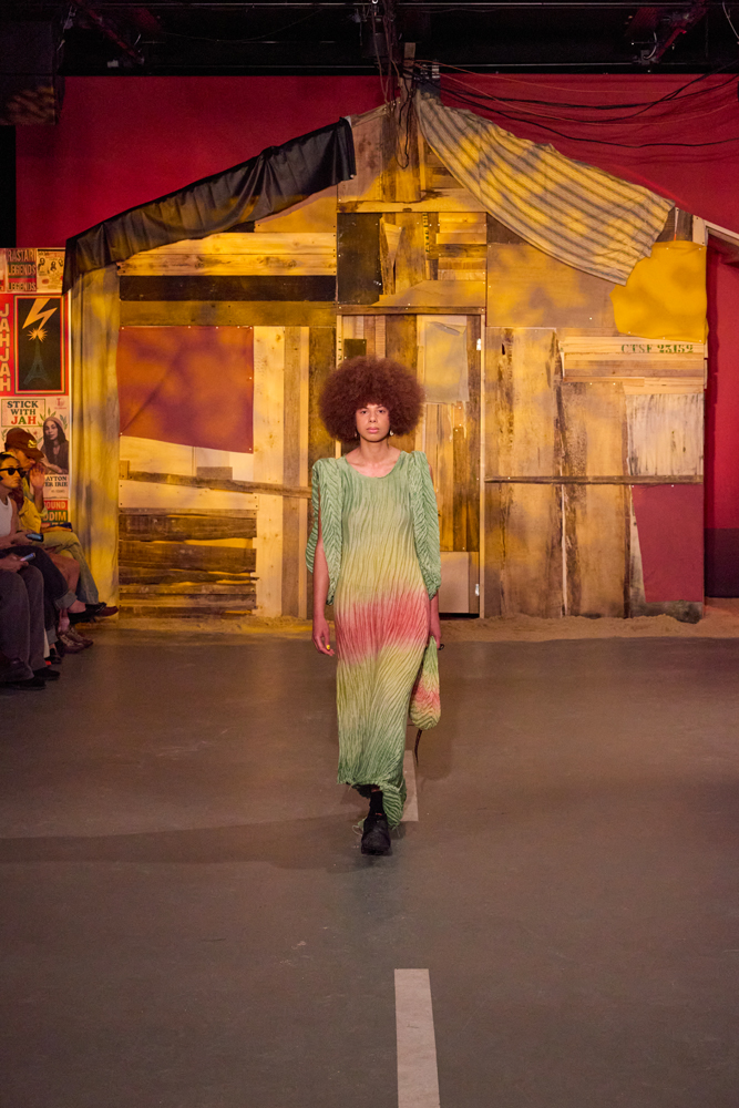 Sur des lignes de basses reggae, les mannequins s’élancent à travers la porte de la cabane. Les dos tantôt voûtés, tantôt fiers, mais toujours dignes. La tête souvent auréolée de couronnes et de dreadlocks, ils adoptent une démarche tranquille, des références à la culture rastafari parsemées sur les vêtements.