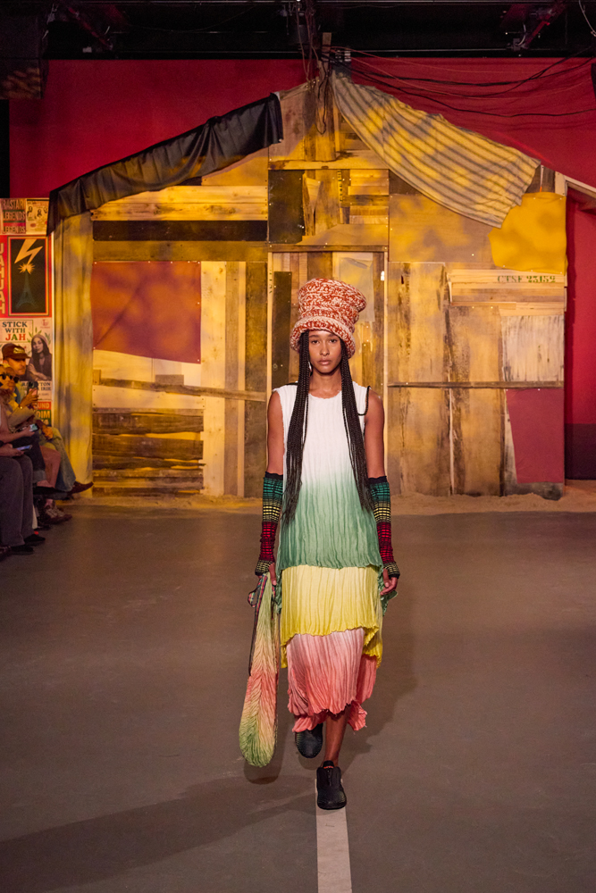 Plus encore, le créateur s’amuse à hybrider les techniques de confection tout au long du défilé. Recouvert des couleurs rastafari, le logo Jah Jah rencontre tour à tour des bonnets en crochet, du jean, des rosaces faites en tartan, des bandes de tissu tressées ainsi que des textiles teints en dégradés de couleur.