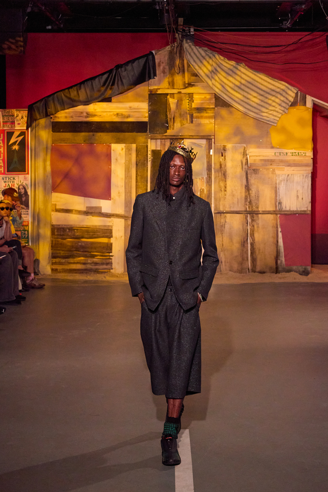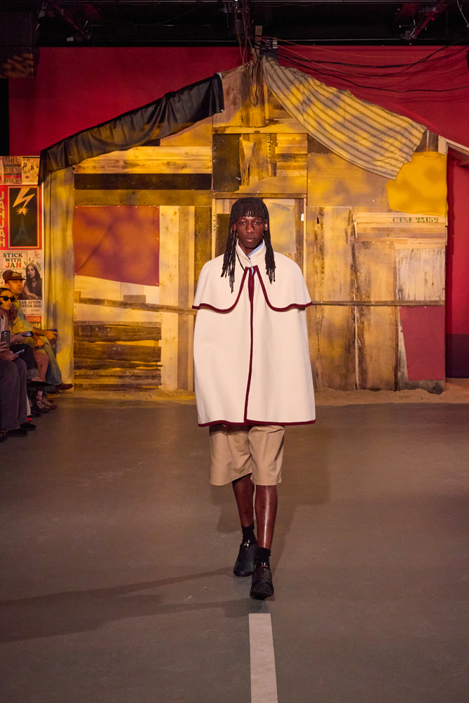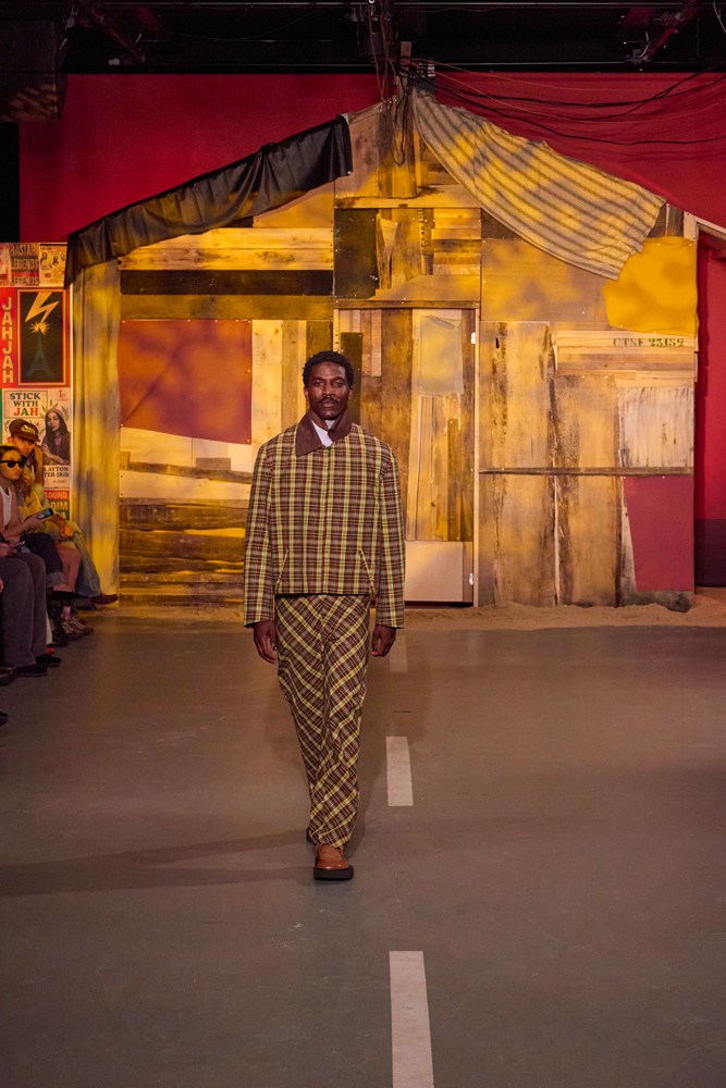 La marque compose donc un vestiaire résolument moderne, toujours baigné de ces influences afro-caribéennes. “Des instruments de mémoire active, évoquant les hommes d’Afrique de l’Ouest des années 1970, les costumes de tailleur portés sur les chantiers en tant qu’armures dignes, les prophètes de Rasta, les leaders culturels oubliés et les artisans du quotidien”, explique le créateur de la marque dans un communiqué de presse.