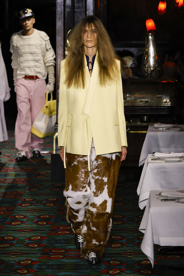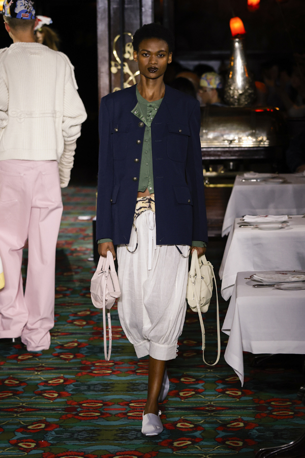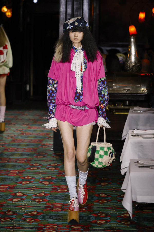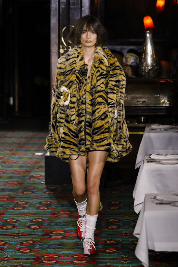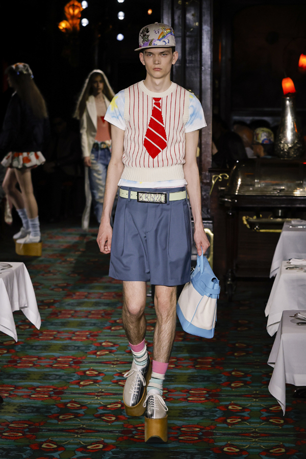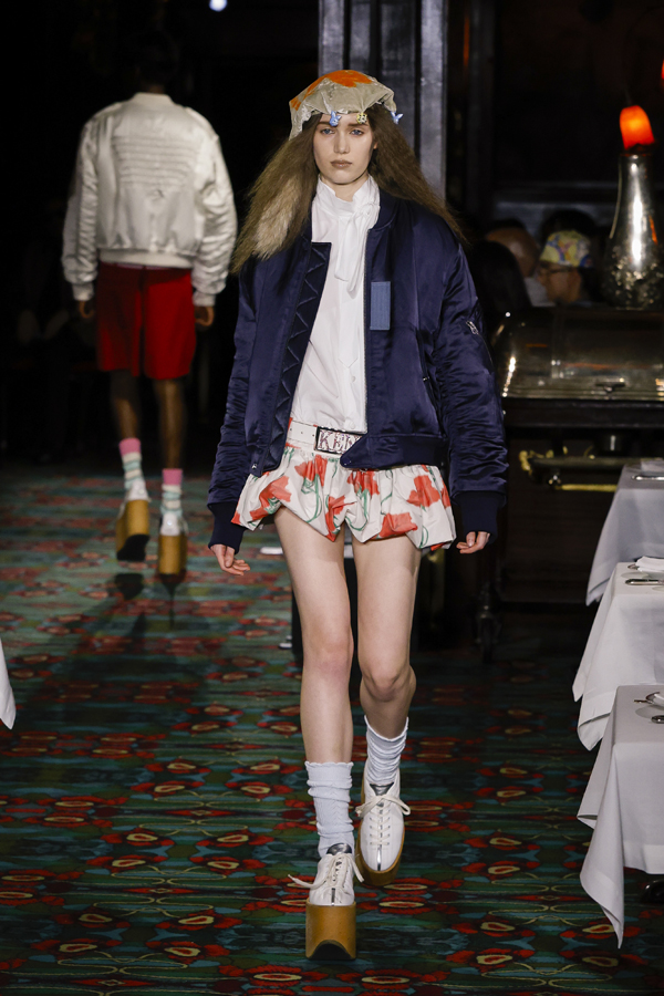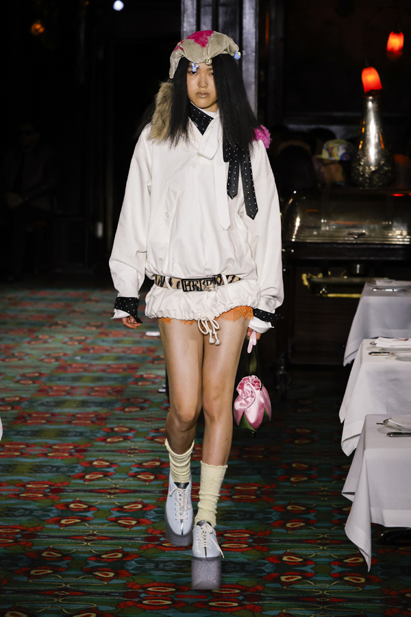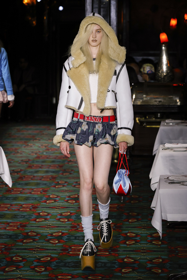 Juste après que chacun ait pris place autour d’une table ou se soit installé au bar, la bande-son imaginé par Hiroshi Fujiwara, alliant Daft Punk et Beatles, a réveillé la salle. À travers des pièces ludiques et régressives comme des hoodies peluches, des chaussures à plateforme façon boules de neige, des sacs boule en raphia à tête de chien, un débardeur imprimé d’une cravate coloriée… Nigo continue de faire ce qu’il excelle à faire depuis son arrivée chez Kenzo il y a quatre ans : libérer la mode de ses carcans.