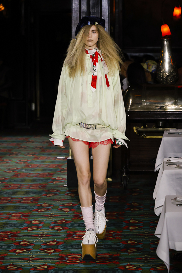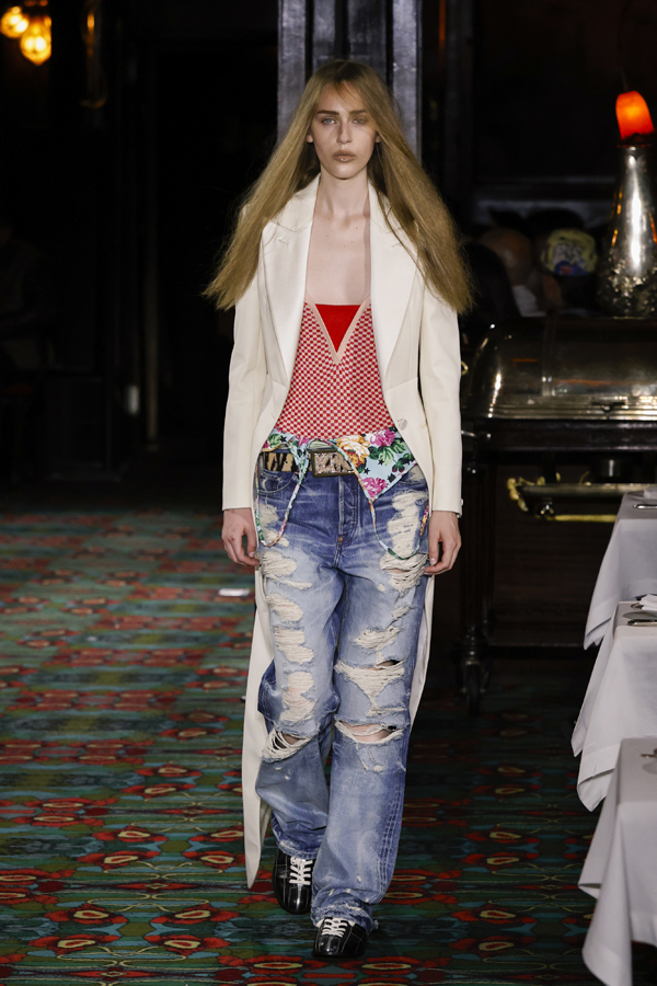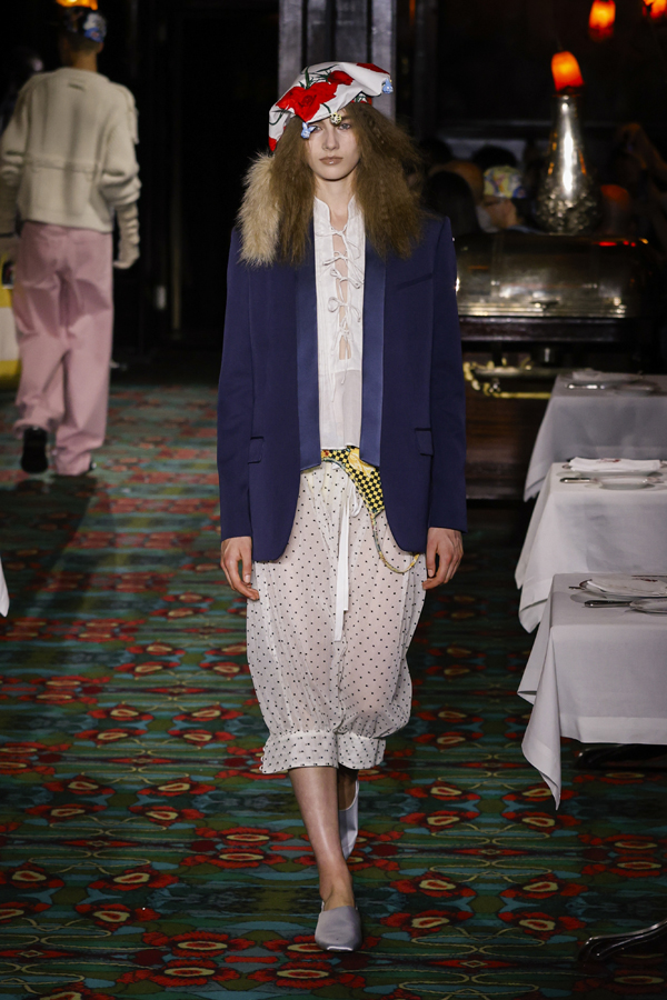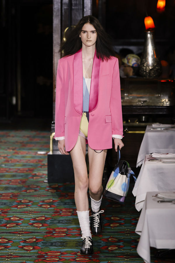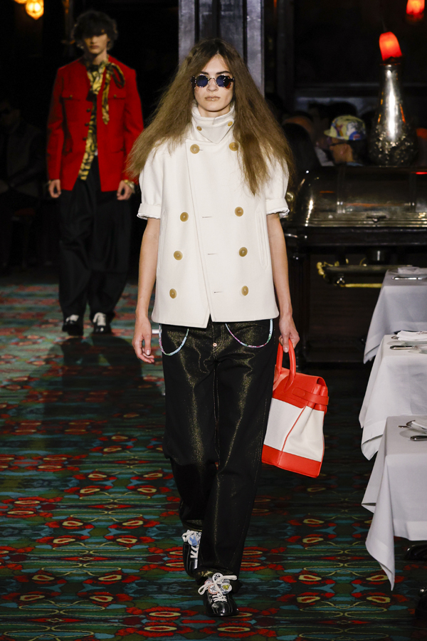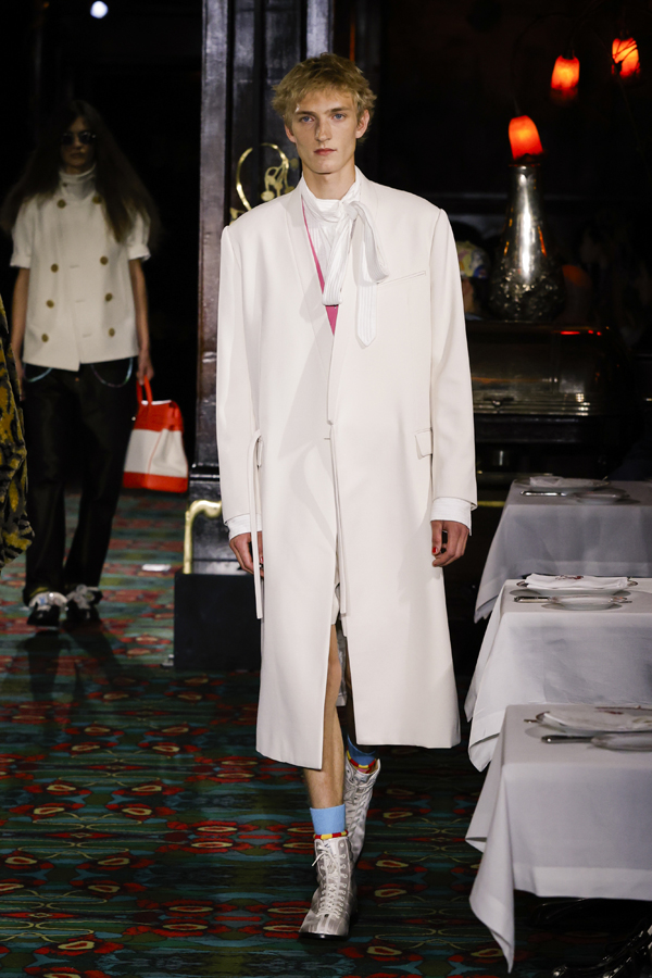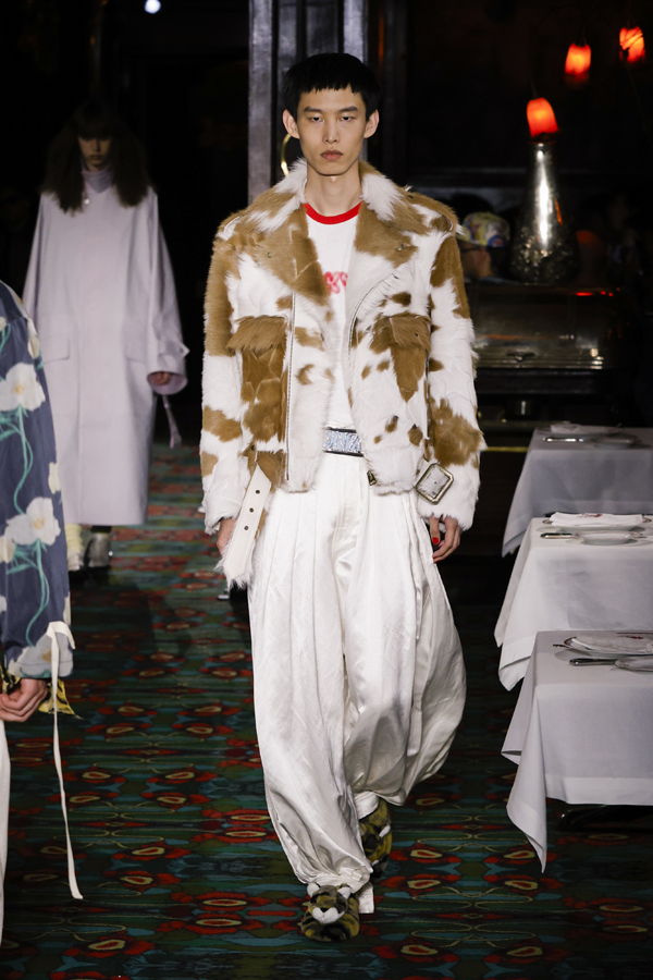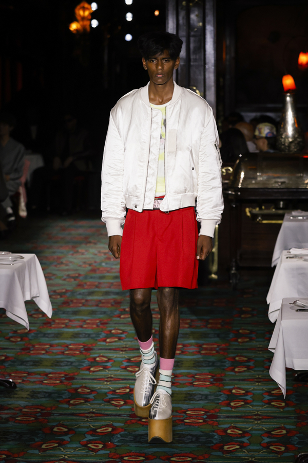 Juste après que chacun ait pris place autour d’une table ou se soit installé au bar, la bande-son imaginé par Hiroshi Fujiwara, alliant Daft Punk et Beatles, a réveillé la salle. À travers des pièces ludiques et régressives comme des hoodies peluches, des chaussures à plateforme façon boules de neige, des sacs boule en raphia à tête de chien, un débardeur imprimé d’une cravate coloriée… Nigo continue de faire ce qu’il excelle à faire depuis son arrivée chez Kenzo il y a quatre ans : libérer la mode de ses carcans.