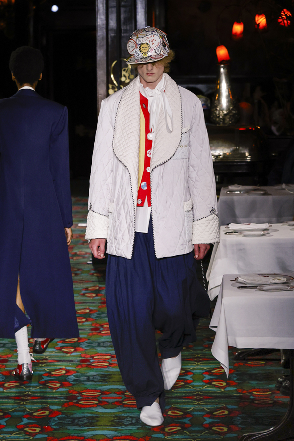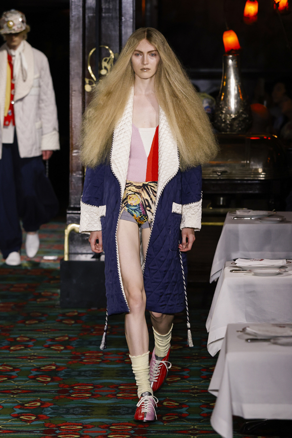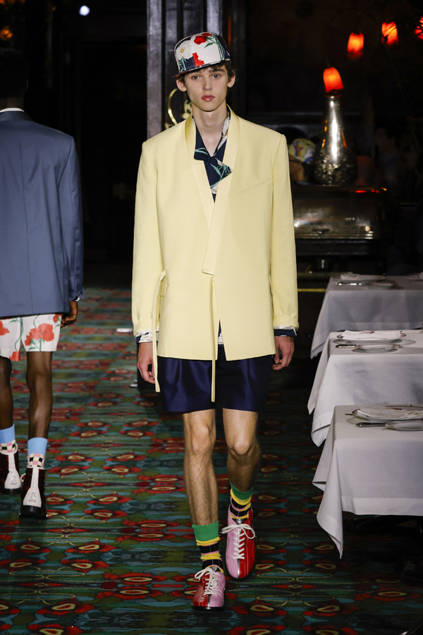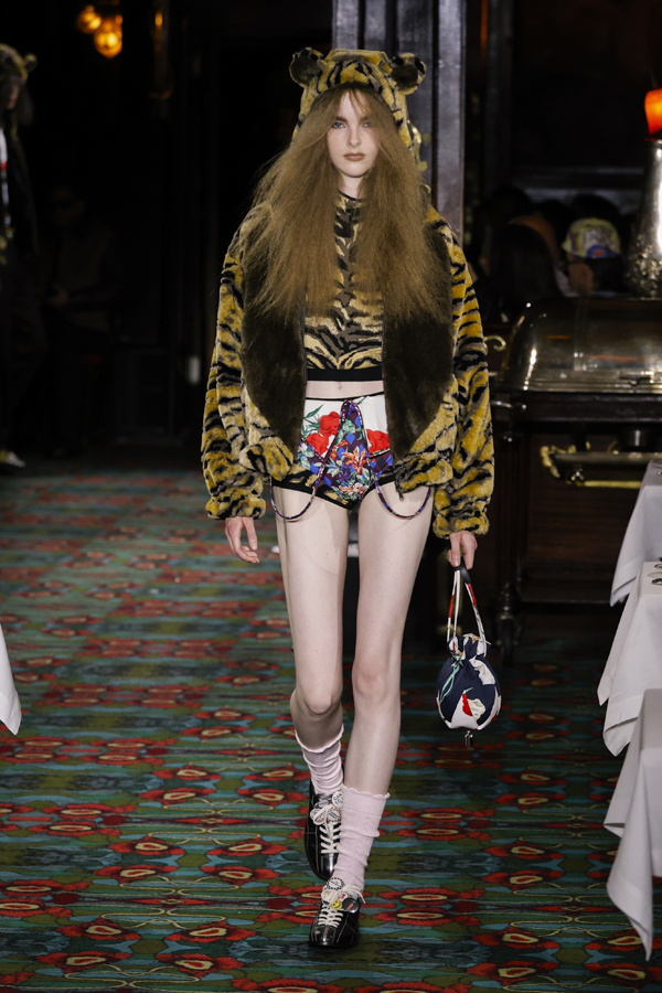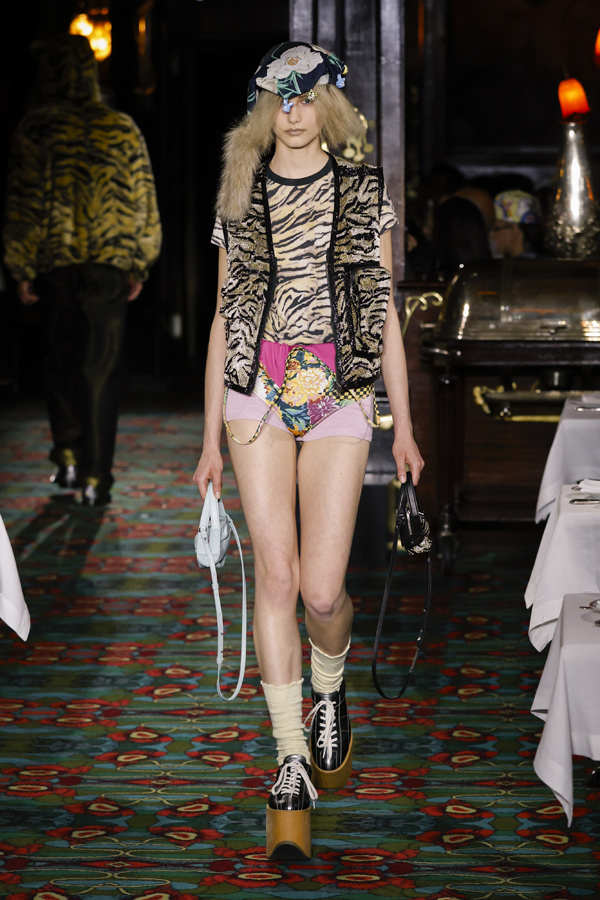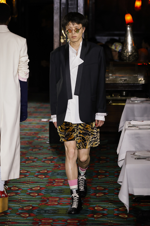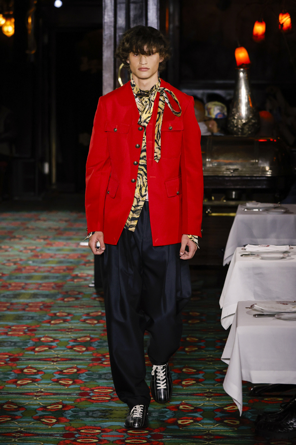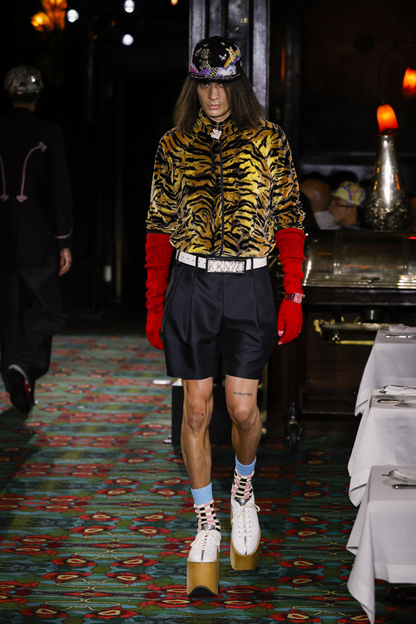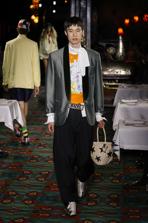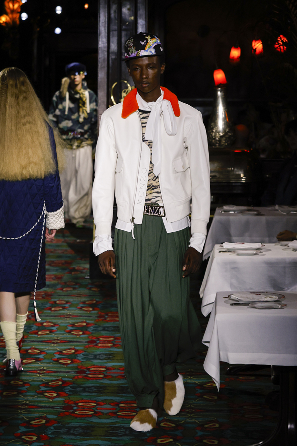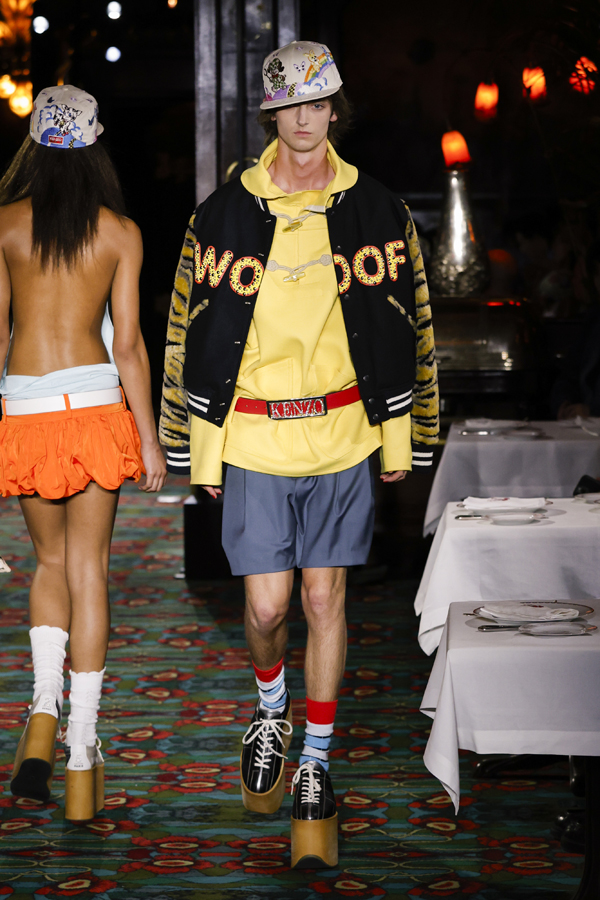 Il est quasiment impossible de saisir toute la richesse de cette collection tant elle regorge de références au passé de Kenzo et de détails amusants. Parmi eux : des chaussures de bowling, des pin’s épinglés sur les casquettes – clin d’œil à l’invitation reçue quelque jours plus tôt – ou encore des maillots de bain imprimé léopard enfilés à moitié, témoins d’une envie précipitée de se jeter à l’eau.