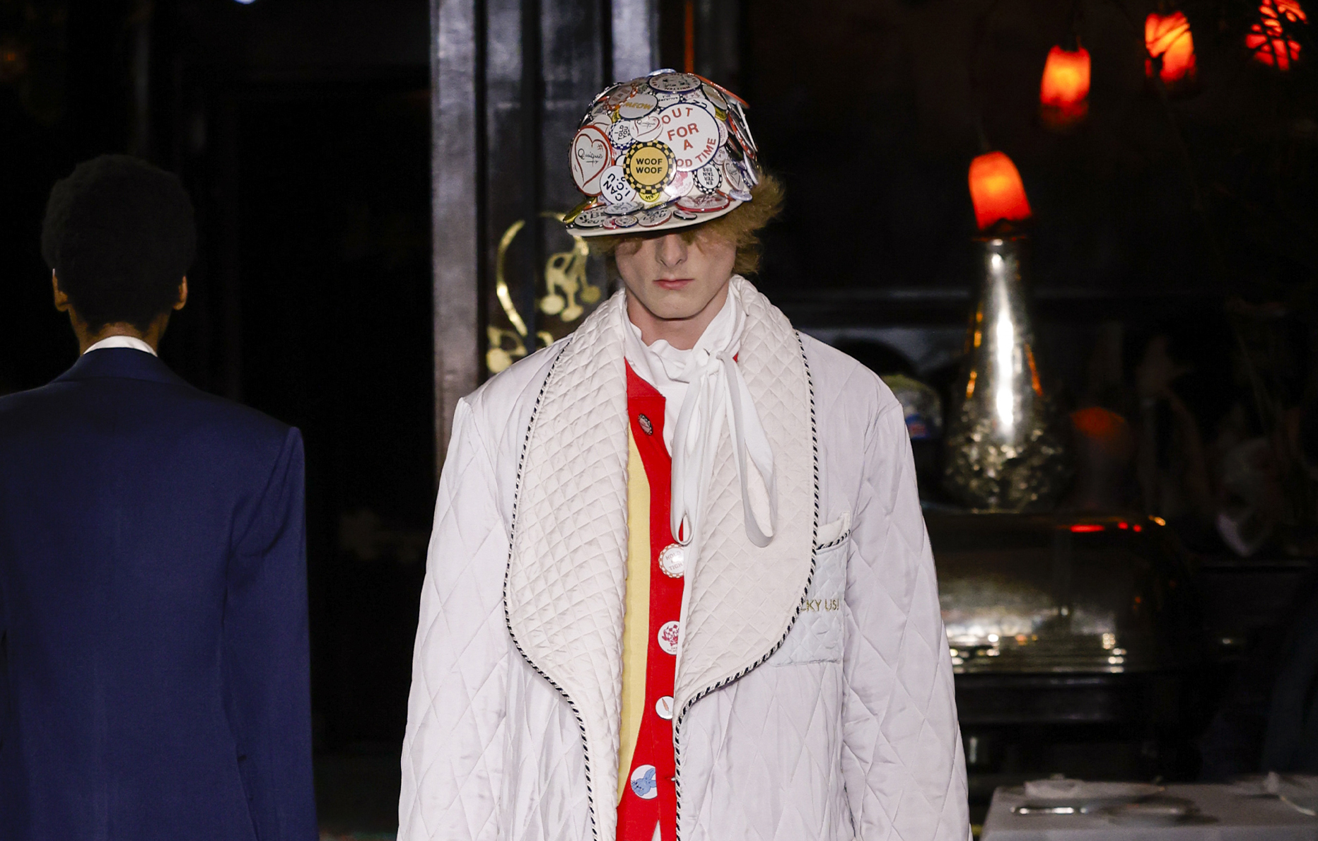 Il est quasiment impossible de saisir toute la richesse de cette collection tant elle regorge de références au passé de Kenzo et de détails amusants. Parmi eux : des chaussures de bowling, des pin’s épinglés sur les casquettes – clin d’œil à l’invitation reçue quelque jours plus tôt – ou encore des maillots de bain imprimé léopard enfilés à moitié, témoins d’une envie précipitée de se jeter à l’eau.