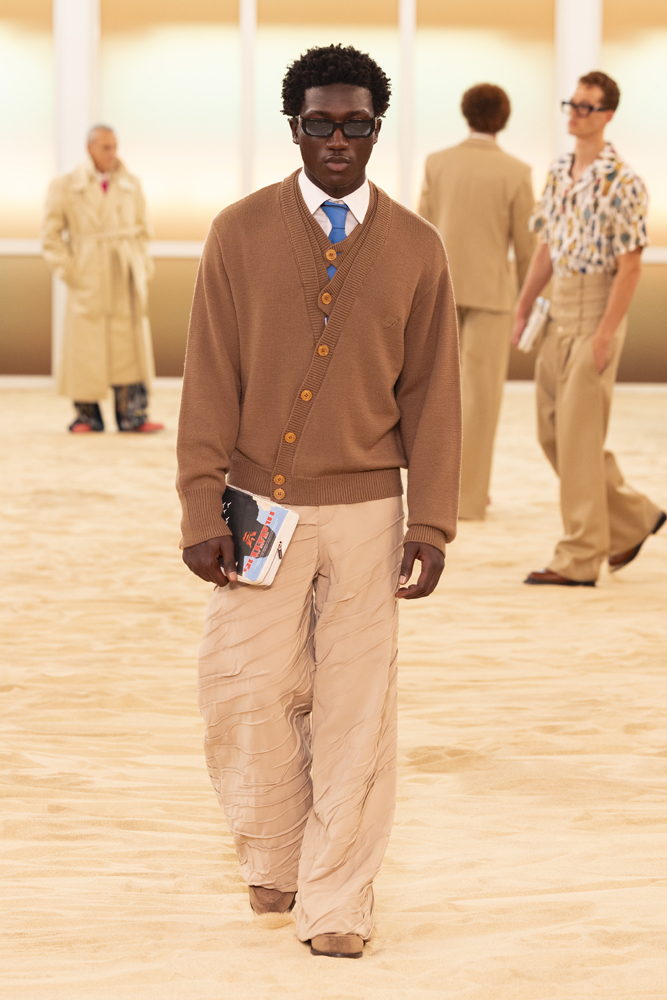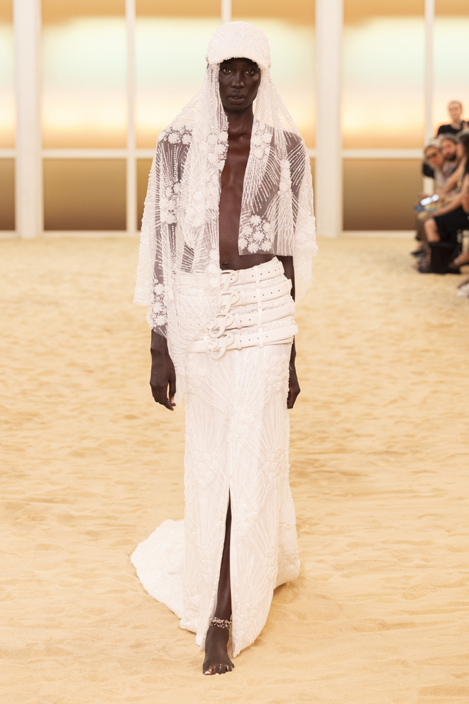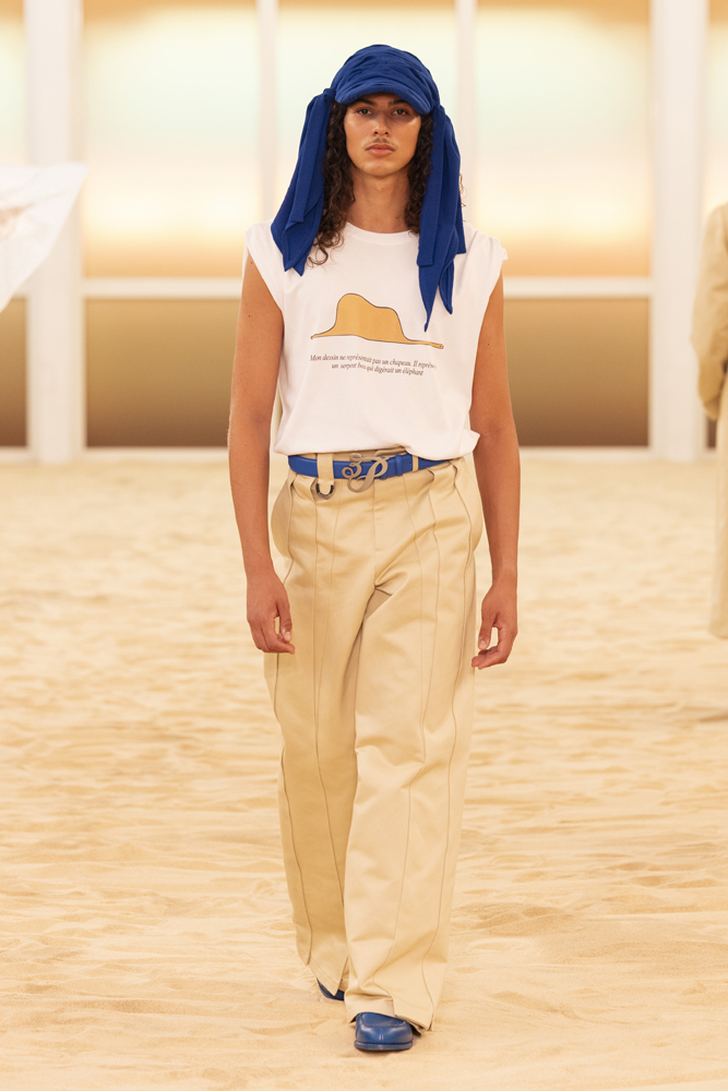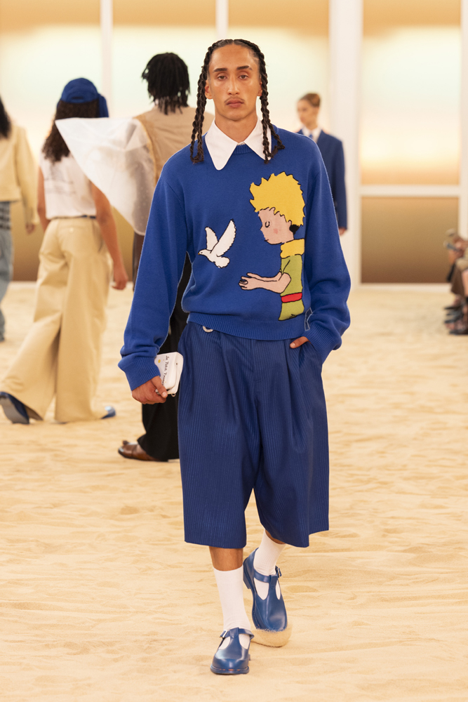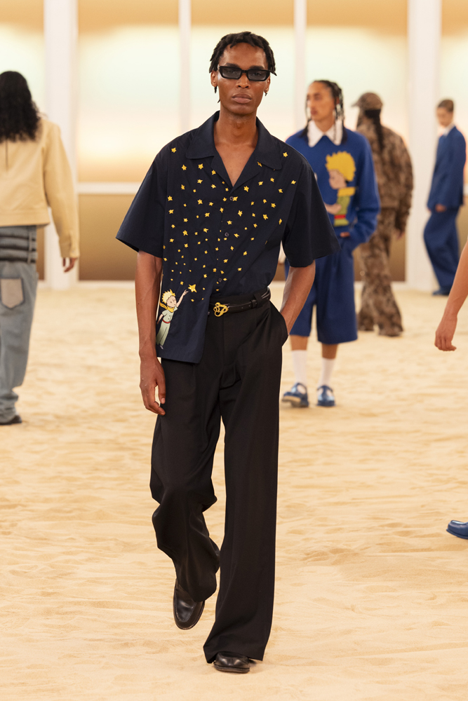 “Je pense que l’on est tous ce voyageur perdu dans le désert à la recherche de sens, à la recherche de but dans nos vies”, confie le créateur parisien en backstage. C’est cette quête, teintée d’introspection, qui l’a poussé à convoquer l’imaginaire du Petit Prince, [roman à succès d’Antoine de Saint-Exupéry publié en 1943, ndlr]. Comme une boussole émotionnelle. “Le Petit Prince, c’est le début de l’histoire. Ce personnage qui s’écrase dans le désert en avion et qui erre à la recherche de sens.”