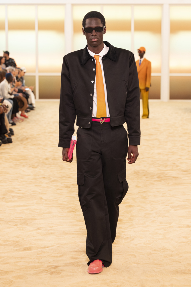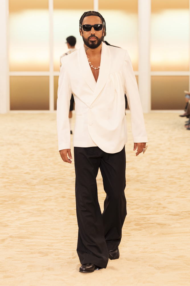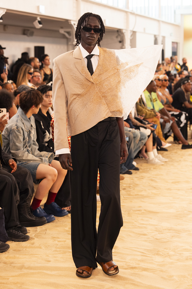 Après avoir fait souffler une Quiet Storm sur la mode en janvier dernier, c’est cette fois dans un désert brûlant qu’Émeric Tchatchoua déploie sa nouvelle vision du vestiaire masculin. Ce mardi 25 juin, alors qu’une chaleur caniculaire s’abat sur la capitale, le fondateur de 3.Paradis fait défiler ses silhouettes au ralenti, comme en plein mirage, dans un décor recouvert de sable. La scène évoque une traversée, un pèlerinage intérieur.