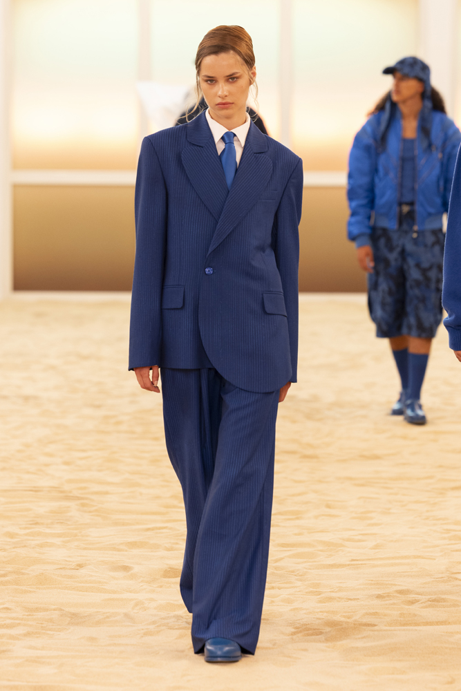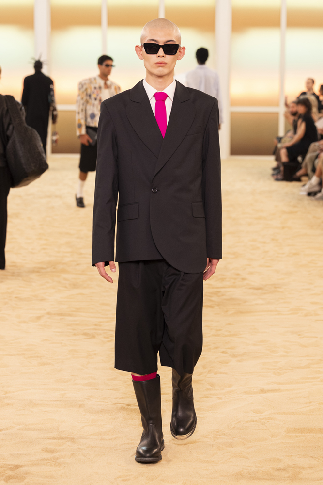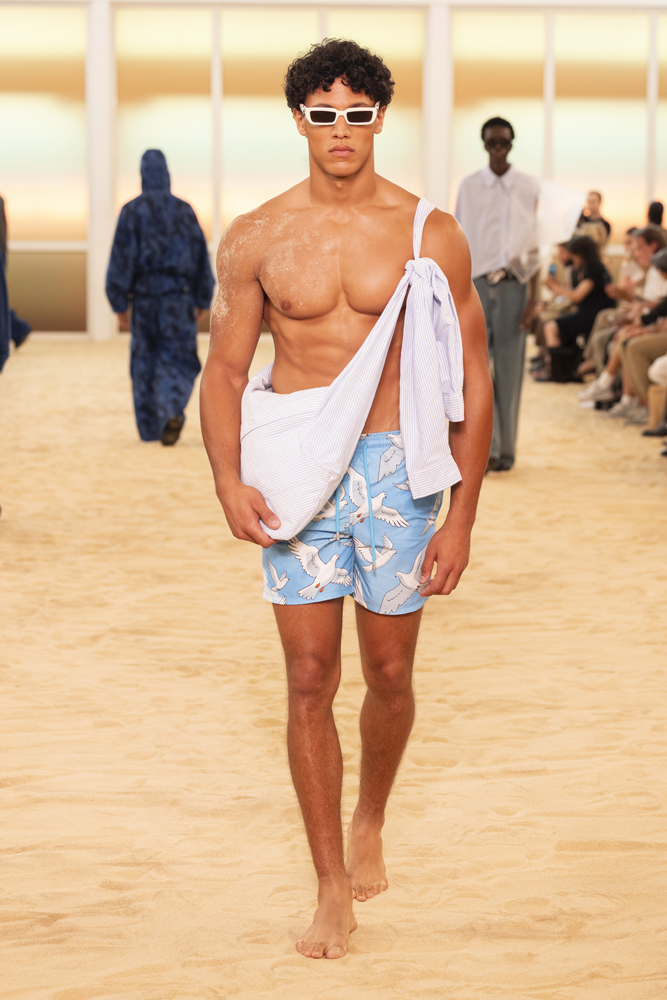 En plus de ces guests, deux nouvelles collaborations viennent souligner la versatilité de l’homme 3.Paradis. Des souliers J.M. Weston revisités en fuchsia et bleu touareg, mais aussi une capsule ensoleillée avec la marque de maillots de bain Vilebrequin. “On a imaginé un Eden, un paradis et une ligne spéciale dédiée au Petit Prince, fil rouge de ce défilé.”