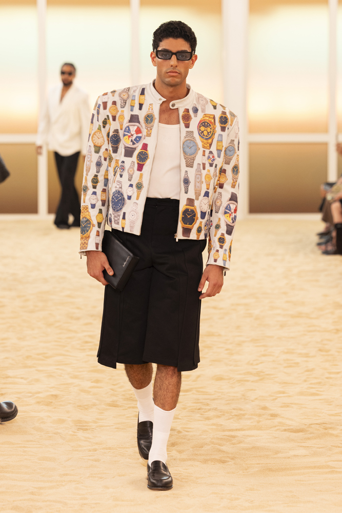 Une veste recouverte de montres évoque le poids du temps. Une autre, aux manches froissées, semble figée dans la chaleur du jour. Le tailoring, toujours présent, se mêle au streetwear dans un équilibre plus maîtrisé que jamais. Le vestiaire prend en maturité, mais sans rien perdre de son ADN. Comme souvent chez 3.Paradis, les symboles se mêlent à des références personnelles.