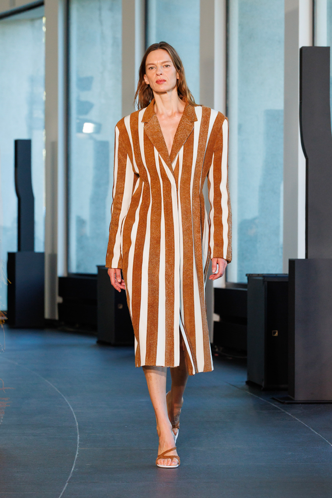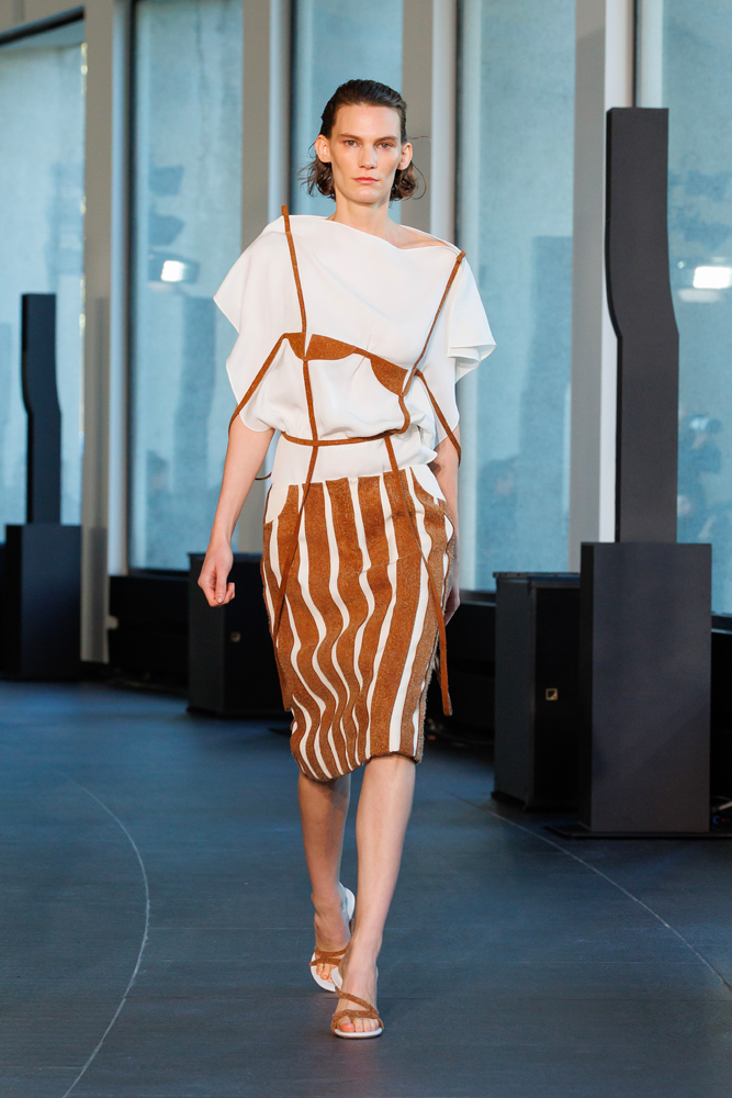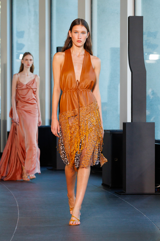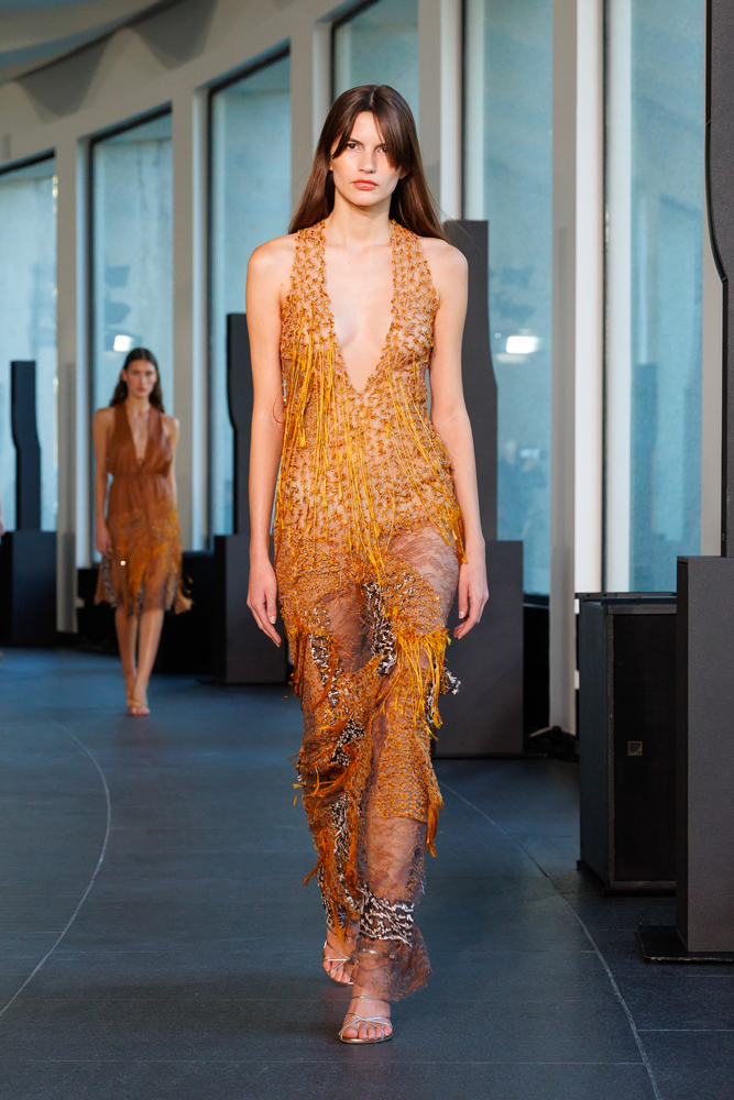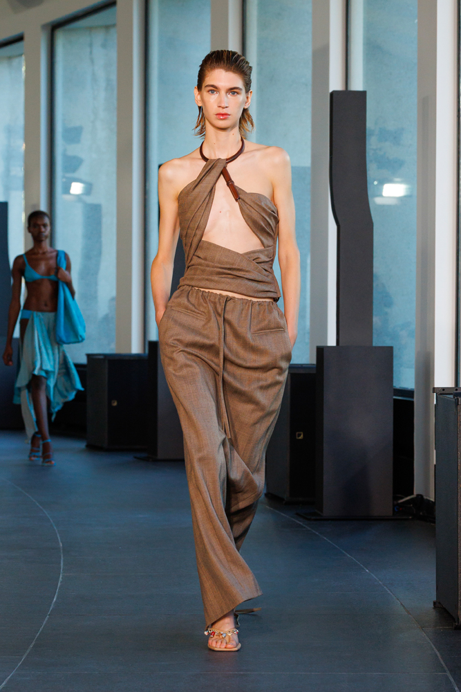 Dans le sillage du glamour et du chic de Saint Laurent, ce total-look cuir nous séduit immédiatement. On adore l’allure affutée de cette silhouette façonnée à partir d’une seule et même matière, associant un jaune moutarde à un brun clair. Les drapés et les plis épousant le corps de la mannequin évoquent d’ailleurs l’une des inspirations de Christopher Esber pour le printemps-été 2026 : les toiles de l’artiste américain John Kacere.