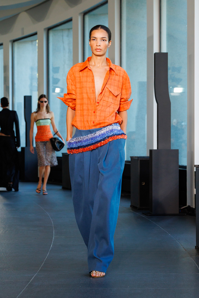 À l’instar d’un épais pantalon bleu nuit à la coupe oversized contemporaine, entièrement façonné à partir d’écailles de poisson appliquées à la main – nécessitant plus de 500 heures de travail. Une ornementation fascinante, à l’œil comme au toucher… Et que l’on retrouve également sur une délicate silhouette en tissu transparent. Les écailles ocre et bleu sont finement brodées sur la jupe et sur le haut, ou encore sur la taille d’un élégant pantalon à pinces.
