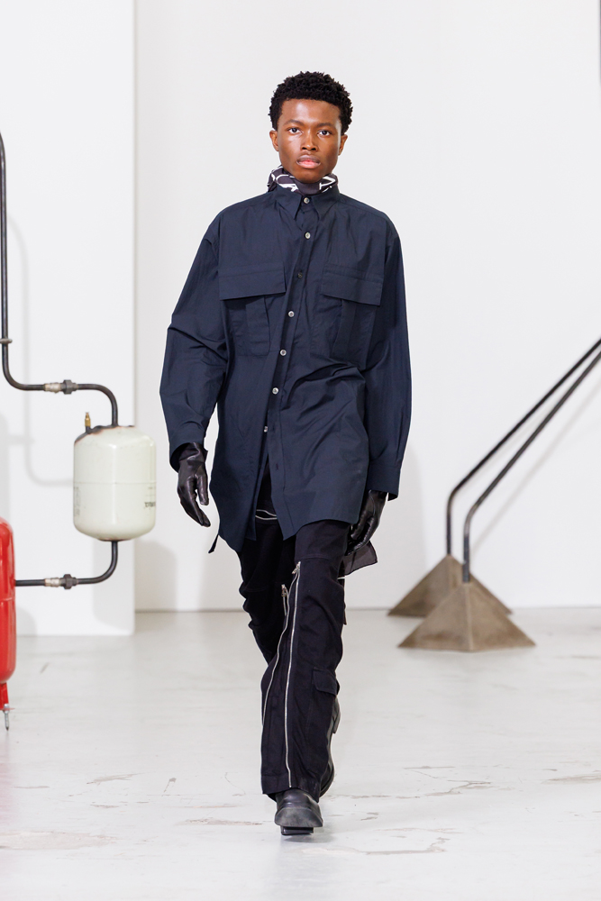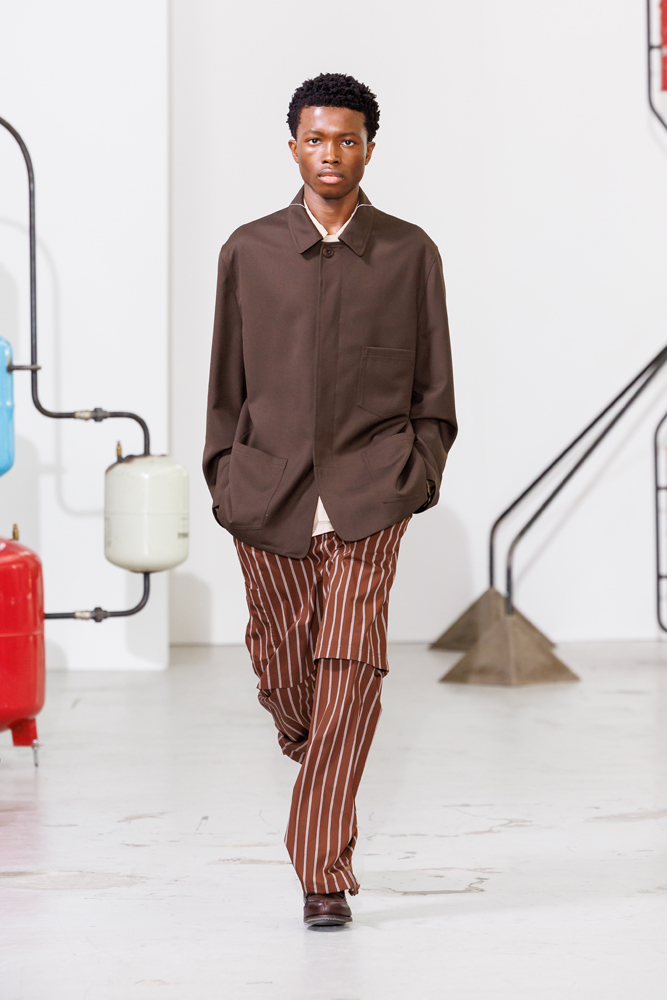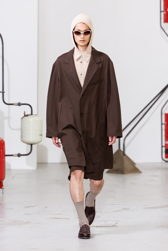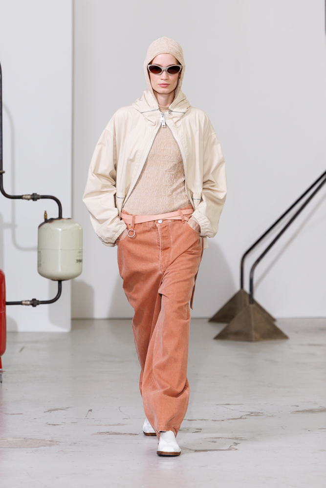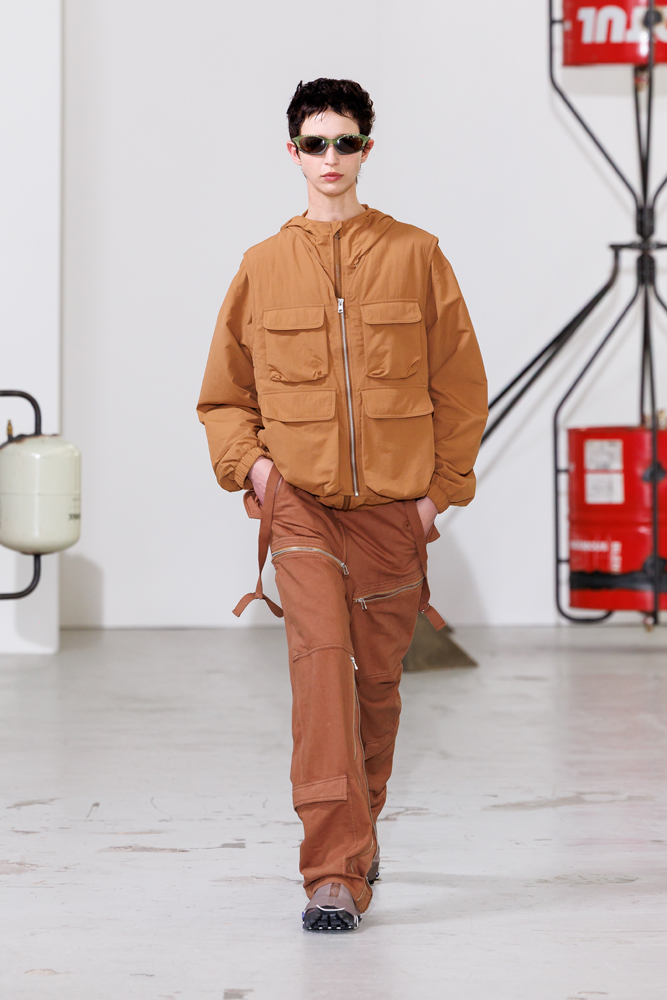 Chemises à capuche, ponchos fluides, ensembles en denim, gilets multipoches et raincoats lavés à la javel façonnent ainsi une silhouette à la fois technique et élégante. L’ensemble oscille dans une palette de couleurs organiques : du beige, à l’ocre en passant par le marron. Études Studios n’oublie néanmoins pas ses fondamentaux : le tailoring dialogue avec une gamme plus workwear, avant de glisser vers des jeans à la coupe slim assumée.