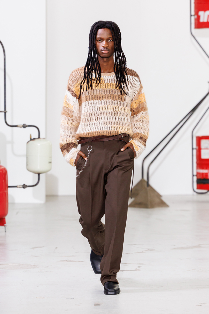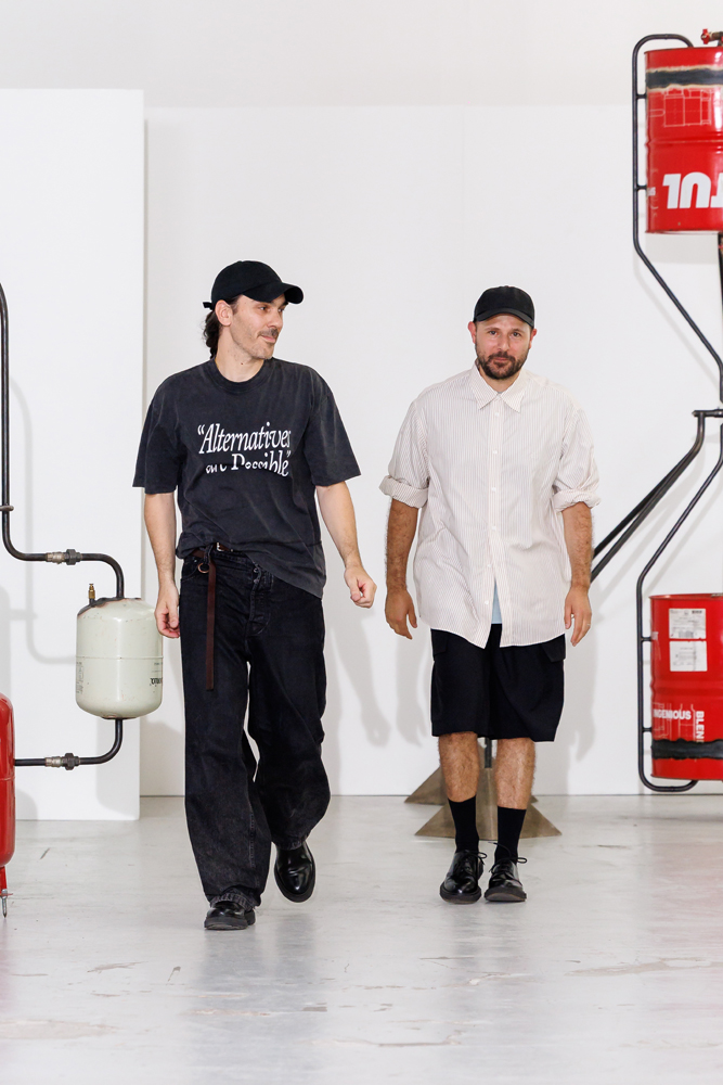 Comme souvent, le trio devenu duo (fraîchement séparé de José Lamali, qui a quitté l’aventure en début d’année) puise son inspiration dans une œuvre ou un courant artistique. Cette fois, c’est aux figures du mouvement land art qu’ils s’intéressent. À l’image de Nancy Holt et notamment son Sun Tunnels installé en 1976, qui a lancé l’étincelle. “Nous avons eu envie de parler de l’extérieur. Le travail de Nancy Holt nous a inspirés une collection qui développe un vestiaire destiné à l’outdoor et à cet imaginaire-là ”, expliquent les créateurs Aurélien Arbet et Jérémie Égry en backstage.