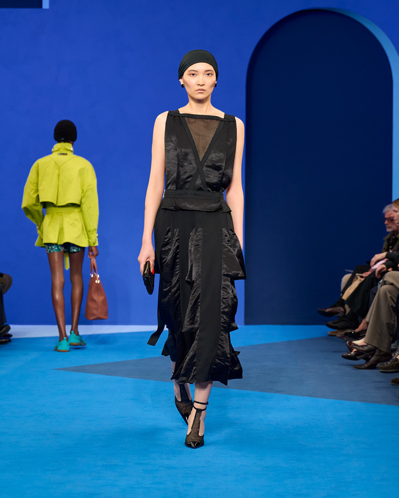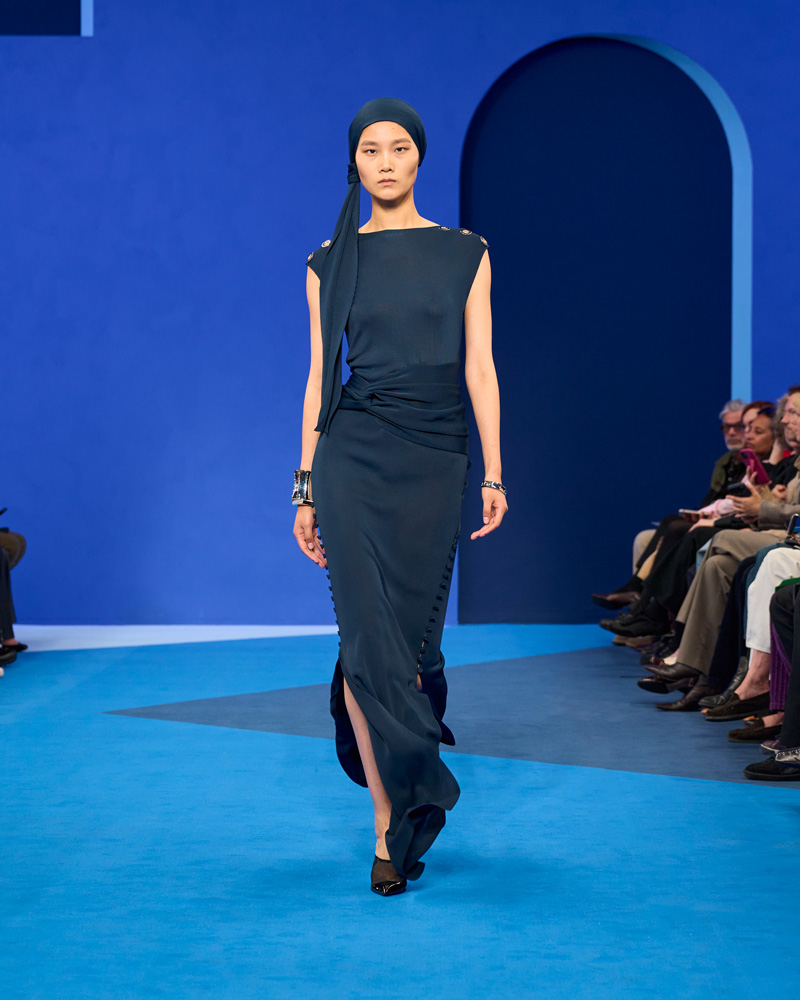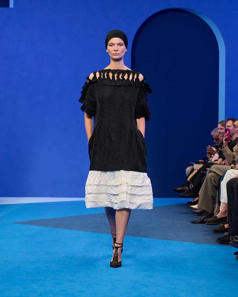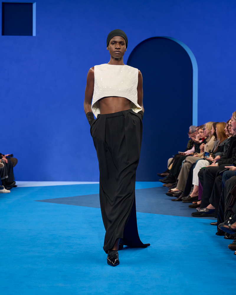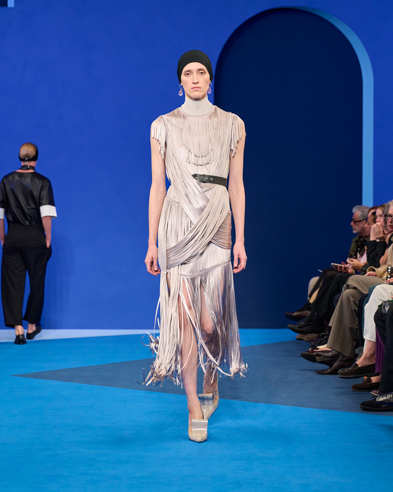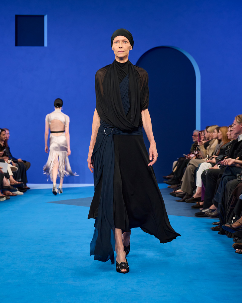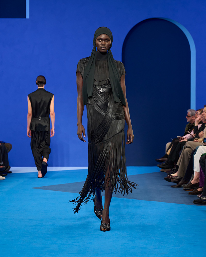 Cheveux retenus par un foulard, mains dans les poches, c’est la mise en mouvement de la modernité et de la sophistication qui animait les pièces imaginées par Jeanne Lanvin que l’on perçoit. La silhouette suivante est taillée dans un tissu noir qui s’évase en franges, autre clin d’œil à cette époque où le jazz fait danser Paris. De son côté, c’est un remix du titre Fade to Grey du groupe new wave britannique Visage qui sert de bande originale au défilé.