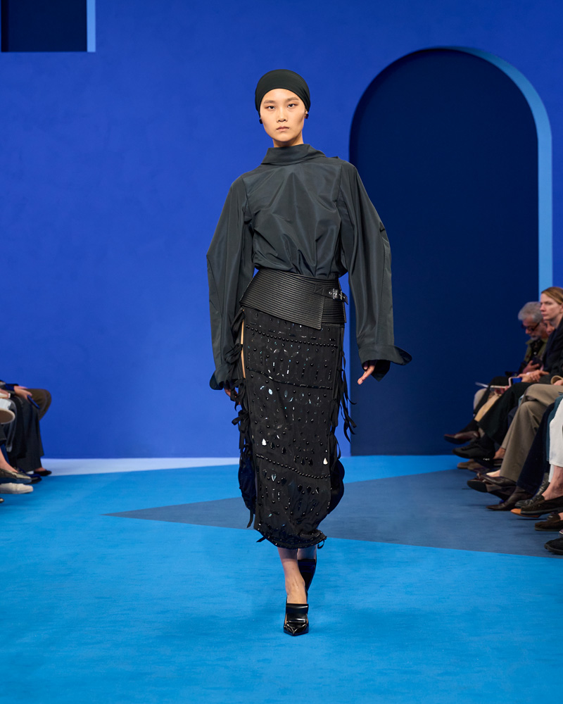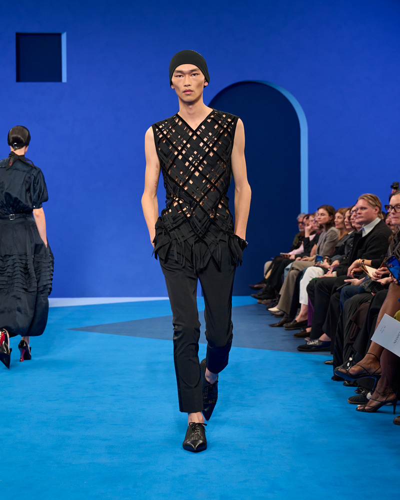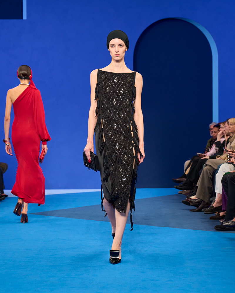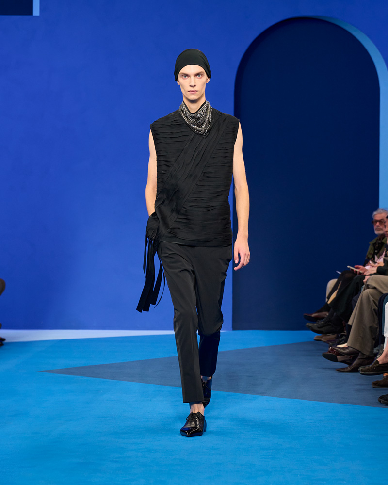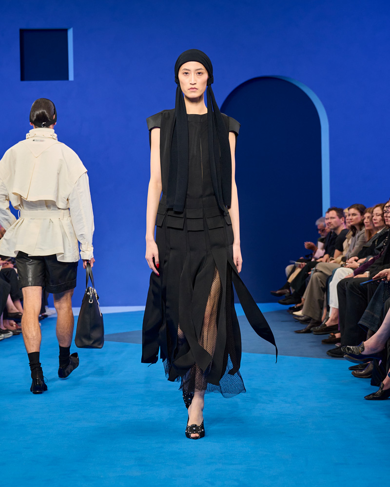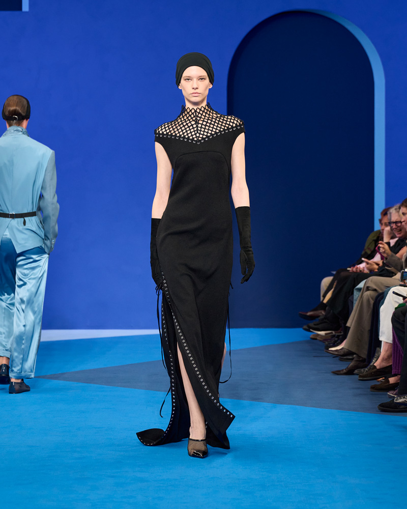Cheveux retenus par un foulard, mains dans les poches, c’est la mise en mouvement de la modernité et de la sophistication qui animait les pièces imaginées par Jeanne Lanvin que l’on perçoit. La silhouette suivante est taillée dans un tissu noir qui s’évase en franges, autre clin d’œil à cette époque où le jazz fait danser Paris. De son côté, c’est un remix du titre Fade to Grey du groupe new wave britannique Visage qui sert de bande originale au défilé.