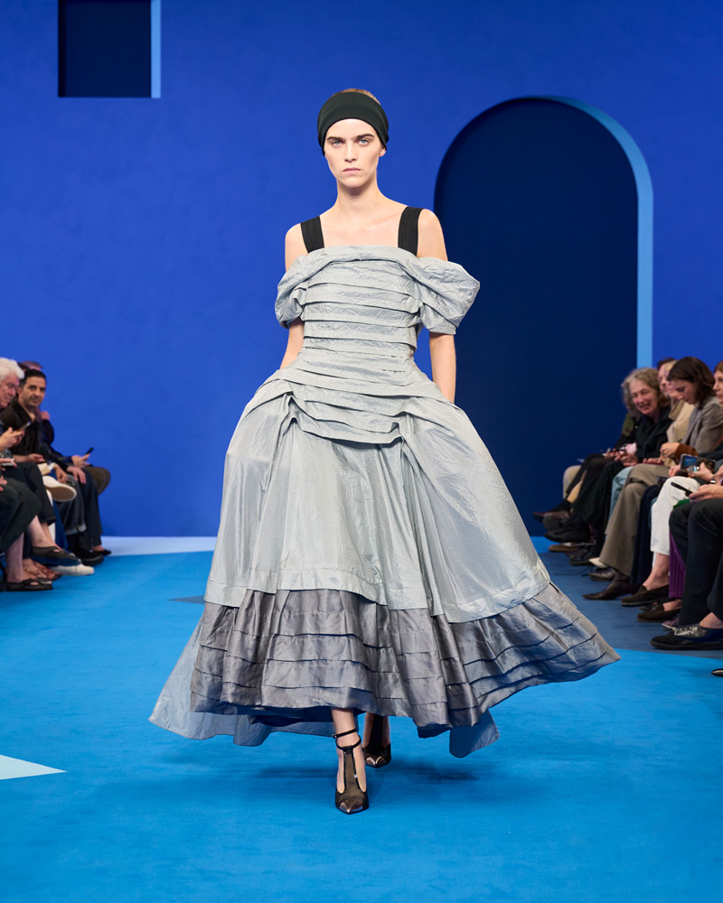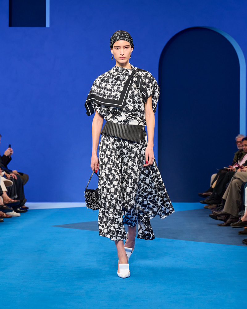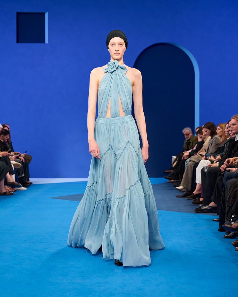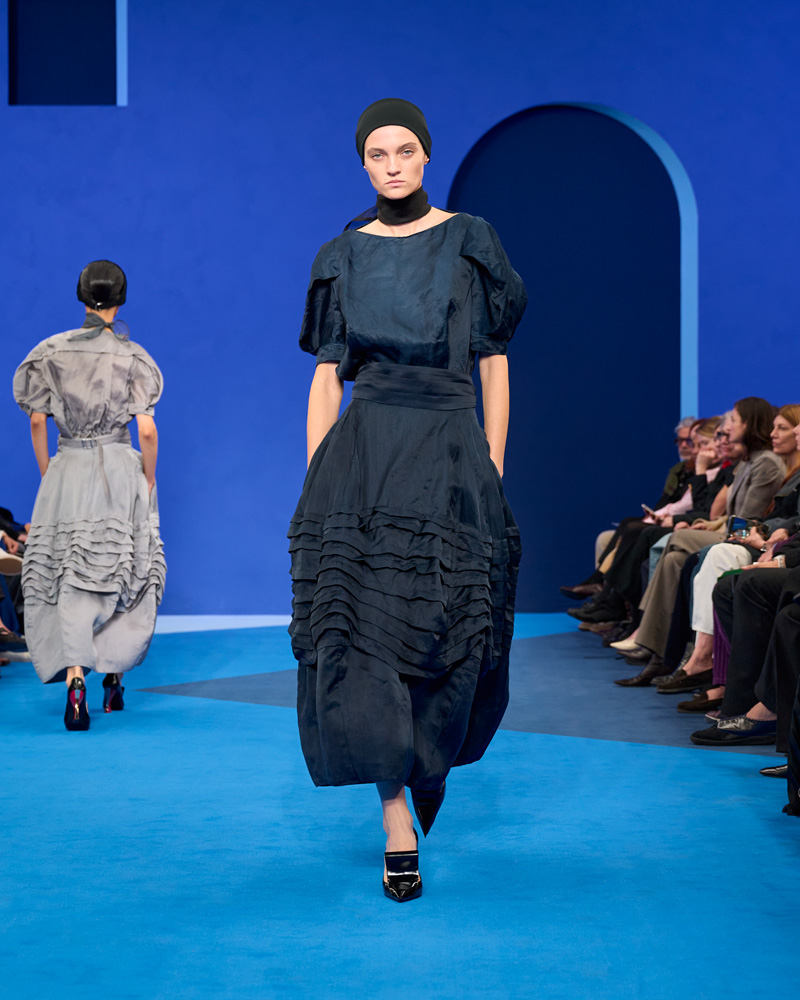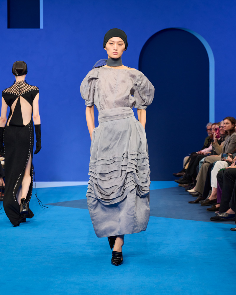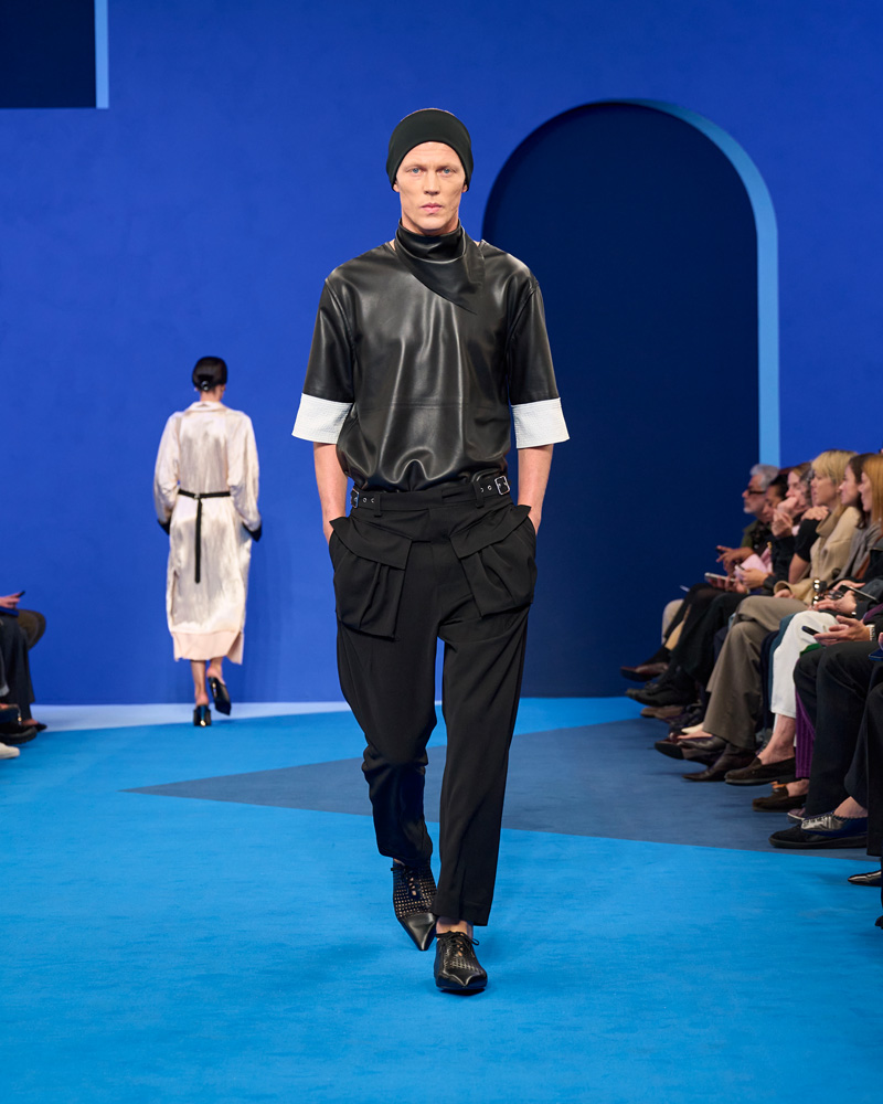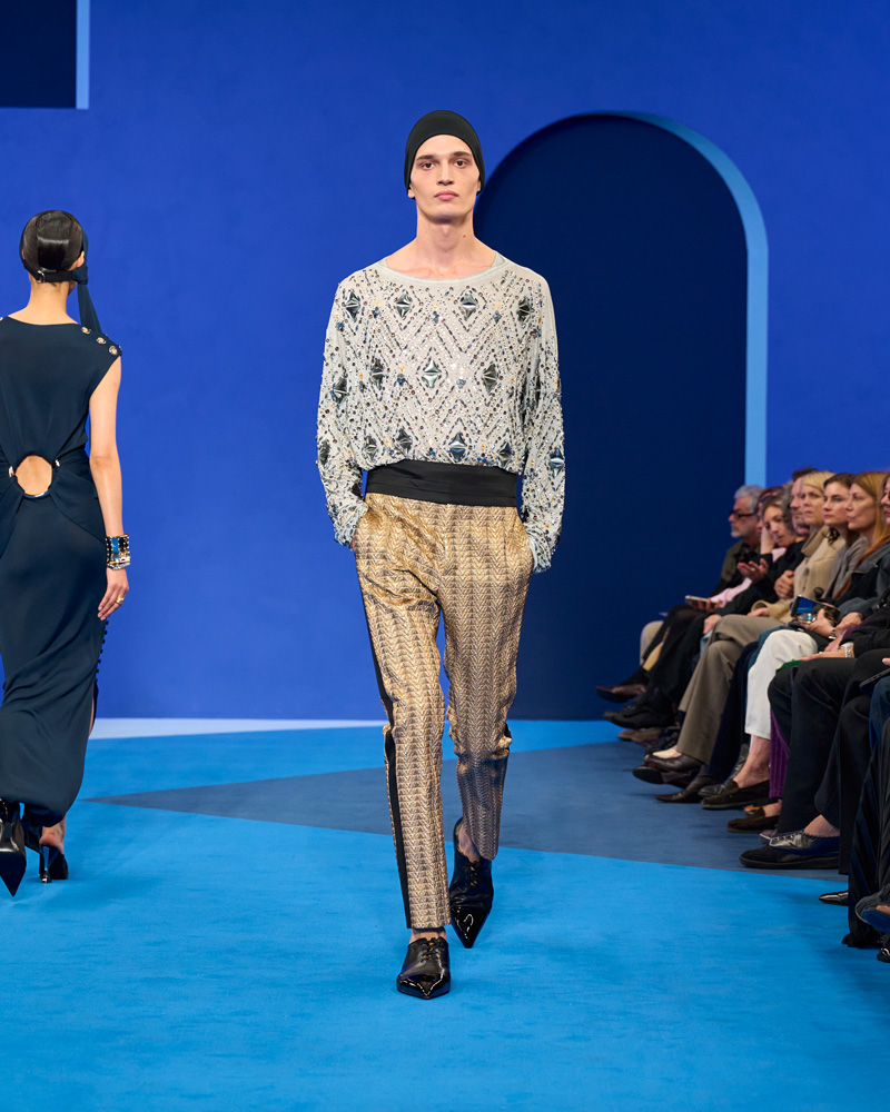 Cheveux retenus par un foulard, mains dans les poches, c’est la mise en mouvement de la modernité et de la sophistication qui animait les pièces imaginées par Jeanne Lanvin que l’on perçoit. La silhouette suivante est taillée dans un tissu noir qui s’évase en franges, autre clin d’œil à cette époque où le jazz fait danser Paris. De son côté, c’est un remix du titre Fade to Grey du groupe new wave britannique Visage qui sert de bande originale au défilé.
