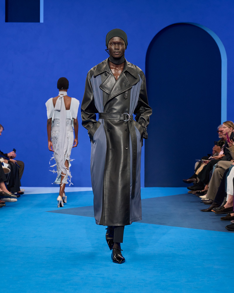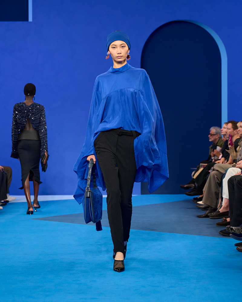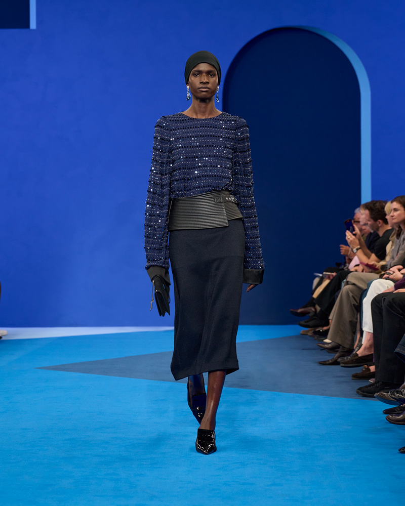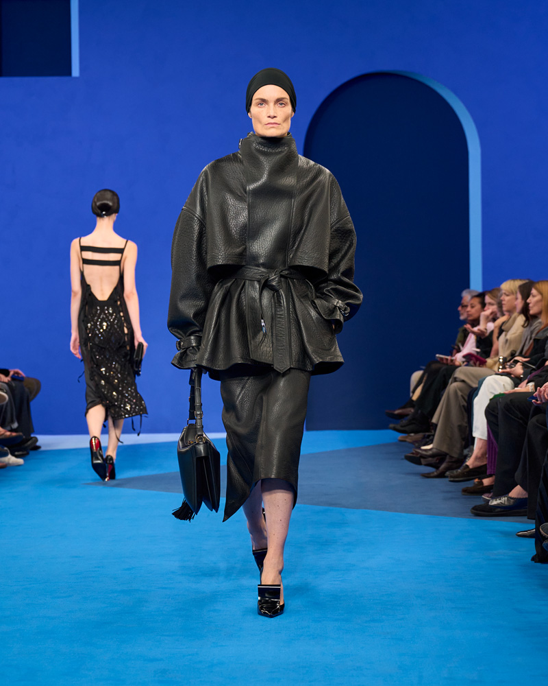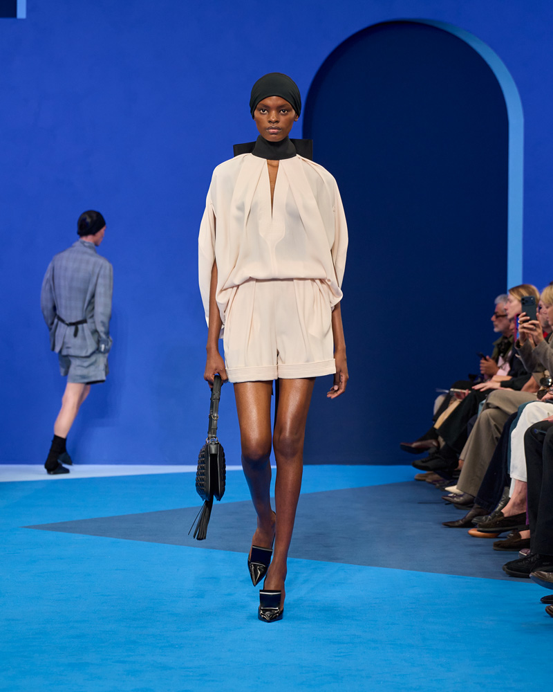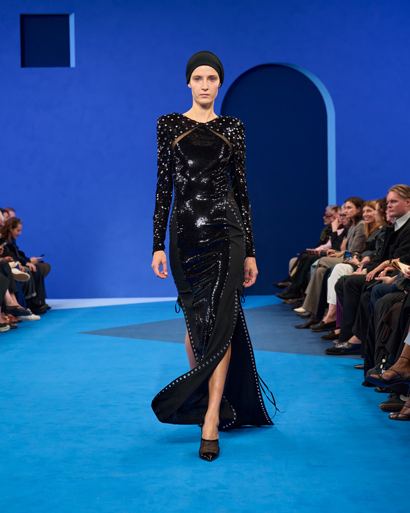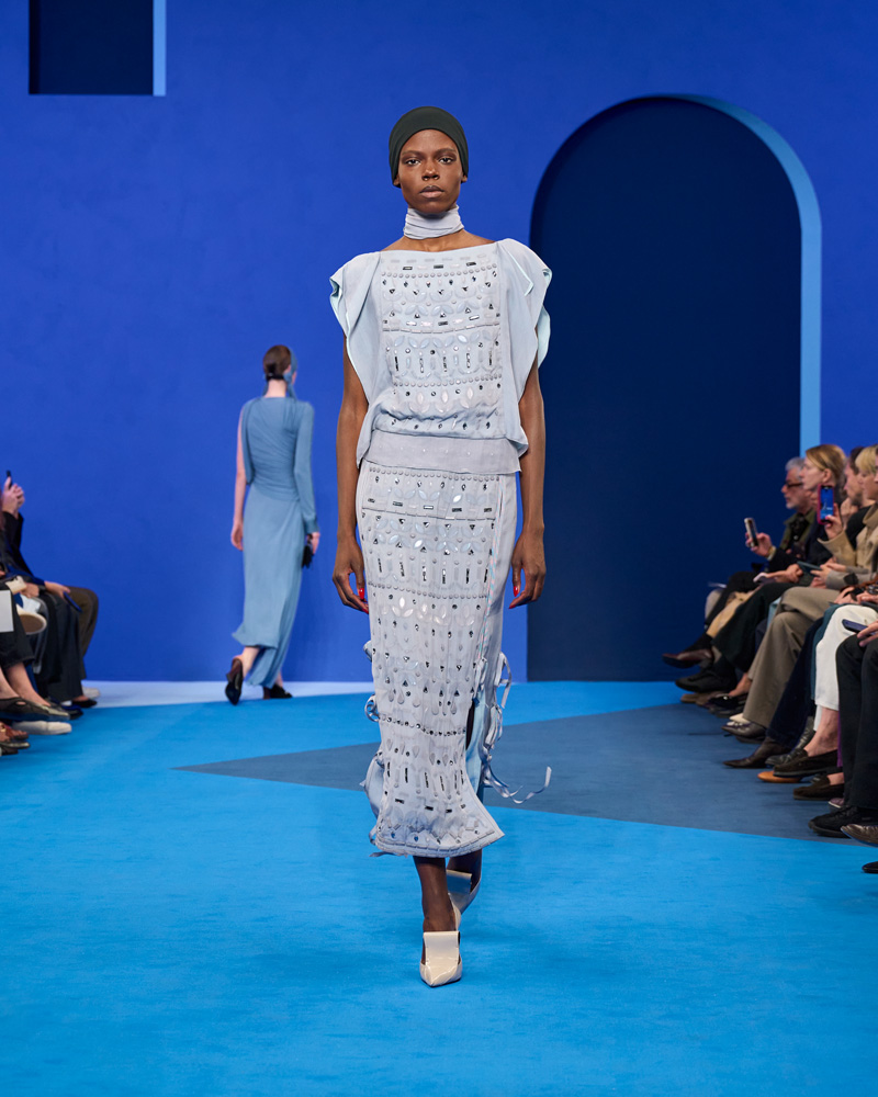 Cheveux retenus par un foulard, mains dans les poches, c’est la mise en mouvement de la modernité et de la sophistication qui animait les pièces imaginées par Jeanne Lanvin que l’on perçoit. La silhouette suivante est taillée dans un tissu noir qui s’évase en franges, autre clin d’œil à cette époque où le jazz fait danser Paris. De son côté, c’est un remix du titre Fade to Grey du groupe new wave britannique Visage qui sert de bande originale au défilé.