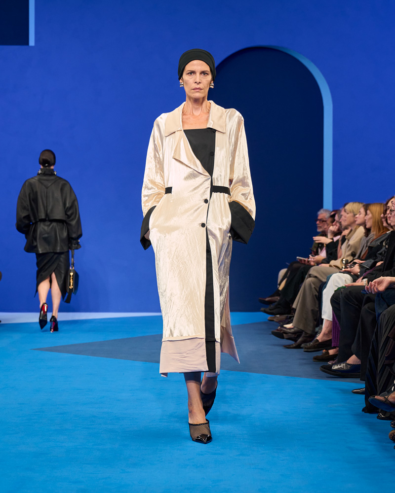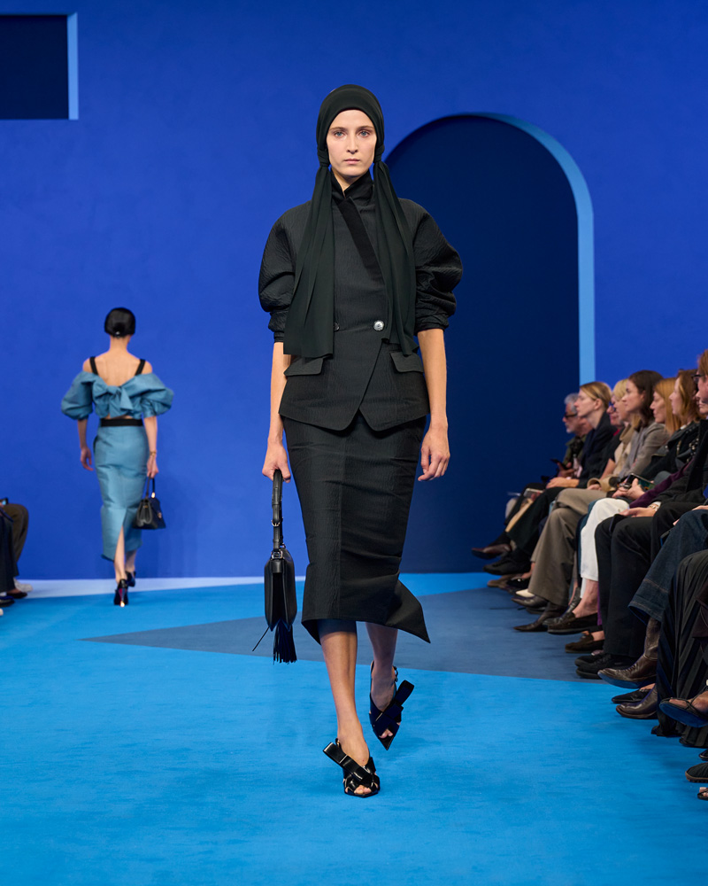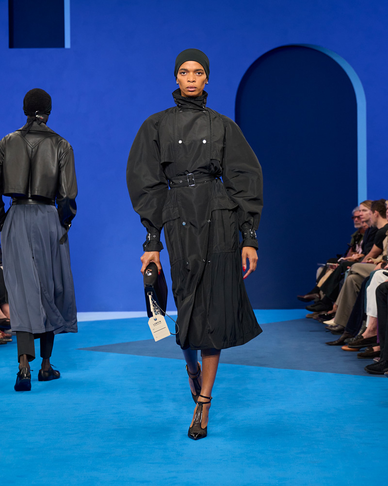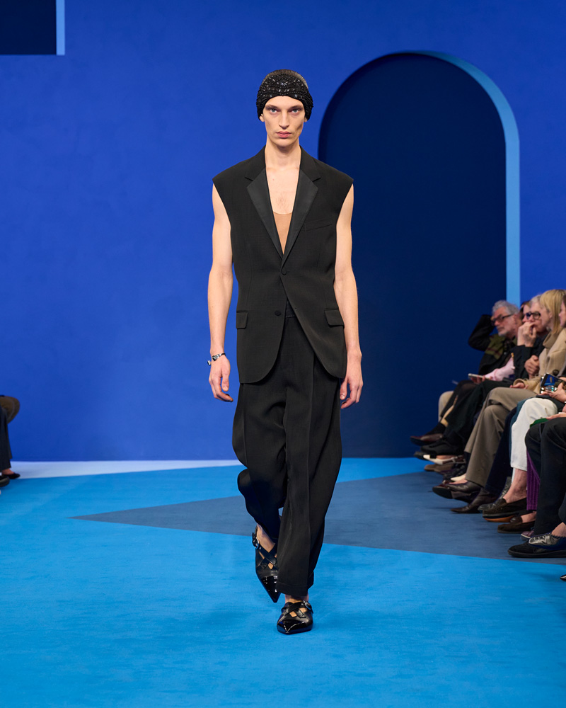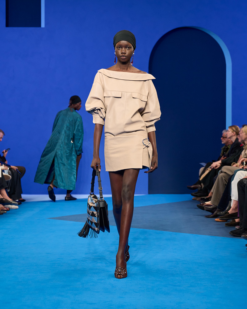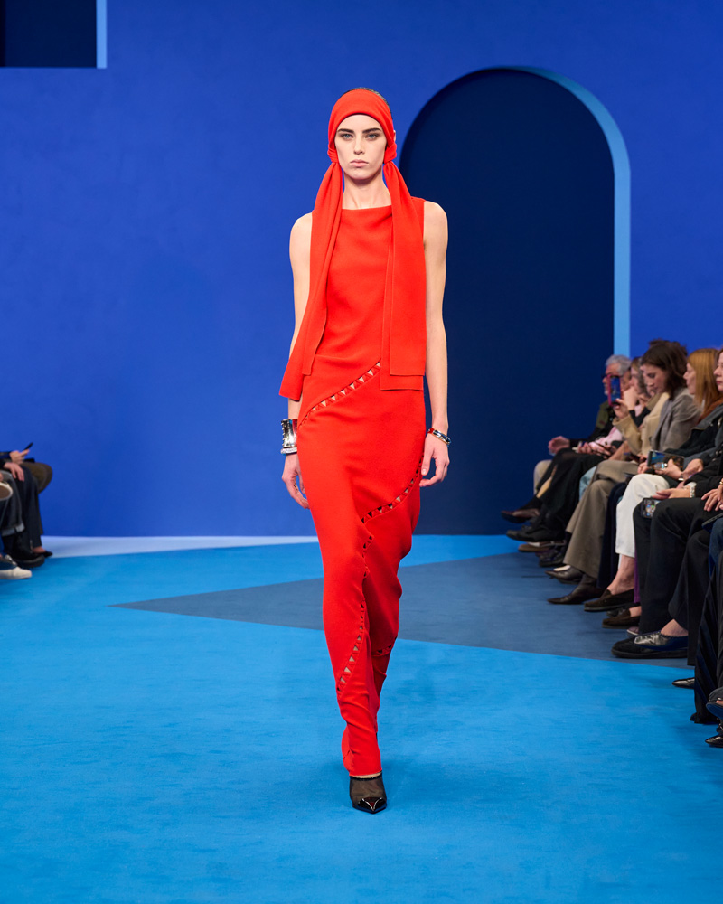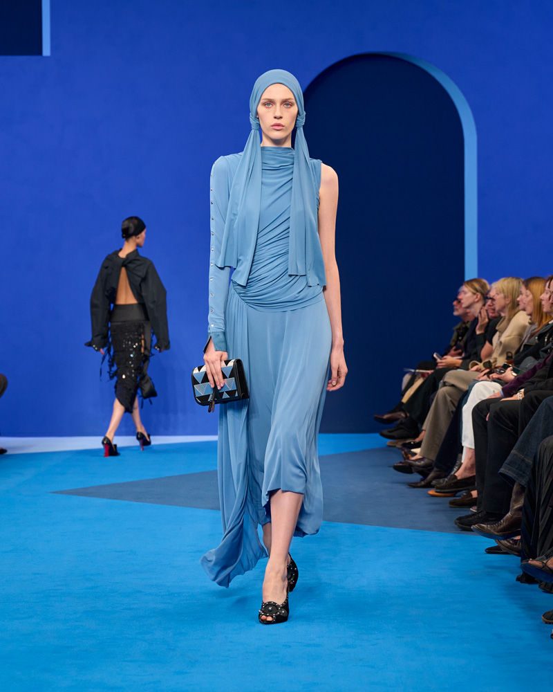 Cheveux retenus par un foulard, mains dans les poches, c’est la mise en mouvement de la modernité et de la sophistication qui animait les pièces imaginées par Jeanne Lanvin que l’on perçoit. La silhouette suivante est taillée dans un tissu noir qui s’évase en franges, autre clin d’œil à cette époque où le jazz fait danser Paris. De son côté, c’est un remix du titre Fade to Grey du groupe new wave britannique Visage qui sert de bande originale au défilé.