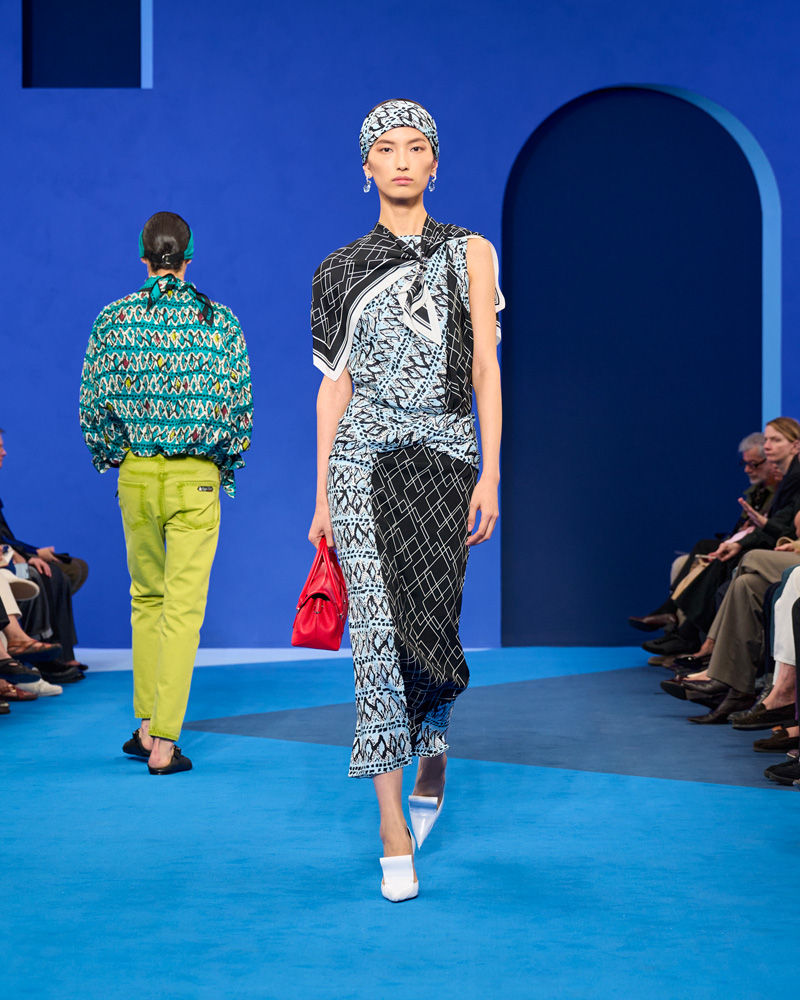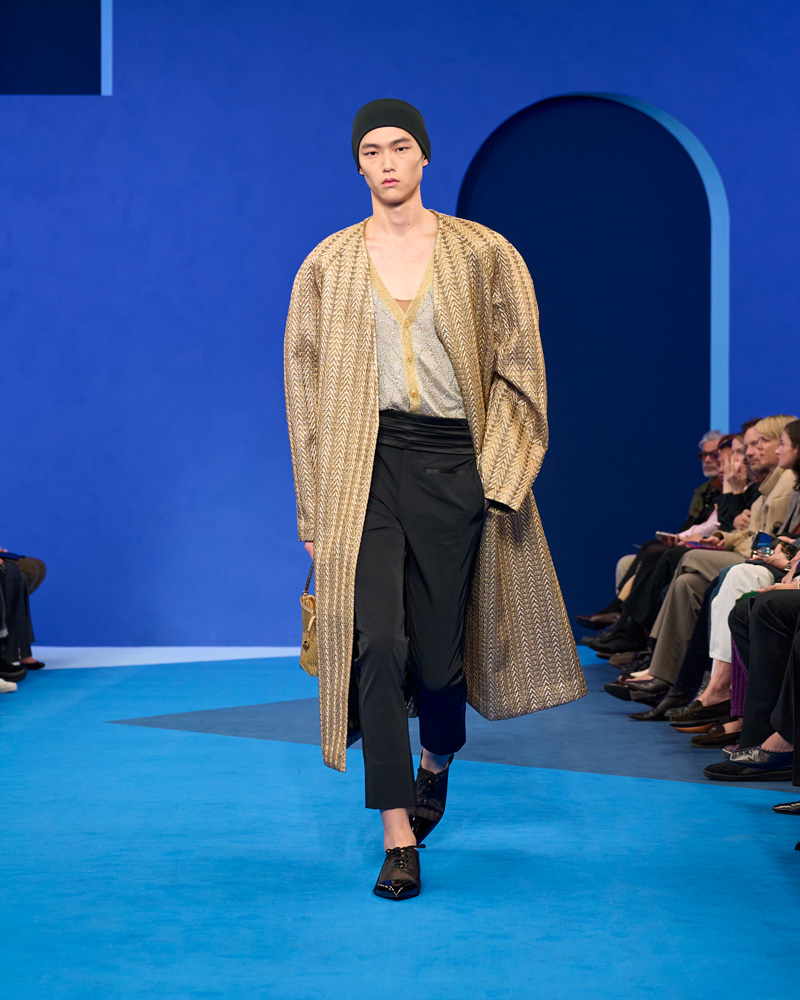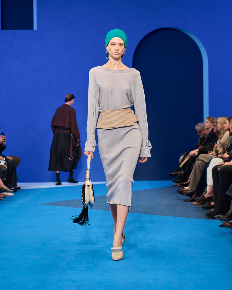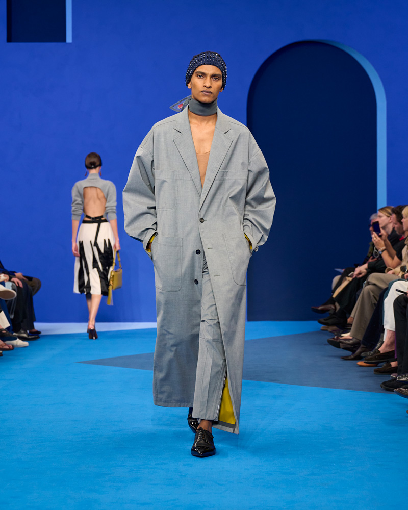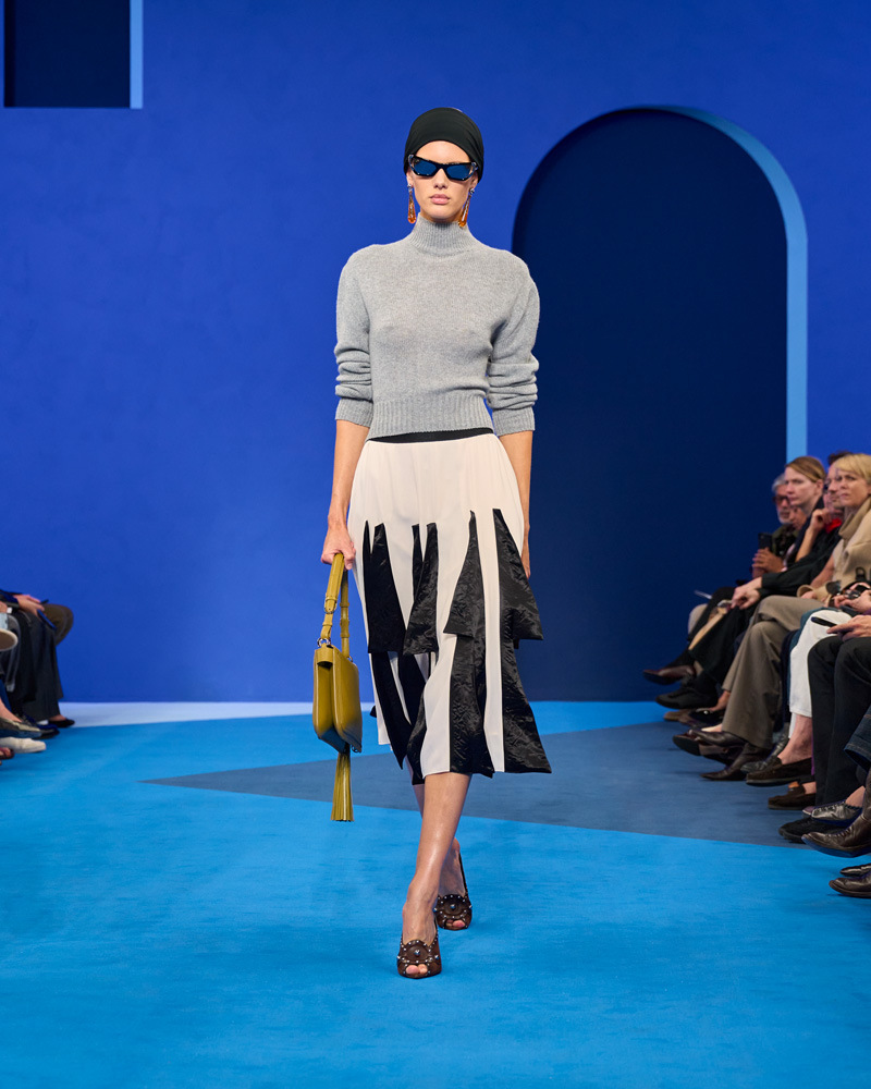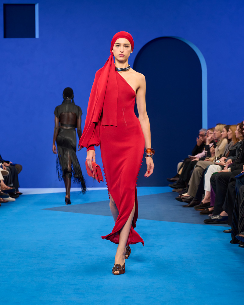 Cheveux retenus par un foulard, mains dans les poches, c’est la mise en mouvement de la modernité et de la sophistication qui animait les pièces imaginées par Jeanne Lanvin que l’on perçoit. La silhouette suivante est taillée dans un tissu noir qui s’évase en franges, autre clin d’œil à cette époque où le jazz fait danser Paris. De son côté, c’est un remix du titre Fade to Grey du groupe new wave britannique Visage qui sert de bande originale au défilé.